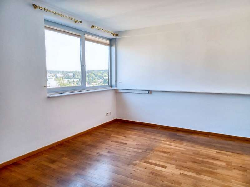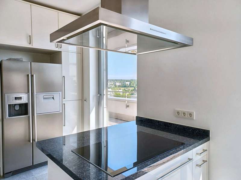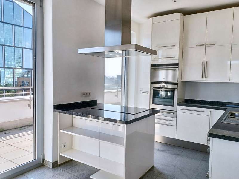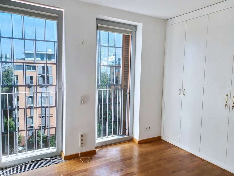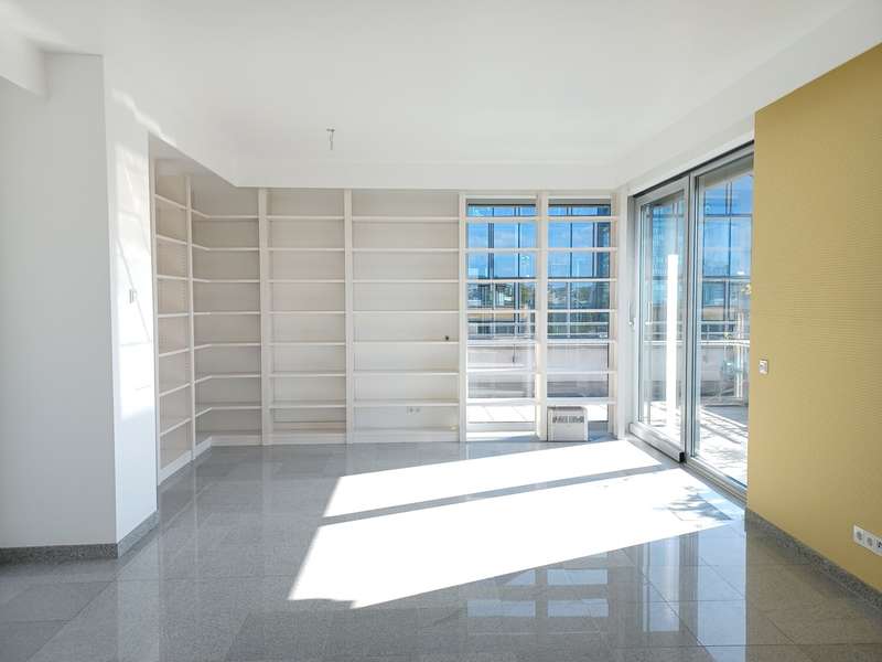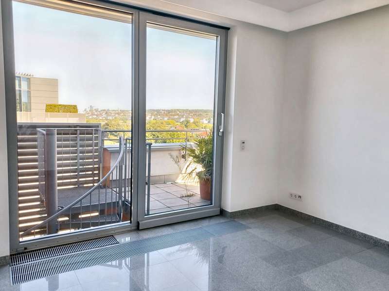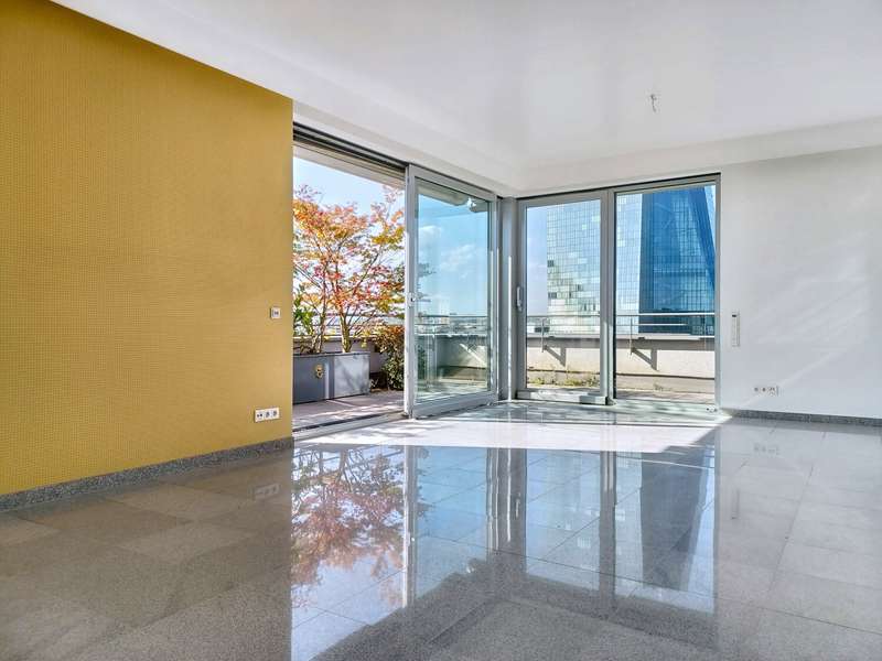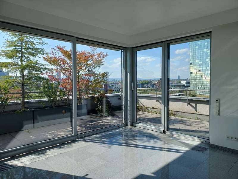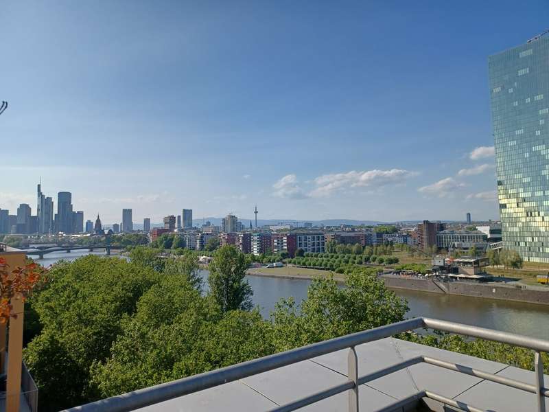 The maisonette-style penthouse is located directly on the banks of the Main and offers a fantastic panoramic view of the Frankfurt skyline, the Main, the Taunus, the Odenwald and the ECB opposite from the impressive, wrap-around terrace on the 8th floor. A special feature is the apartment's own elevator, which conveniently connects the two residential levels on the 7th and 8th floors. The penthouse is wheelchair accessible. The lower level, the 7th floor, has real wood parquet flooring. The rooms have floor-to-ceiling window fronts with sliding shutters. The separate master area has a large bedroom, a fully fitted dressing room and a spacious daylight bathroom. This private area is equipped with air conditioning and has access to a small outdoor area with an external staircase to the upper floor. A further room with custom-made fittings is ideal as a study or guest room. A guest shower room is also available. An elevator takes you from the entrance hall to the upper floor. The 8th floor has granite flooring. Here you will find the spacious kitchen with a central kitchen unit and Siemens appliances including a side-by-side fridge-freezer. The kitchen has two terrace accesses via floor-to-ceiling French doors. A further room with terrace access offers a variety of uses. A shower room is also located on this living level. The approx. 60 m² living room has floor-to-ceiling corner window fronts and several entrances to the magnificent terrace, which offers a breathtaking panoramic view of the Main, the skyline, the Taunus and the Odenwald as well as the ECB opposite. The terrace is illuminated and equipped with radiant heaters and a sun awning. It also has a water connection. Two comfortable underground parking spaces belong to the apartment and can be rented for can be rented for an additional € 100 per month.