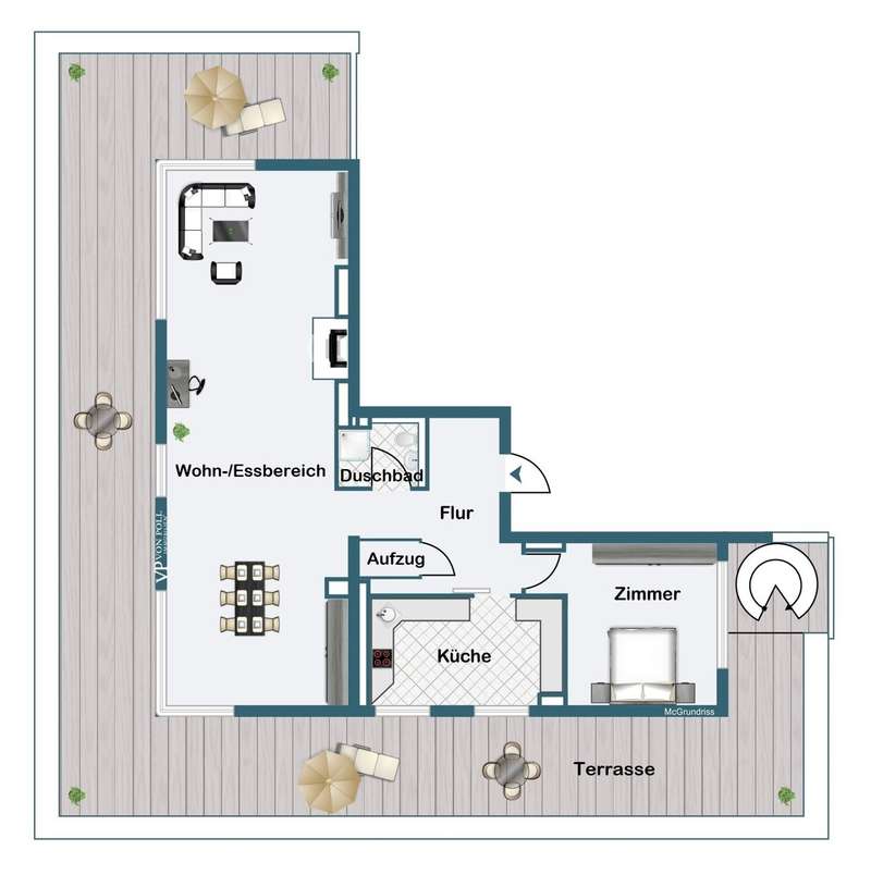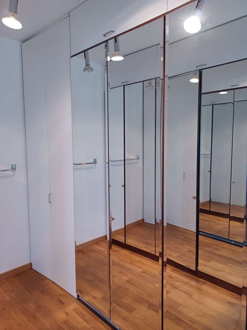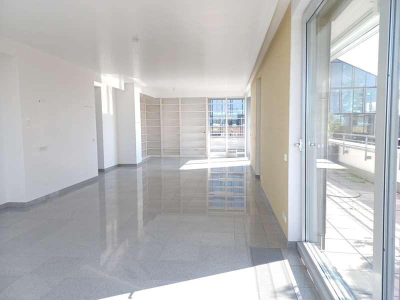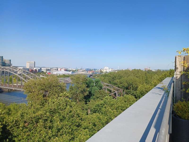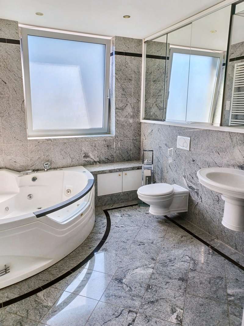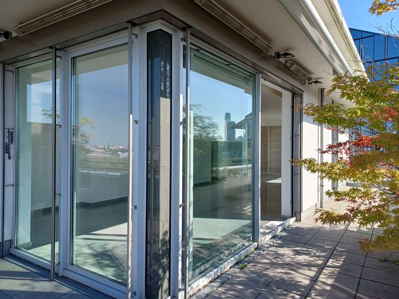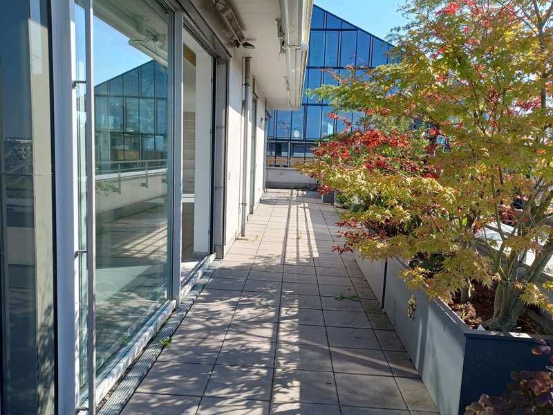 The maisonette-style penthouse is located directly on the banks of the Main and offers a fantastic panoramic view of the Frankfurt skyline, the Main, the Taunus, the Odenwald and the ECB opposite from the impressive, wrap-around terrace on the 8th floor. A special feature is the apartment's own elevator, which conveniently connects the two residential levels on the 7th and 8th floors. The penthouse is wheelchair accessible. The lower level, the 7th floor, has real wood parquet flooring. The rooms have floor-to-ceiling window fronts with sliding shutters. The separate master area has a large bedroom, a fully fitted dressing room and a spacious daylight bathroom. This private area is equipped with air conditioning and has access to a small outdoor area with an external staircase to the upper floor. A further room with custom-made fittings is ideal as a study or guest room. A guest shower room is also available. An elevator takes you from the entrance hall to the upper floor. The 8th floor has granite flooring. Here you will find the spacious kitchen with a central kitchen unit and Siemens appliances including a side-by-side fridge-freezer. The kitchen has two terrace accesses via floor-to-ceiling French doors. A further room with terrace access offers a variety of uses. A shower room is also located on this living level. The approx. 60 m² living room has floor-to-ceiling corner window fronts and several entrances to the magnificent terrace, which offers a breathtaking panoramic view of the Main, the skyline, the Taunus and the Odenwald as well as the ECB opposite. The terrace is illuminated and equipped with radiant heaters and a sun awning. It also has a water connection. Two comfortable underground parking spaces belong to the apartment and can be rented for can be rented for an additional € 100 per month.