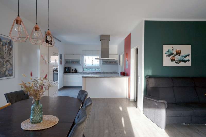 This detached single-family home is situated in a quiet and family-friendly residential area on a plot of approx. 581 m². This property, which was built in 2016, is characterized by plenty of natural light from the floor-to-ceiling windows. Equipped with various extras, this house offers a very special quality of life on approx. 179 m² of living space. First floor: - Hallway - Open-plan living/dining and cooking area - a spacious study or guest room - a utility room - a small storage room, which can also be used as a checkroom - a guest bathroom with shower Upper floor: - hallway - Two spacious bedrooms - a master bedroom with access to the balcony, the dressing room and the loft - a family bathroom equipped with a bathtub and a walk-in shower The south-facing garden offers sun all day long, so nothing stands in the way of preparations for the next barbecue party. Another highlight is the large driveway leading to the double garage with storage room.