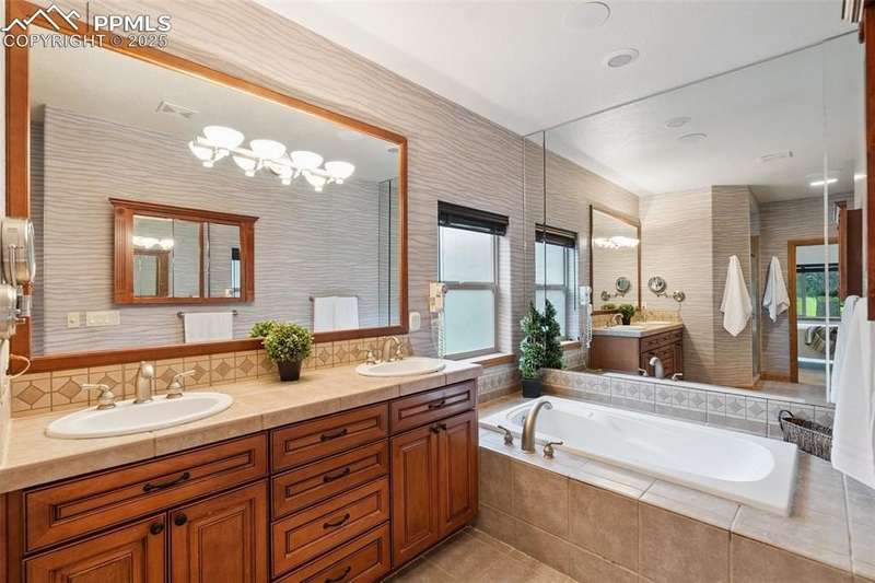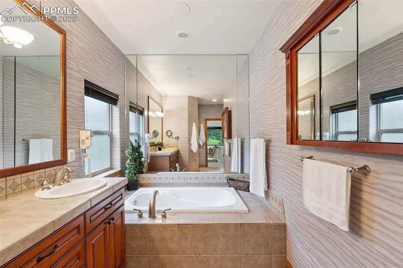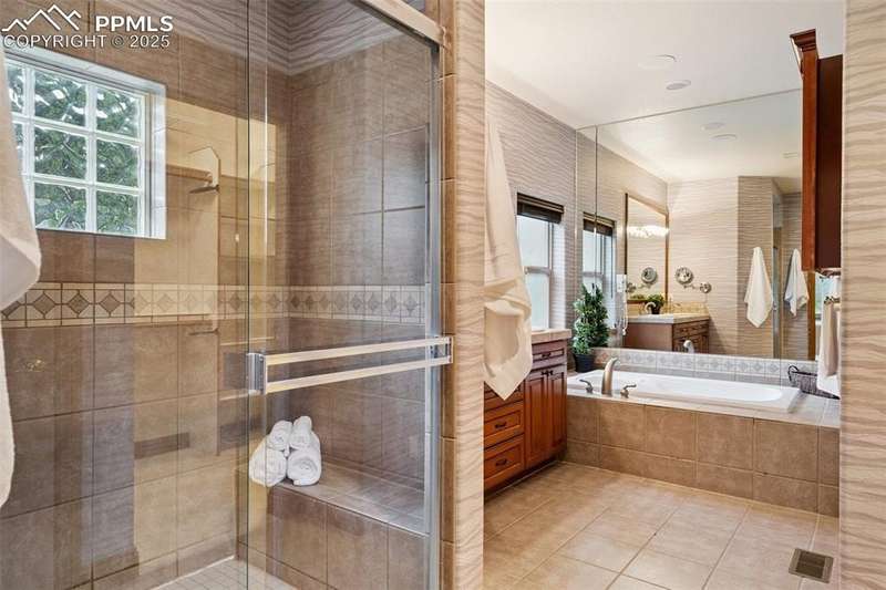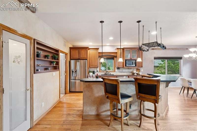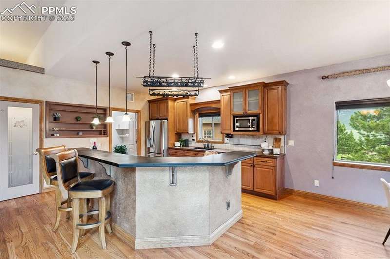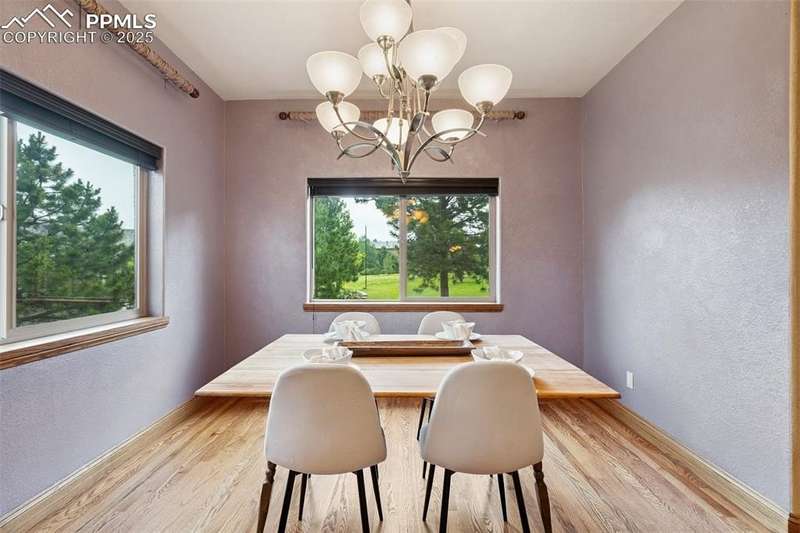 Nestled in the trees of the coveted High Pines neighborhood in Monument, this beautifully maintained patio home offers true main level living, a thoughtful floor plan, and the comfort of low maintenance living. With snow removal, lawn care, trash service handled by the HOA, this is the ultimate lock-and-leave lifestyle you have been waiting for. From the moment you walk in, you are welcomed by soaring ceilings, hardwood flooring, large picture windows, and a peaceful setting with views of Bald Mountain. There are zero steps from the front and garage doors, making entry into this home seamless and accessible. The great room, anchored by a cozy gas fireplace, flows into the gourmet kitchen featuring solid surface countertops, natural wood cabinetry, and a spacious island that is perfect for gathering. A walk-out from the living room through a sliding glass door leads to your private composite deck, ideal for morning coffee or an evening glass of wine among the trees. This ranch style home offers two bedrooms on the main level, including a spacious primary suite with a spa-like five piece bath, jetted tub, and walk-in closet. The primary suite also features a private door leading directly to the patio, perfect for quiet mornings or relaxing evenings outside. Head downstairs to discover a generous family room with a second gas fireplace, a wet bar, and two additional bedrooms, each with walk-in closets and one with a shared en suite bath. There is even extra storage and flex space for hobbies, guests, or gym equipment. Located just minutes from I-25, commuting to Denver or Colorado Springs is a breeze. Thoughtfully updated and lovingly cared for by its owners, this home is ready for you. This is Monument living at its best: in the trees, mountain views, and room for everyone. Schedule your private showing, today. Welcome Home