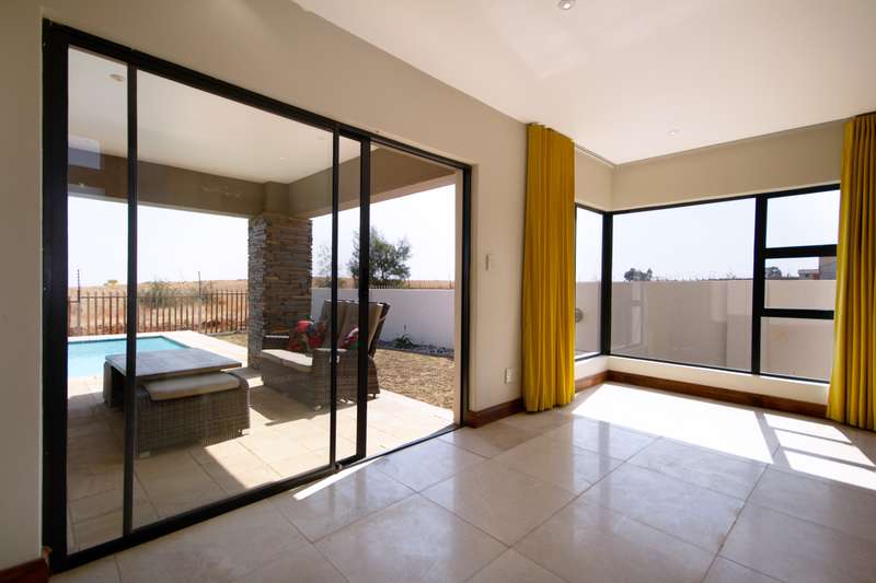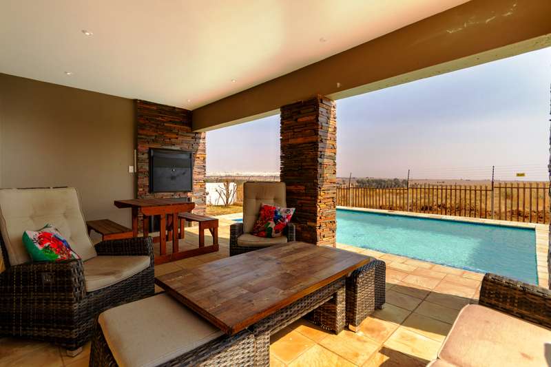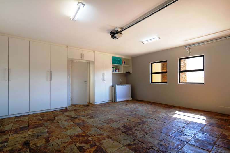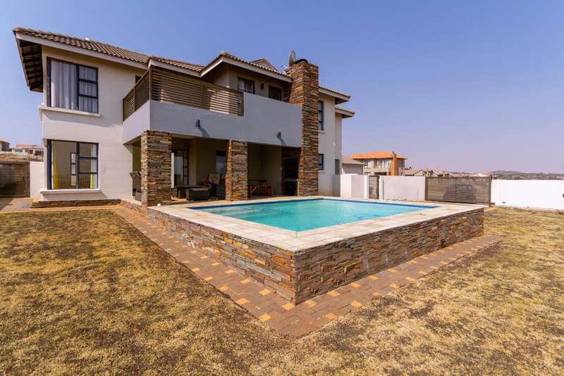 A MASTERPIECE OF MODERN LUXURY – DESIGNER HOME BORDERING A GAME RESERVE Welcome to a rare offering where architecture meets nature and every detail whispers sophistication. Nestled within a highly sought-after, pet-friendly estate with 24-hour access-controlled security, this ultra-modern, 5-bedroom luxury residence redefines contemporary living – and it's proudly set on the edge of a tranquil Game Reserve, offering uninterrupted views and the soothing sounds of wildlife as your daily backdrop. Step through the imposing double-volume glass doors into a world of light, openness, and calm. The expansive entrance instantly sets the tone with an abundance of natural light cascading through large windows, illuminating the open-plan living spaces that seamlessly blend modern elegance with everyday comfort. An Entertainer’s Dream – Indoors and Out. The open-plan ground floor flows effortlessly, leading to a double entertainers' patio via sliding glass doors, creating a fluid connection between the stylish interiors and the serene outdoor environment. The covered patio overlooks a sparkling, crystal-clear pool and manicured garden – a private sanctuary perfect for alfresco dining, family gatherings, or simply unwinding. A striking Rocla Graffiti fireplace with stone-clad backing warms the stylish lounge with its marble flooring adding ambiance and architectural texture. Just off the central stairwell, a tastefully appointed guest cloakroom adds convenience and discretion. At the heart of the home is a state-of-the-art gourmet kitchen – a culinary enthusiast’s dream featuring: • Custom-designed cabinetry and granite stone wall cladding • Built-in coffee station and integrated fridge/freezer • Dual-function gas & induction hob, extractor fan • Double eye-level oven with warming drawer • Fitted dishwasher and soft-close drawers throughout The double automated garage offers direct access into the home and is a functional space with built-in cupboards and slate tiled flooring, making organization a breeze. Upstairs – A Private Retreat Ascend the feature staircase to discover five generously sized bedrooms, all fitted with mirror sliding built-in cupboards and porcelain tiled floors. Two of the bedrooms open onto private balconies with panoramic views of the lush Game Reserve – a constant reminder that you're living on the edge of something extraordinary. The master suite boasts a full en-suite bathroom with luxurious finishes, including: • A freestanding oval bathtub • Designer vanity • Frameless glass shower • LED-lit mirrors, soft-close toilet seats, and shaver sockets A spacious pajama lounge with its own balcony offers a perfect escape for movie nights or family downtime, while a dedicated study provides a quiet space for work or learning. Versatility Meets Functionality The home also includes a private guest suite or staff quarters, tucked away in the enclosed courtyard. This self-contained room includes a bathroom with a shower, basin, and toilet – ideal for live-in help, extended family, or visiting guests. Premium Features Throughout: • Solid Kiaat wood skirting boards and doors with architraves • Frosted glass doors to bathrooms and balconies • Wave track curtain rails and modern downlighting • High-end, bespoke finishes from top to bottom This isn’t just a home – it’s a lifestyle destination. Whether you're entertaining, relaxing, or working, every inch of this home has been carefully curated for a discerning buyer who demands the very best. Live your best life in style, security, and serenity. Contact us today to arrange a private viewing and secure this remarkable residence as your new address.