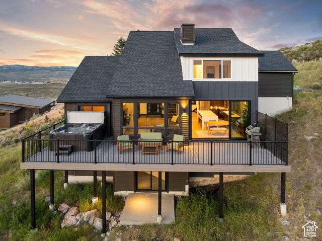 Welcome to 6387 Silver Sage Dr., a fully remodeled five-bedroom Park City retreat showcasing incredible views and a rare opportunity for nightly rental income. Offered fully furnished and turnkey, with future bookings already in place, this 3,490 sq ft property sits on over an acre of land and is one of the few single-family homes in the Park City school district with a nightly rental license, offering exceptional flexibility for investors, second-home owners, and primary residents. The open-concept layout and vaulted ceilings fill the home with natural light and frame panoramic views of the Park City and Canyons ski resorts, Utah Olympic Park, and the 1,200+ acre Swaner Preserve. The chef's kitchen includes a 27 sq ft eat-in island, gas range with pot filler, and walk-in pantry, while the spacious great room opens through an oversized double sliding door to a large Trex deck with a hot tub, creating an inviting space for entertaining or relaxing after a day in the mountains while overlooking the Park City valley and enjoying some of the area's most spectacular sunsets. The primary suite features vaulted ceilings, a gas fireplace, and a spa-like ensuite, and allows you to start your day with the same perfectly framed panoramic views. The lower level offers a second living room with a wet bar and walk-out access to the expansive lot, providing endless possibilities for outdoor living, recreation, or future enhancements. With a proven long-term rental history of $12,000 per month and strong short-term rental potential, this property offers an exceptional opportunity to enjoy the Park City lifestyle while generating impressive income. Perfectly positioned for growth leading up to the 2034 Salt Lake City Olympics, 6387 Silver Sage blends modern comfort, investment performance, and mountain serenity in one of Park City's most desirable locations.
