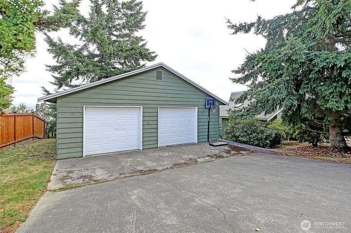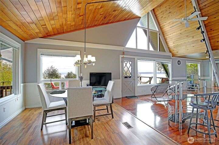 Charming and updated A-frame cabin with soaring vaulted ceilings and an open-concept layout. Enjoy 96 feet of private waterfront and tideland, with a nearby boat launch just minutes away—perfect for fishing and crabbing. A detached two-car garage features a studio with flex space, plus extra storage and guest parking. Every room offers stunning views of the Sound and mountains, creating a peaceful retreat. With a strong vacation rental history, this is an ideal weekend getaway, investment, or full-time island home. Desirable north end location close to shopping, dining, amenities, and I-5 access.
