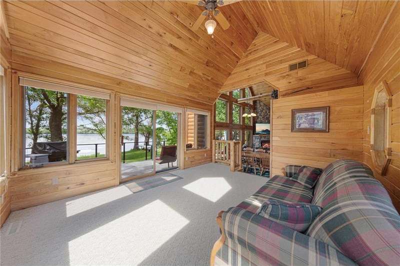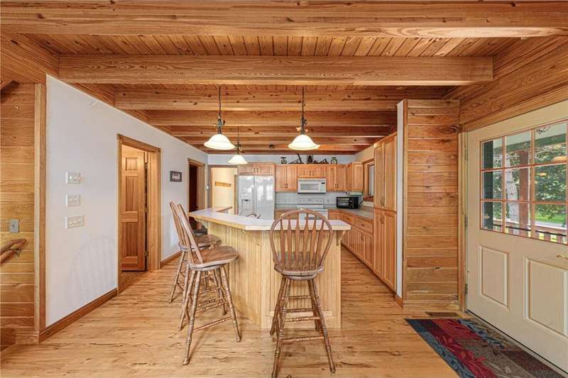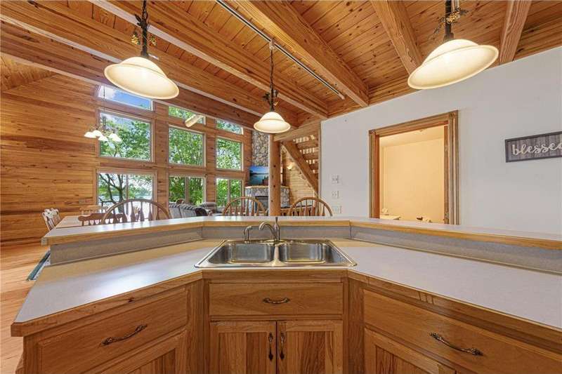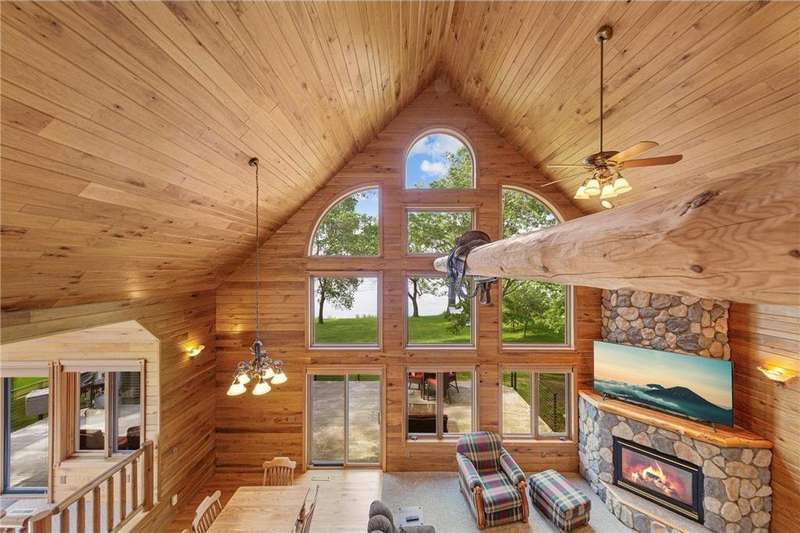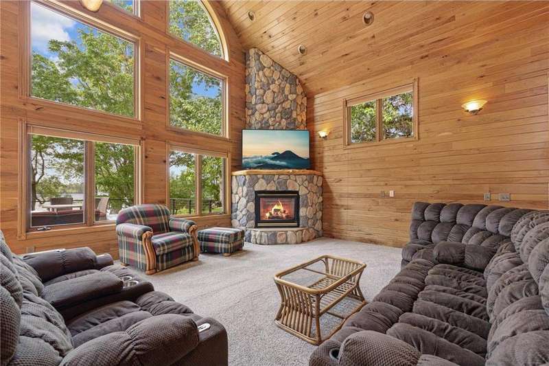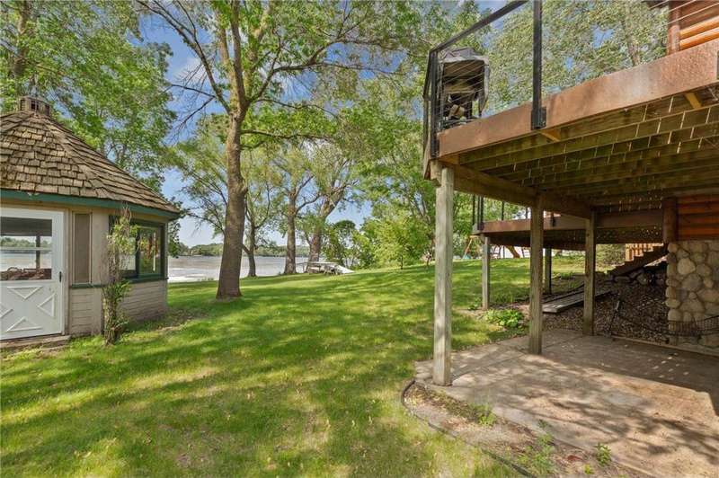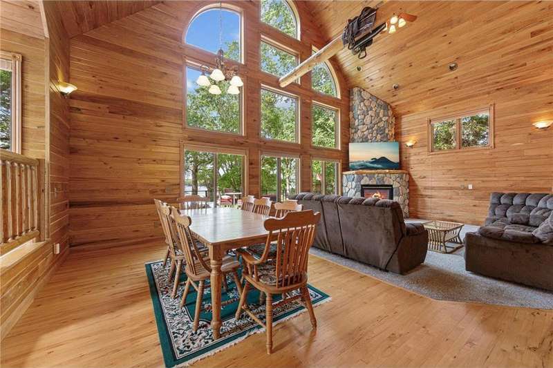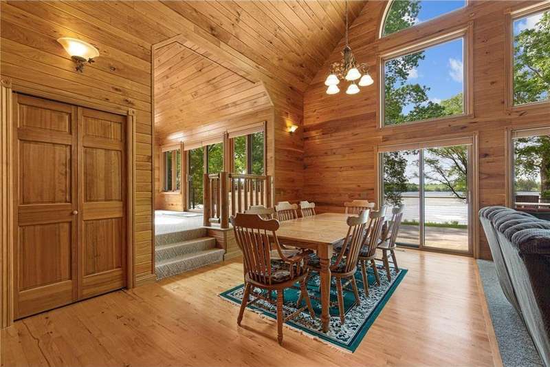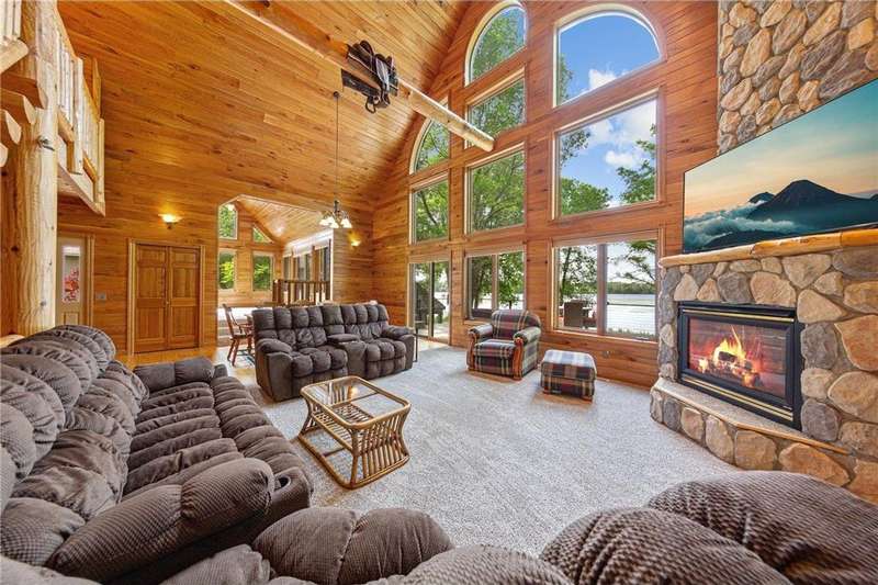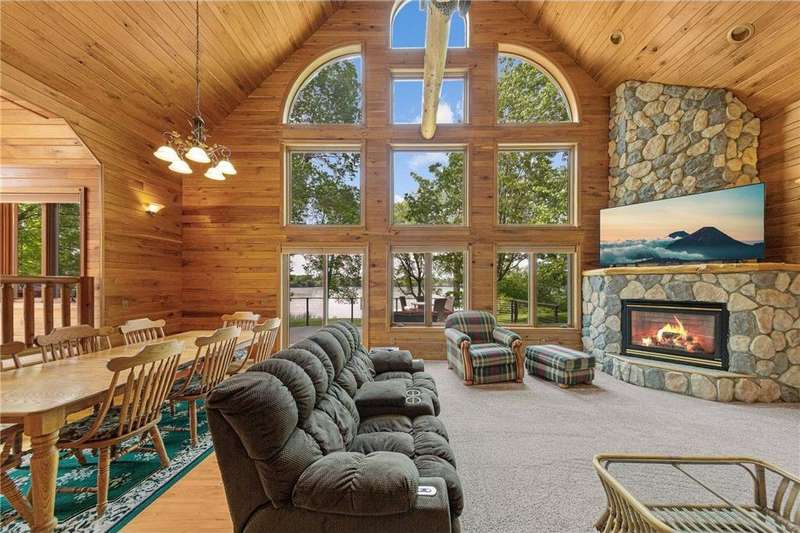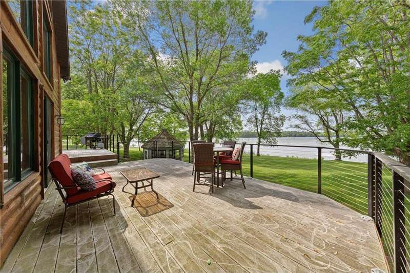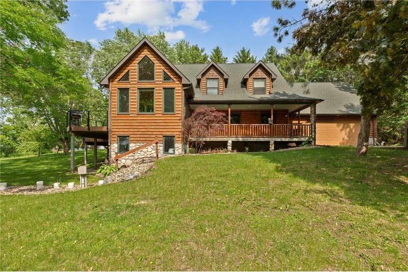 With picturesque views, this grand log cabin home offers the perfect blend of rustic charm and modern comfort! Nestled on the serene shores of Cannon Lake surrounded by towering pines and lush greenery, the home boast expansive windows that provide breathtaking views of the water and flood the interior with natural light! Crafted from rich hand sawn logs, the home features a spacious open floor plan with vaulted ceilings, a stone fireplace, and exposed wooden beams that add warmth and character. The kitchen is fully equipped with an island making it ideal for both quiet family meals and entertaining guest. Step outside onto the oversized deck to enjoy morning coffee with the sounds of nature, or host gatherings that spill out into the beautiful backyard. Just steps from the house a charming wooden gazebo sits nestled among the trees- perfect for lazy afternoons, outdoor dining, or evening stargazing by the water! With direct lake access for boating, fishing, or simply relaxing on the private dock, this property is a peaceful retreat that captures the essence of lakeside living. And we can't forget the potential of the partially finished basement. With separate auxiliary heat in the basement and garage floors, one can only enhance the comforts of this stunning home! Don't miss out on seeing this one up close!