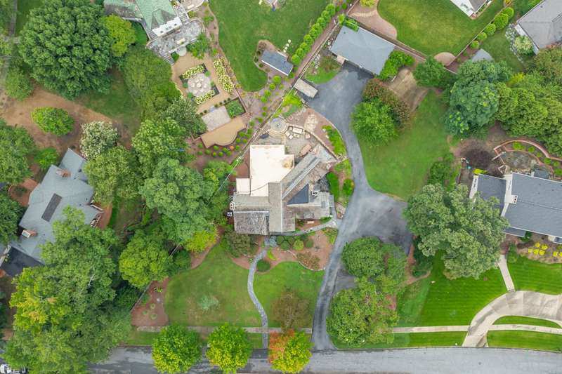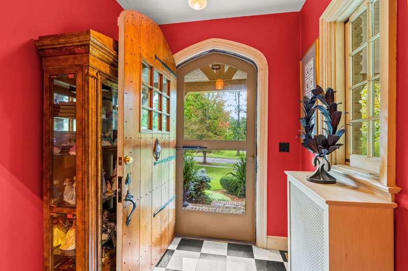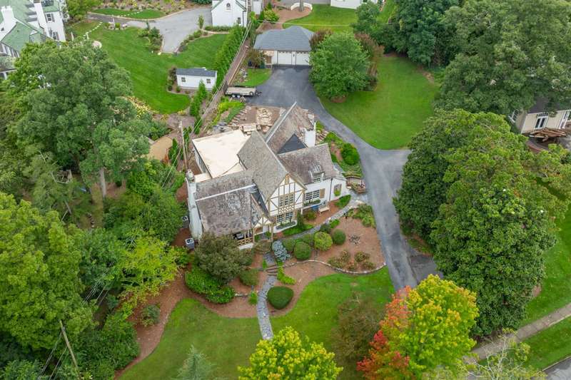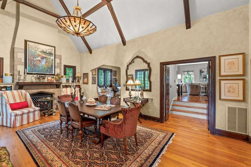 An English Tudor with stunning architectural features. Including arched doorways, exposed wood beams and a prominent stone fireplace in the large open living room. A storybook foyer with marble floor entering into a very versatile floor plan with lots of living space including a piano nook overlooking the living room that could be used as an office. As well as a sitting room nestled in the main level ensuite bedroom. The oversized family room has built-ins, wormy maple hardwoods and a wet bar closet all leading to a large stone patio with a water feature. Property includes three lots appointed with stone walls, slate walk-ways, gorgeous landscaping and a concrete pad with a basketball goal. The detached garage has a much needed storage room! The updated covered porch is like a vacation getaway right at home perfect for watching the sunrise. The kitchen is large enough for any size gathering and includes a Thermador six burner gas stove and double ovens.