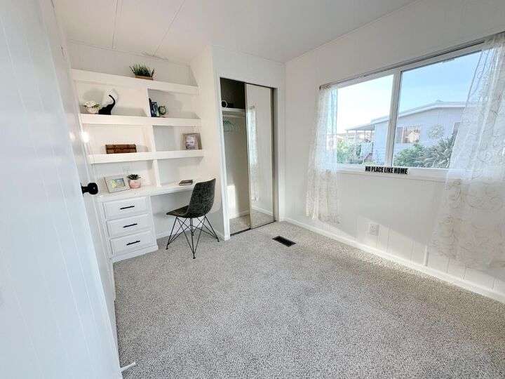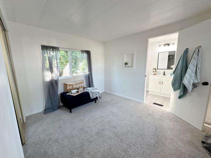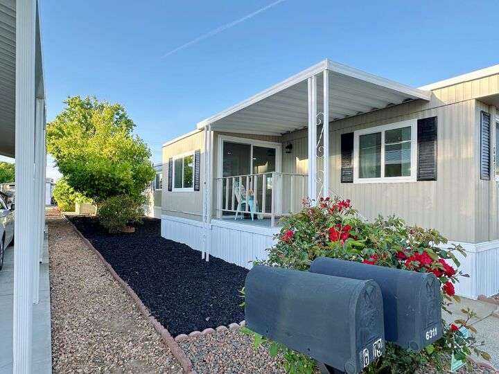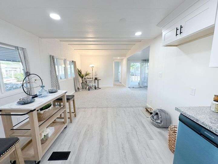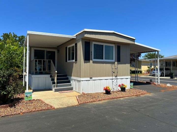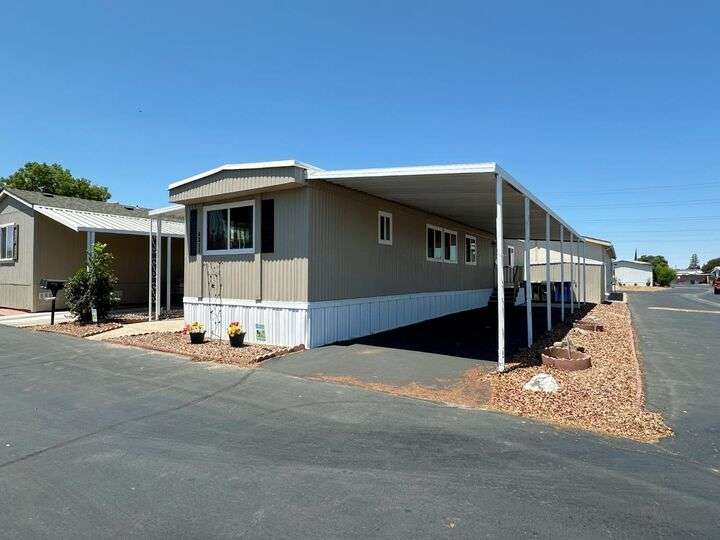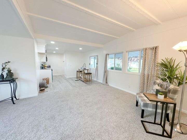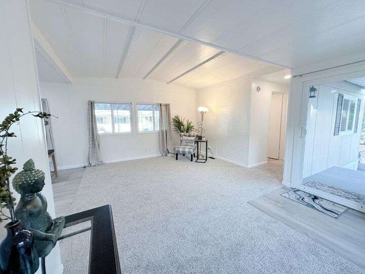 Welcome to this beautifully updated 2-bed, 2-bath home in the all-age, gated community of Capital Estates, full of charm & amenities! This beautifully remodeled home features fresh interior/exterior paint, new dual-pane windows & slider, new skirting, luxury vinyl plank flooring, new carpet, & recessed LED lighting. The spacious living room offers vaulted ceilings with accent beams. The dream kitchen showcases granite counters, stainless steel appliances, new cabinets, fixtures, & hardware. A convenient laundry alcove with washer, dryer, & extra storage just off the kitchen. The primary suite includes mirrored closet doors & a spa-like ensuite with a soaker tub. The second bedroom features built-ins, accent lighting, and private bath access. Outside: a covered porch with new indoor/outdoor carpet, low-maintenance landscaping, citrus trees, carport, & storage shed. Community perks include a clubhouse, pool, sports courts, playground, & more. Move-in ready & waiting to welcome you home!