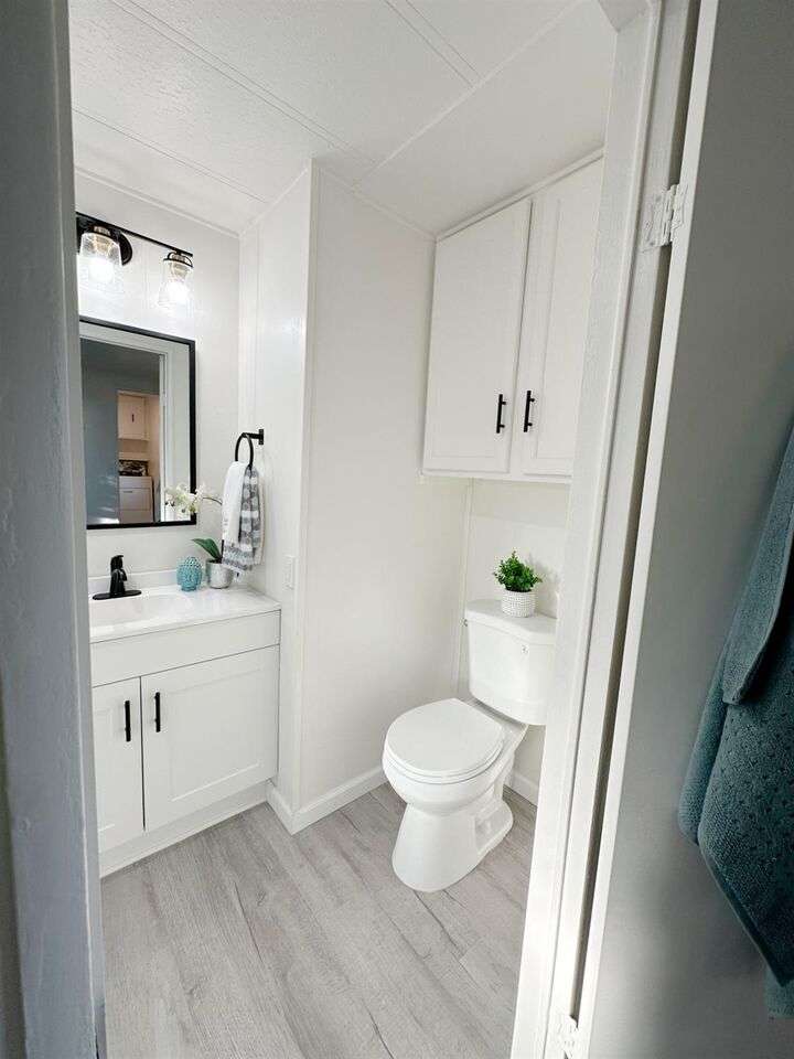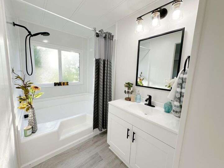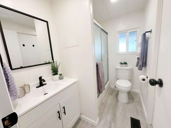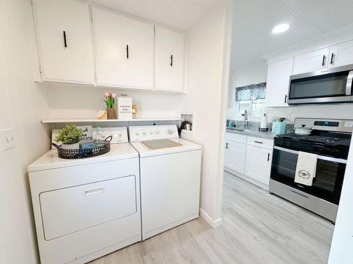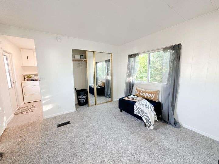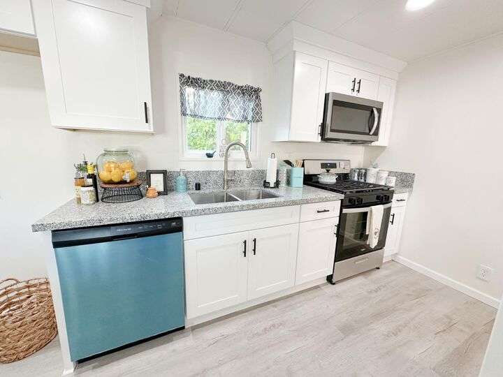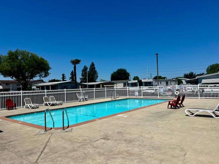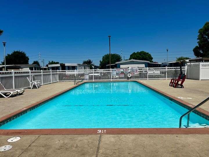 Welcome to this beautifully updated 2-bed, 2-bath home in the all-age, gated community of Capital Estates, full of charm & amenities! This beautifully remodeled home features fresh interior/exterior paint, new dual-pane windows & slider, new skirting, luxury vinyl plank flooring, new carpet, & recessed LED lighting. The spacious living room offers vaulted ceilings with accent beams. The dream kitchen showcases granite counters, stainless steel appliances, new cabinets, fixtures, & hardware. A convenient laundry alcove with washer, dryer, & extra storage just off the kitchen. The primary suite includes mirrored closet doors & a spa-like ensuite with a soaker tub. The second bedroom features built-ins, accent lighting, and private bath access. Outside: a covered porch with new indoor/outdoor carpet, low-maintenance landscaping, citrus trees, carport, & storage shed. Community perks include a clubhouse, pool, sports courts, playground, & more. Move-in ready & waiting to welcome you home!