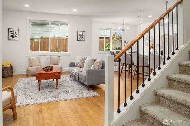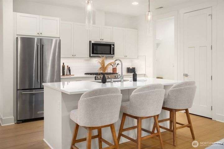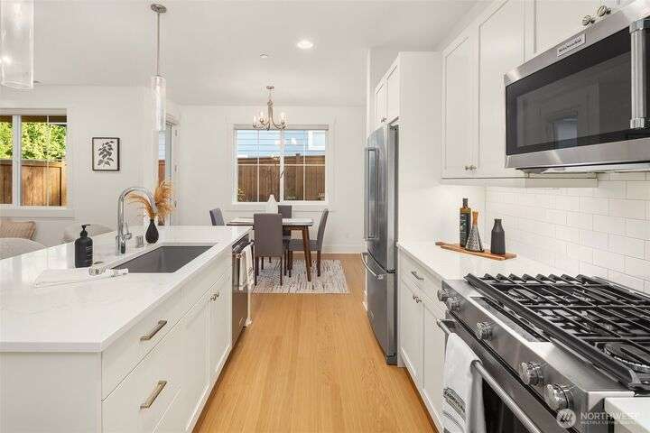 Edmonds 3-bed townhome by Select Homes nestled in the heart of 5-corners & filled w/ natural light. Open-plan main features a contemporary kitchen w/ all SS KitchenAid appliances, misterio quartz countertops & island w/ seating. Sliding doors lead to fully fenced backyard w/ partially covered patio & turf for low-maintenance enjoyment. A/C ensures year-round comfort. Sleek floor-to-ceiling tiled electric fireplace & LVP flooring throughout main level add warmth & modern appeal.3 beds, including spacious Primary Suite w/ dual sinks, a walk-in shower, & WIC. Thoughtful built-ins throughout for style & function. Complete w/ 2-car garage. Ideally located near schools, parks & mins to Bowl’s beaches, boutiques, restaurants & festivals.