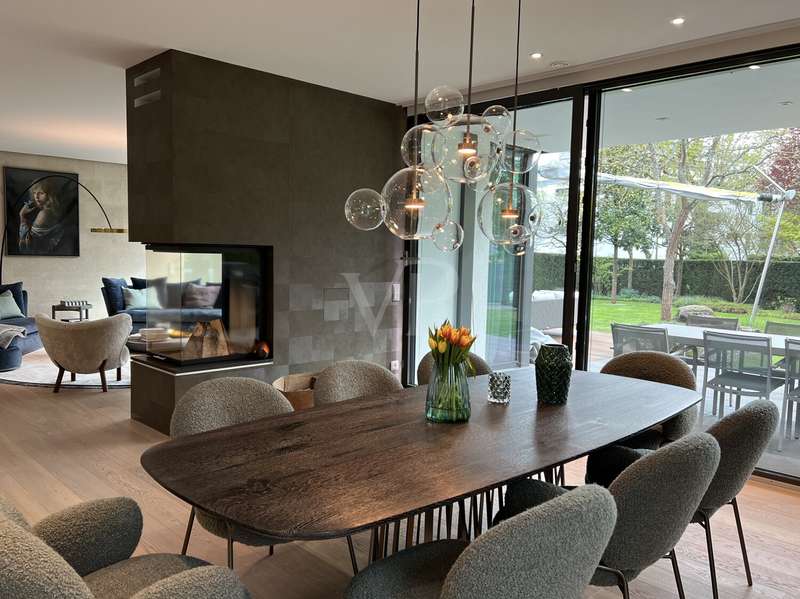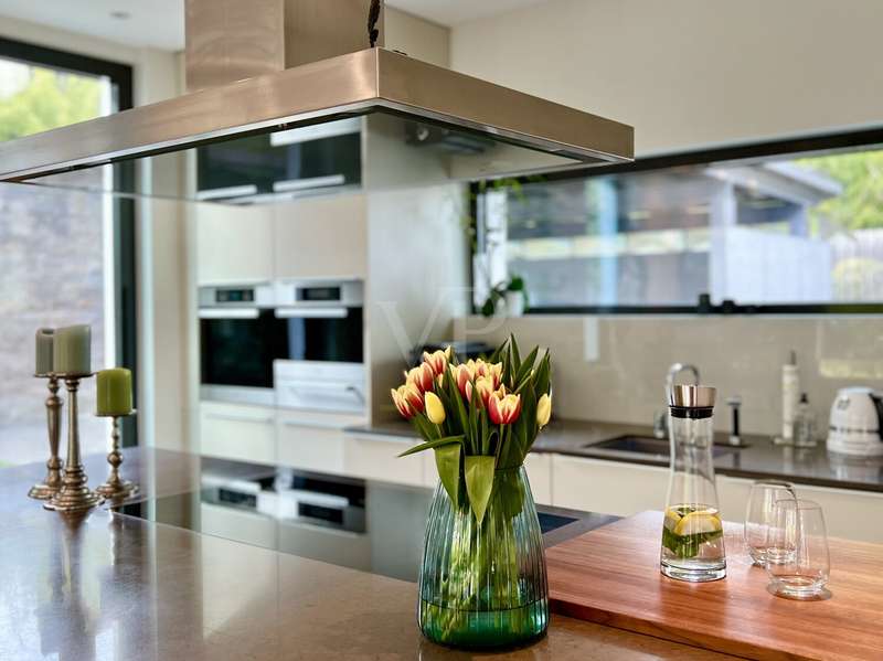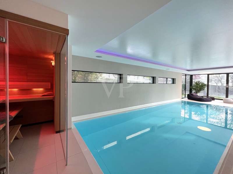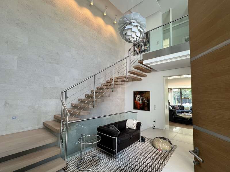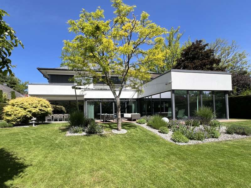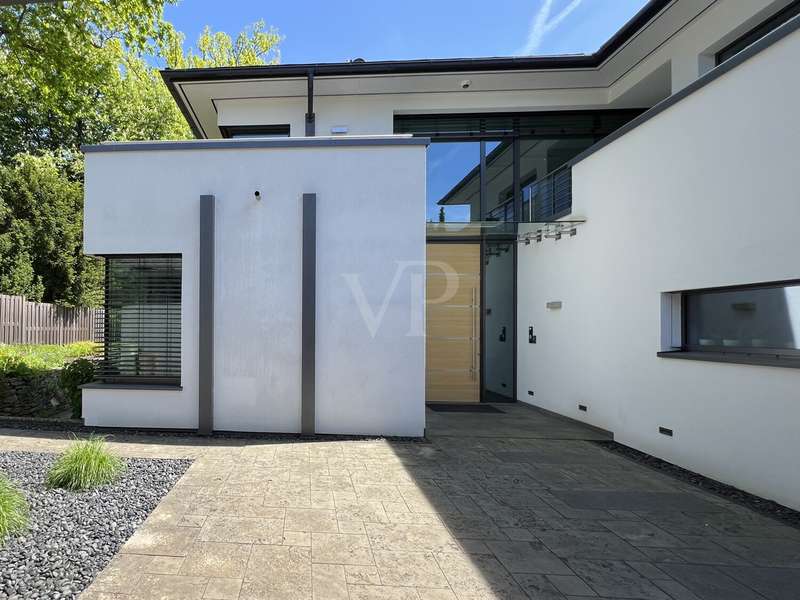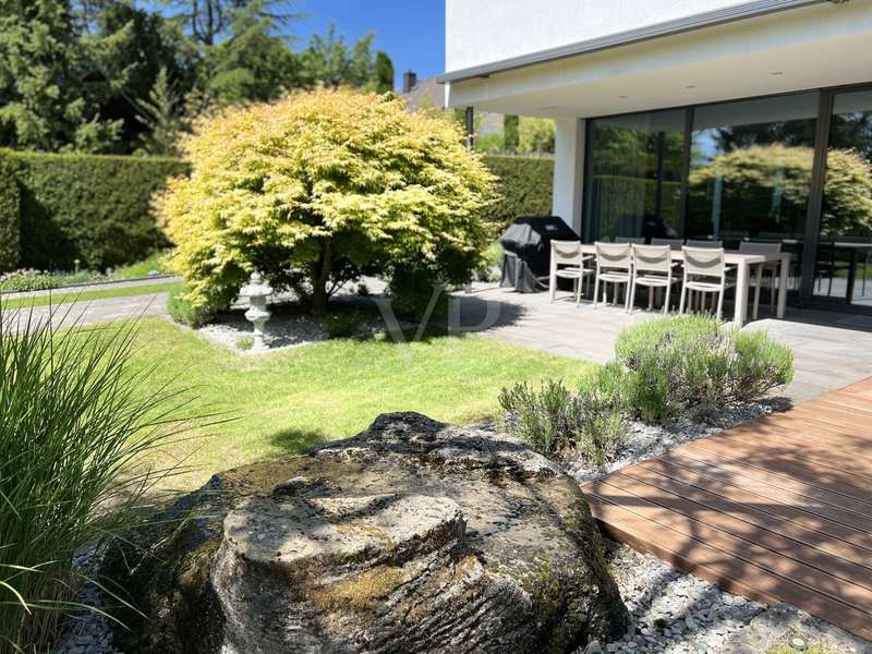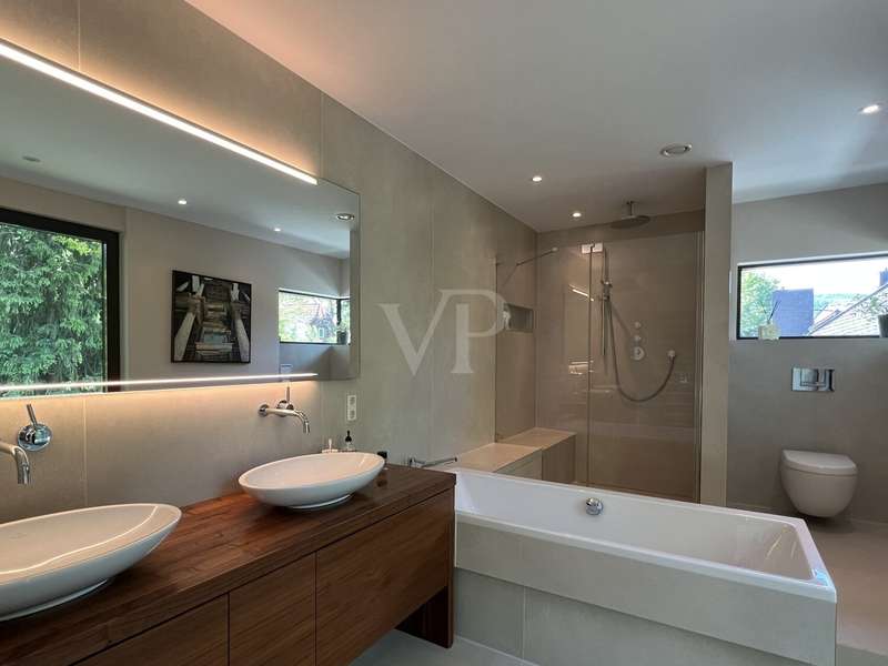 This modern villa with pool, park-like garden and two granny annexes, one on the first floor and one in the basement, is located in a prestigious residential area of Bad Homburg. Enjoy luxurious living in natural surroundings and benefit from a good infrastructure at the same time. The elementary school, a kindergarten and various shopping facilities are just a few minutes' walk away. Thanks to the good connection to the highway, you can reach Frankfurt city center or the airport in approx. 25 minutes. Noble natural materials and state-of-the-art building technology (two heat pumps, photovoltaic, solar, geothermal, energy efficiency A+) form a perfect symbiosis in this impressive luxury villa in mint condition. Look forward to a comfortable home equipped with extraordinary details: oiled solid wood parquet flooring, large-format porcelain stoneware tiles, over-height doors, floor-to-ceiling glass elements and highly polished steel, to name but a few. Used according to the principles of Feng Shui, they create a harmonious atmosphere in all areas. The wall cladding made of hand-carved natural stone, which is set in scene with LED color changes, also contributes to this. To guarantee a high degree of privacy, the entire property is lined with evergreen hedges. A prestigious driveway leads you to the entrance of the house, which faces south-west. You can park your car in the carport right next to the house. There is space for garden tools and bicycles in the carport, which has a full basement. A further outdoor parking space is available. The impressive entrance hall welcomes you with an approx. 6 m high glass front. The staircase to the upper floor, which is set into the wall, appears to be almost floating in front of the illuminated natural stone wall. High-quality carpentry fittings are available for your checkroom. The guest WC is adjacent. The living and dining area with open kitchen and fireplace will become the focal point and meeting place for the family. Here too, ceiling-high built-in cupboards ensure comfort and a clear room design. Floor-to-ceiling window fronts let in light from all sides and offer an incomparable view and floor-level access to the garden. A spring stone in front of the terrace and the park-like design with selected specimen trees invite you to spend time outdoors. The elegant kitchen is connected to the dining area by a kitchen island. To the side, the extended kitchen offers even more storage space and appliances. The entrance hall leads to the library/study and the granny annexe. This can be used as a guest area/home office with separate access, hallway and WC. An exceptionally luxurious spa area is adjacent: Indoor swimming pool with LED lighting and dynamic color changes, counter-current system, bubble function in the middle of the pool, massage jets, built-in speakers, sauna, steam shower with brine system and a floating tank in the adjoining bathroom. On the upper floor, on a gallery, there are 3 rooms (children/study) off a corridor, a spacious, elegant bathroom with shower and a separate WC. The wrap-around balcony with large roof terrace can be accessed from every room. The parents' area is divided into a dressing room, bedroom and en-suite bathroom. The basement has been converted into a living space with a second granny annexe (approx. 80m² and separate entrance). This includes a spacious bedroom, a daylight shower room, a pantry and a living area which is used as a home cinema. Further rooms for fitness, wine cellar, housekeeping, technology and storage complete the space on offer. A comfortably converted attic studio is available for further use. Get to know your new home soon! Please provide proof of creditworthiness before viewing.