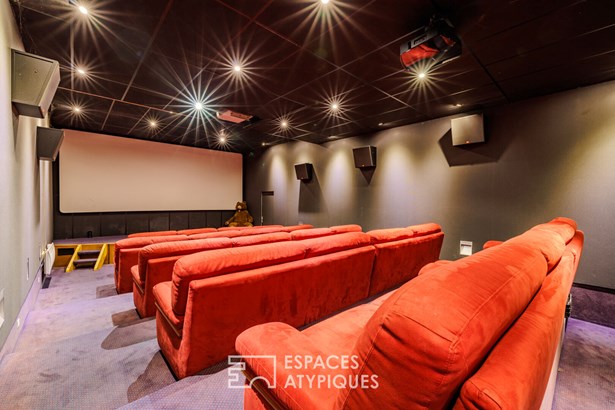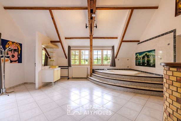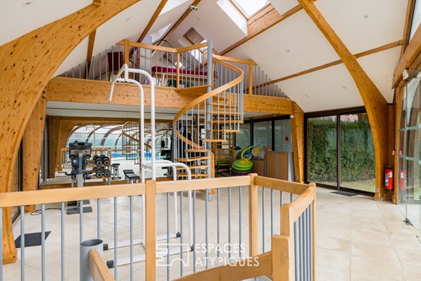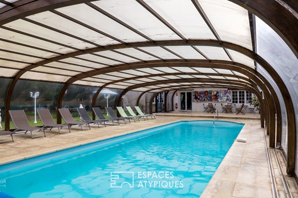 The living spaces in the shared house are arranged around a vast 80 sqm living room with an open fireplace, a fitted and equipped kitchen, numerous games rooms, and direct access to a veritable relaxation area comprising an indoor (heated) swimming pool, a gym with sauna, a mezzanine wellness area, and basement bathrooms.