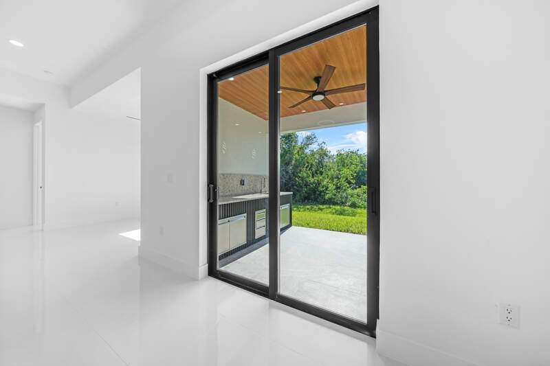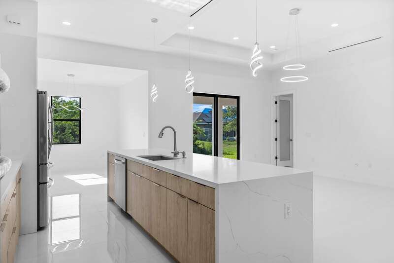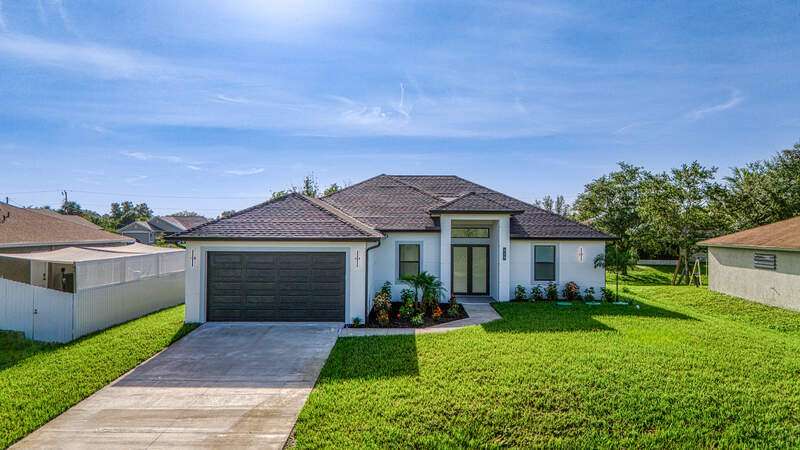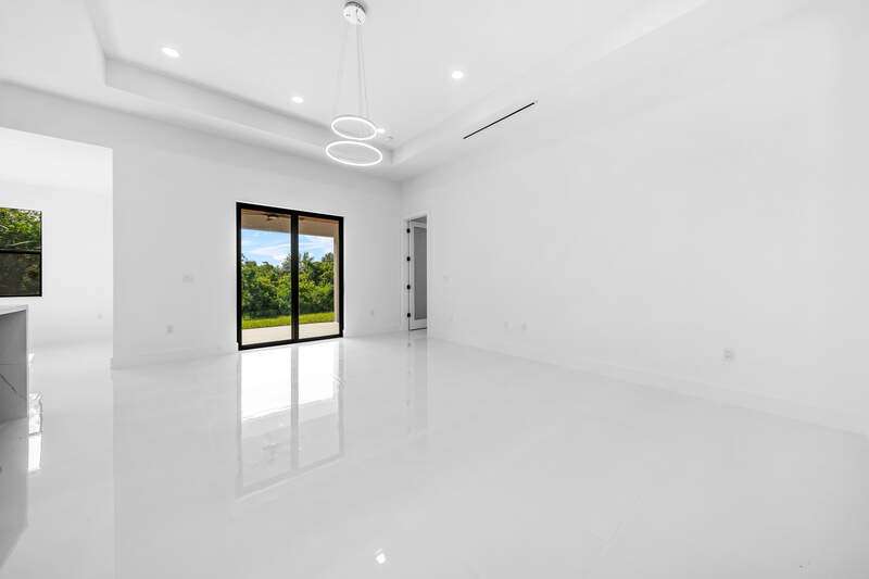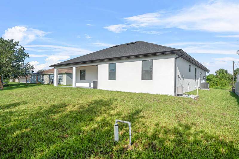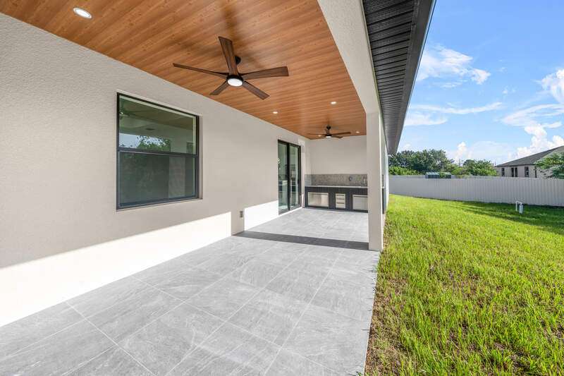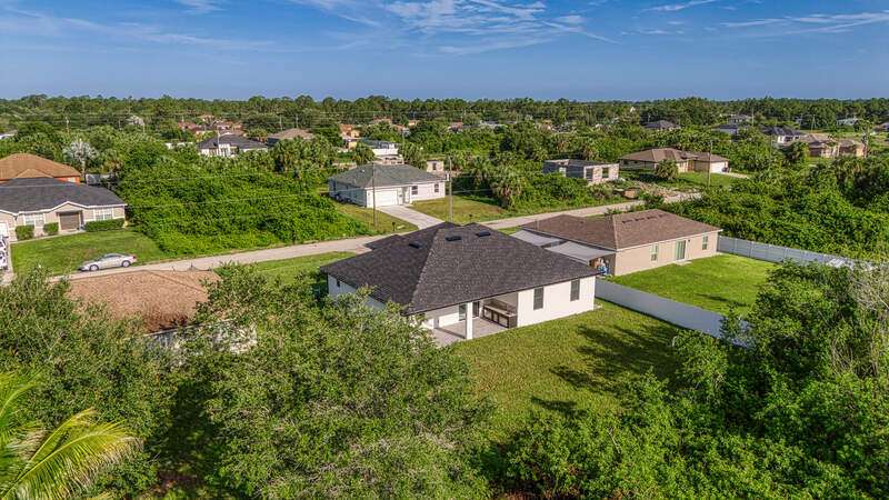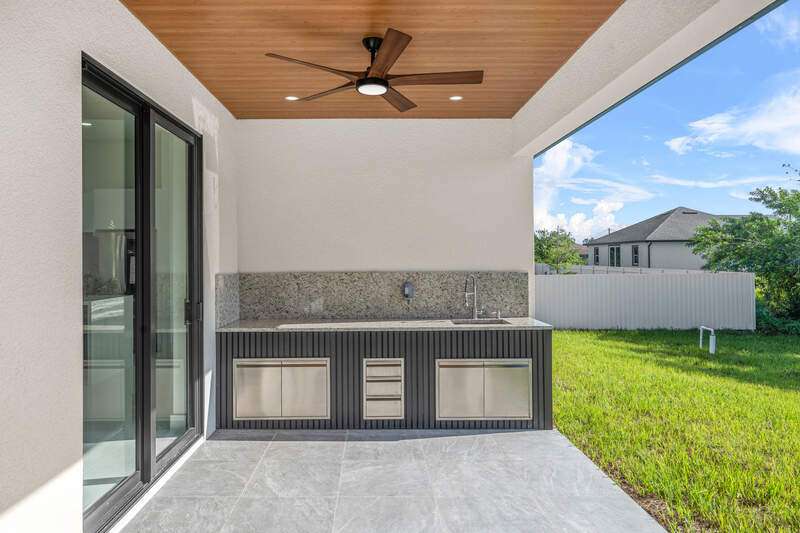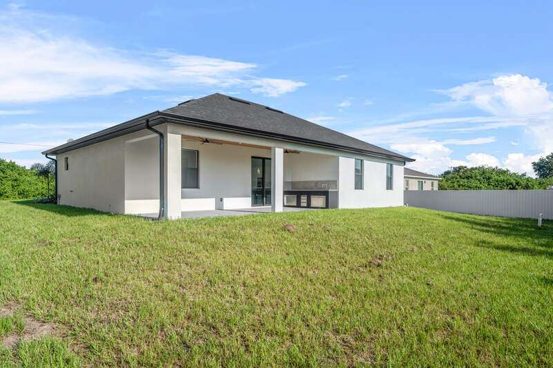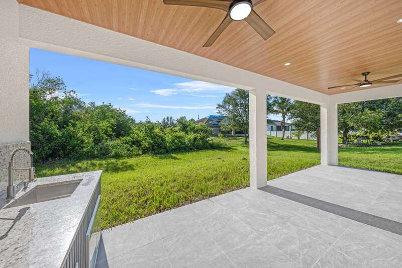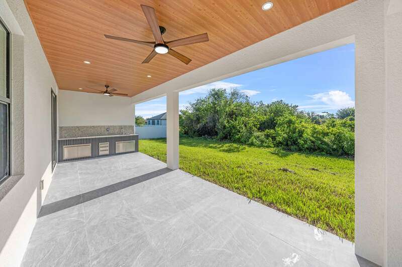 Amazing Brand New Home, High-end Finishes, on a 1/2 Acre Cleared Land, Move-in ready!! Chic sophistication, modern design, and a lifetime of memories to be made await you at this BRAND NEW construction home in sought after and growing Lehigh Acres with nearly 1,900 SqFt, 3+ Den, 2 bathrooms, and strong impact windows and doors throughout. Curb appeal is in full effect when pulling up to this stunning property situated on an acre with a paver driveway and pathway to the front door, fully landscaped, and gorgeous exterior lighting. From the French Door entryway, you are greeted by porcelain tile flooring throughout along with brand new custom LED light fixtures, frosted glass doors, impact resistant windows and exterior doors, and luxury finishes from top to bottom down to the baseboards. A true chef's kitchen; enjoy stainless steel appliances, stainless steel hood, quartz counters and backsplash, a cascading center island, soft close cabinetry and drawers, disposal, and a vantage point that is made perfect for entertaining any gathering. The dining area also comes equipped with modern and custom light fixtures. Your living area is prestigious with access to the lanai. You will not need a vacation when you have a lanai like this one with its outdoor kitchen including granite counter and stainless steel finishes, natural shiplap wood ceiling, fans, and recessed lighting. Build the pool you have always wanted to maximize this resort style home. The primary bedroom is a real treat to wind down the day with your modern glass shower, double vanity, water closet, and two walk-in closets with built-in closets. A home office, extra space for out of town guests, or whatever else you may envision can be used in the den off from the living area. The additional guest bedrooms enjoy tons of natural light, frosted double closets, and ceiling fans. Peace of mind is enhanced with your 2 car garage with epoxied flooring and separate entrance from the exterior, laundry room in residence with an additional large pantry, impact resistant doors and windows, and close proximity to shopping and dining. This area of Lehigh Acres is growing with tons of new commercial space attracting many businesses. Your forever Florida home is calling!