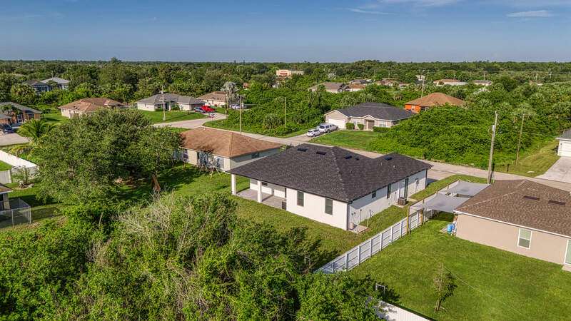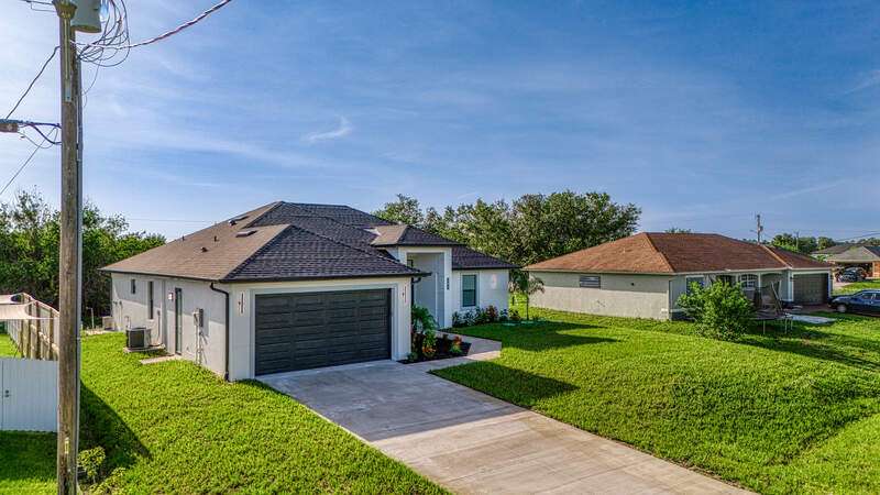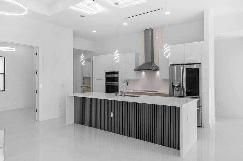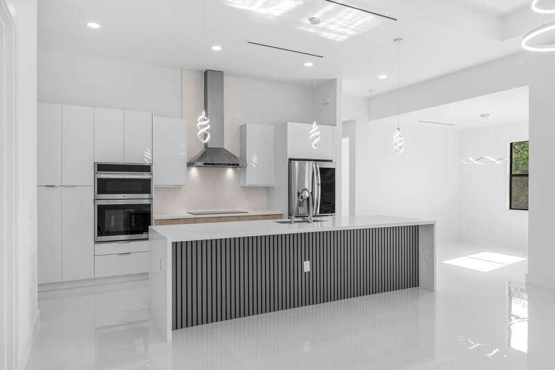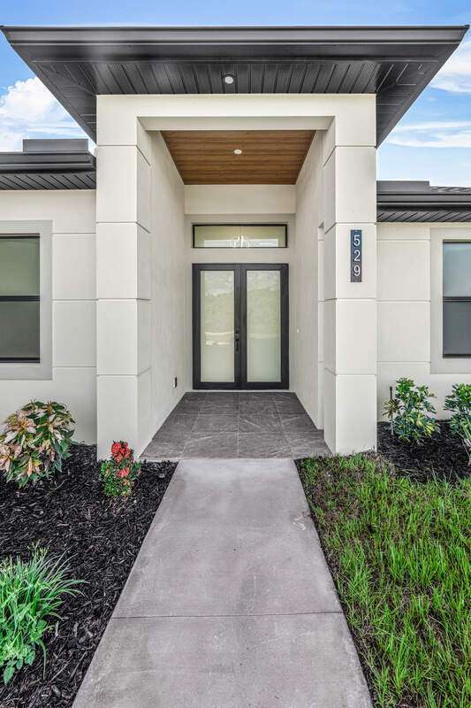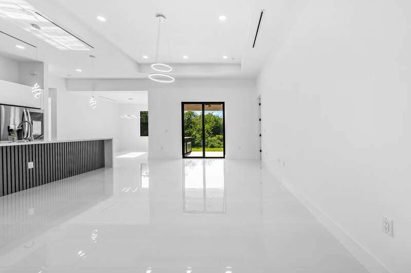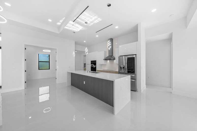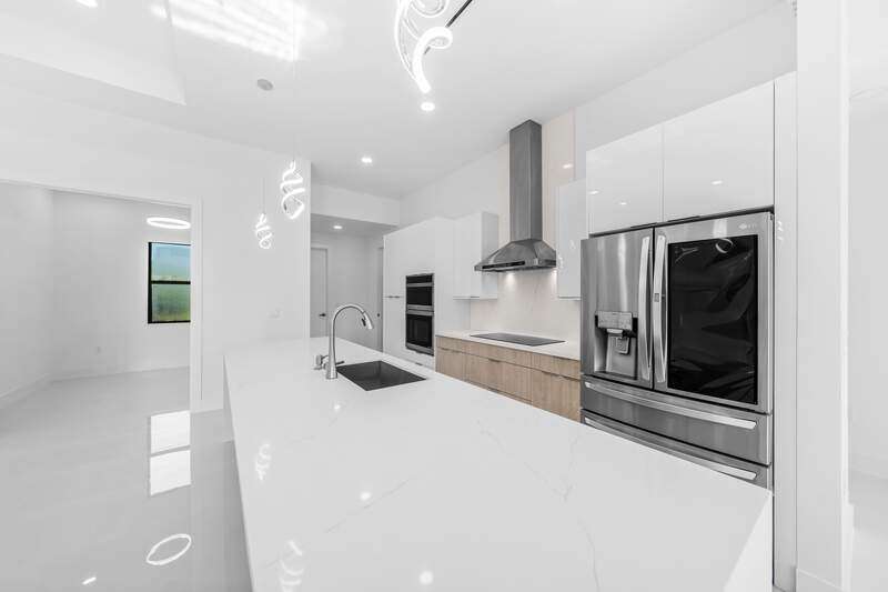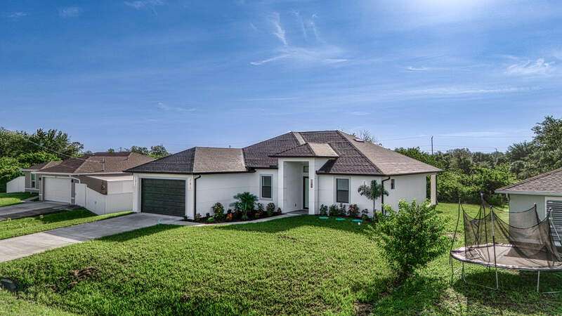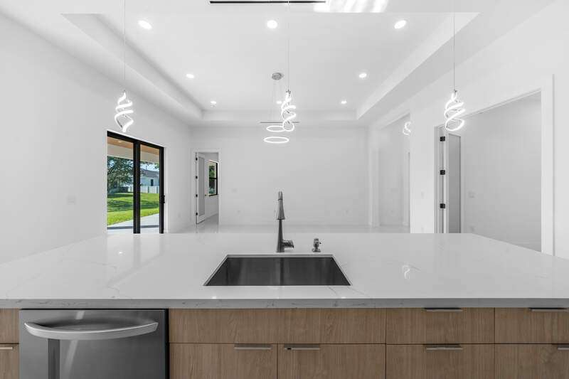 Amazing Brand New Home, High-end Finishes, on a 1/2 Acre Cleared Land, Move-in ready!! Chic sophistication, modern design, and a lifetime of memories to be made await you at this BRAND NEW construction home in sought after and growing Lehigh Acres with nearly 1,900 SqFt, 3+ Den, 2 bathrooms, and strong impact windows and doors throughout. Curb appeal is in full effect when pulling up to this stunning property situated on an acre with a paver driveway and pathway to the front door, fully landscaped, and gorgeous exterior lighting. From the French Door entryway, you are greeted by porcelain tile flooring throughout along with brand new custom LED light fixtures, frosted glass doors, impact resistant windows and exterior doors, and luxury finishes from top to bottom down to the baseboards. A true chef's kitchen; enjoy stainless steel appliances, stainless steel hood, quartz counters and backsplash, a cascading center island, soft close cabinetry and drawers, disposal, and a vantage point that is made perfect for entertaining any gathering. The dining area also comes equipped with modern and custom light fixtures. Your living area is prestigious with access to the lanai. You will not need a vacation when you have a lanai like this one with its outdoor kitchen including granite counter and stainless steel finishes, natural shiplap wood ceiling, fans, and recessed lighting. Build the pool you have always wanted to maximize this resort style home. The primary bedroom is a real treat to wind down the day with your modern glass shower, double vanity, water closet, and two walk-in closets with built-in closets. A home office, extra space for out of town guests, or whatever else you may envision can be used in the den off from the living area. The additional guest bedrooms enjoy tons of natural light, frosted double closets, and ceiling fans. Peace of mind is enhanced with your 2 car garage with epoxied flooring and separate entrance from the exterior, laundry room in residence with an additional large pantry, impact resistant doors and windows, and close proximity to shopping and dining. This area of Lehigh Acres is growing with tons of new commercial space attracting many businesses. Your forever Florida home is calling!