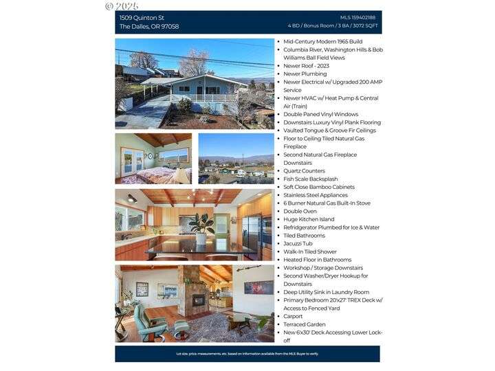 ~40K Price improvement!~ Welcome to 1509 Quinton St in The Dalles—a beautifully updated mid-century gem featuring breathtaking views of the Columbia River and lovely territorial views of the Washington hills. This spacious 4-bedroom, 3-bathroom home offers a perfect blend of vintage charm and modern upgrades, creating an ideal space for comfortable living and entertaining.Step inside to discover original tongue-in-groove fir ceilings, dual gas fireplaces and an inviting layout designed to maximize natural light. The gourmet kitchen is a chef’s dream, featuring custom bamboo cabinetry, quartz countertops, stainless steel appliances including a 6 burner natural gas stove and a double oven, all centered around a generous island—perfect for gatherings.Enjoy seamless indoor-outdoor living with an expansive deck overlooking Bob Williams Ball Park and panoramic river and territorial views. The versatile lock-off unit provides endless possibilities, equip with its one washer/dryer hook ups and exterior deck access.This home has been thoughtfully updated with new plumbing, electrical, HVAC (including heat pump & central air), flooring, kitchen, bathrooms and a newer roof, ensuring worry-free living. The luxurious tiled bathrooms and unique solar-powered nightlight add a touch of sophistication.Don’t miss this opportunity to own a stunning, move-in-ready home in a prime location! Schedule your showing today! Open house, Sunday, 9/14, 4-6pm