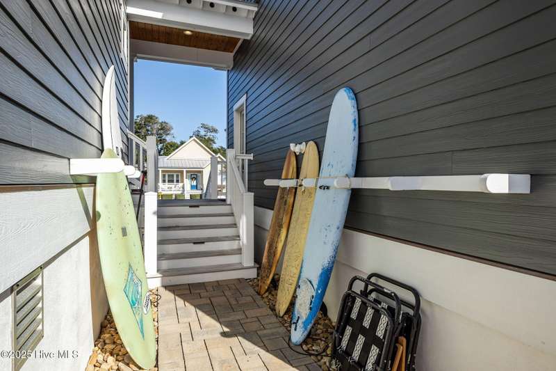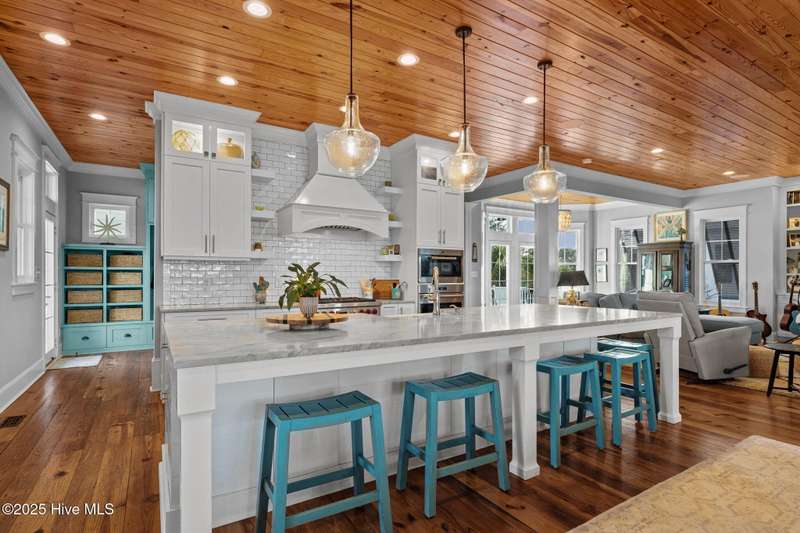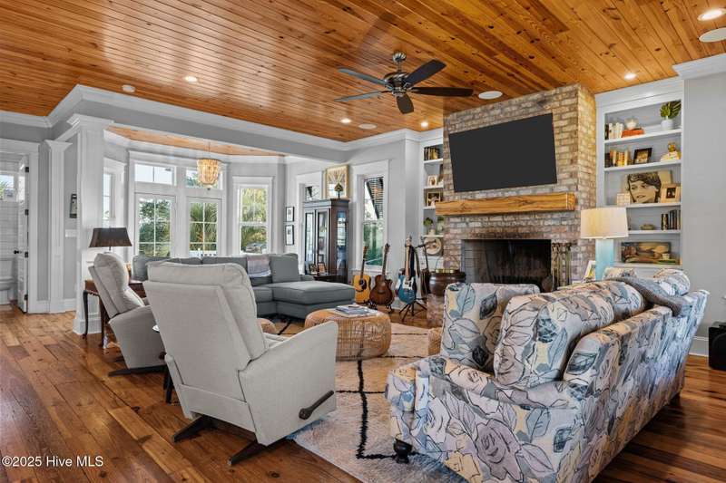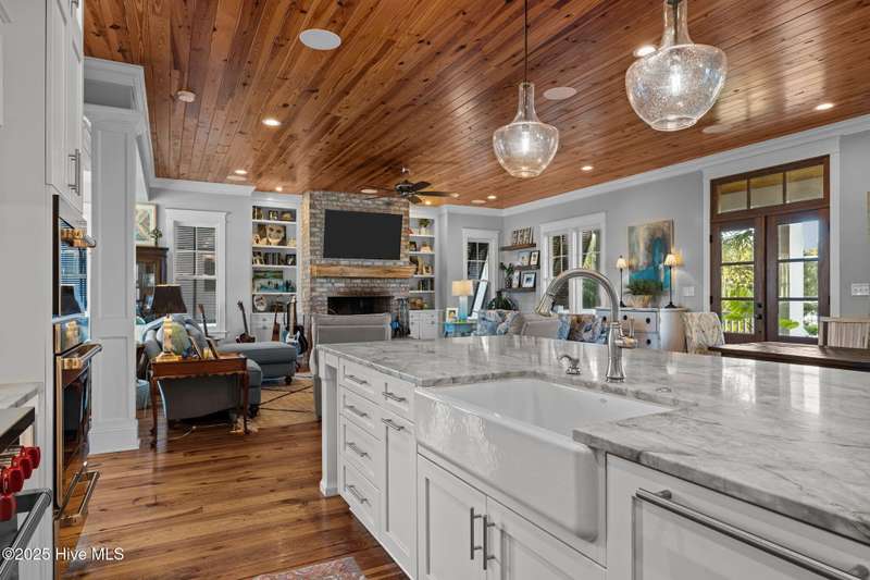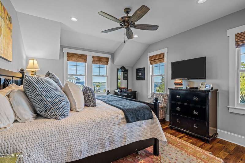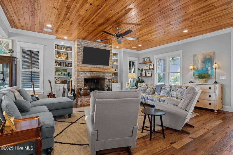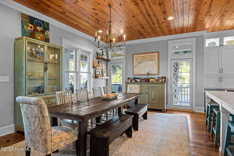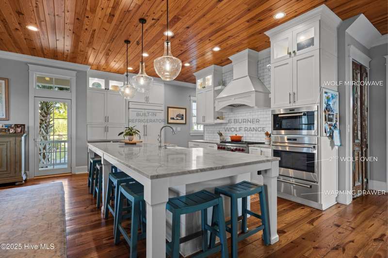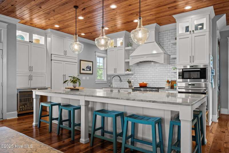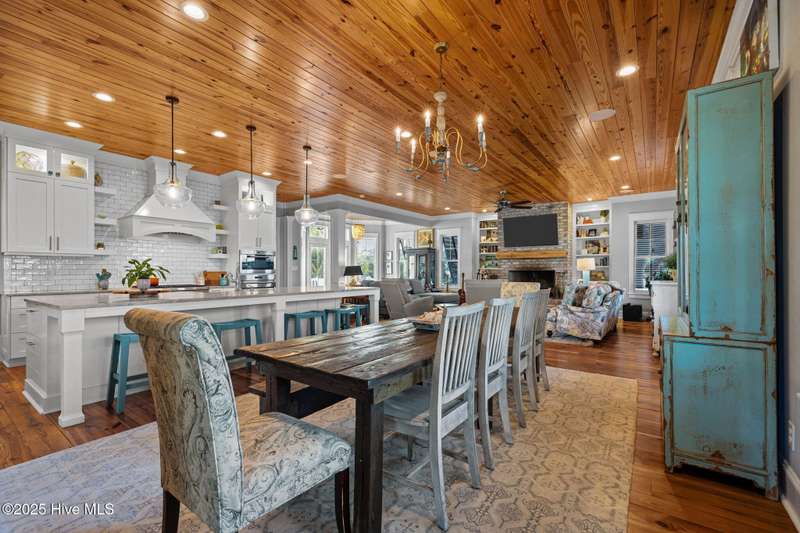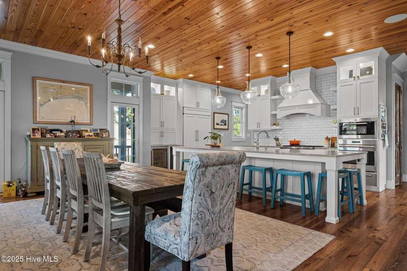 Welcome to 409 Sunrise Court, Emerald Isle, a stunning coastal home that includes a deeded boat slip just steps away, offering the perfect gateway to the water. Designed with uncompromising craftsmanship, this property blends timeless materials with modern convenience. The main living area boasts 10-foot ceilings and reclaimed hardwood floors from a historic tobacco barn, creating warmth and character throughout. A true chef's kitchen features a 6-burner Wolf range, second Wolf oven, Wolf microwave, Wolf warming drawer, and built-in refrigerator, an ideal space for entertaining or family gatherings. Designed for both comfort and resilience, this home includes a whole-house generator, functional hurricane shutters, two tankless hot water heaters, and a wood-burning fireplace; all offering peace of mind and convenience during any season. Details such as pine wood ceilings and ipe decking on the wraparound porch highlight the quality of construction, while a whole-home and porch sound system enhances everyday living. The thoughtful layout includes a 471 sq. ft. private guest suite, connected to the main house by a covered breezeway above the two-car garage. With its superior craftsmanship, premium finishes, and enviable amenities, including the deeded boat slip, this home embodies the best of Emerald Isle living. *Home was recently appraised 9/30/2025 for $1,950,000. Please reach out to listing agent for appraisal.