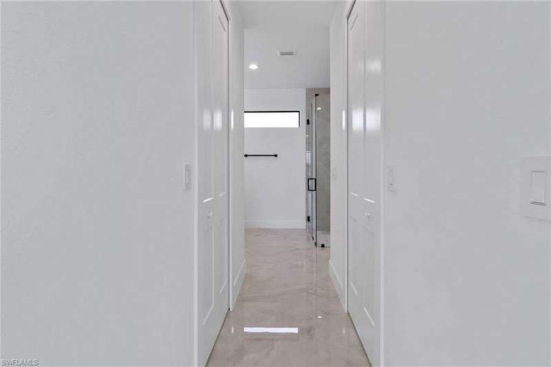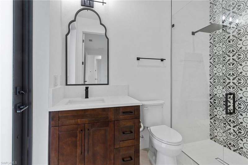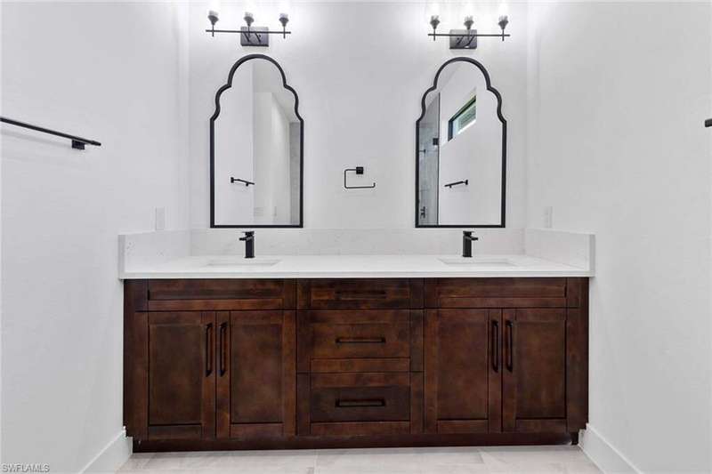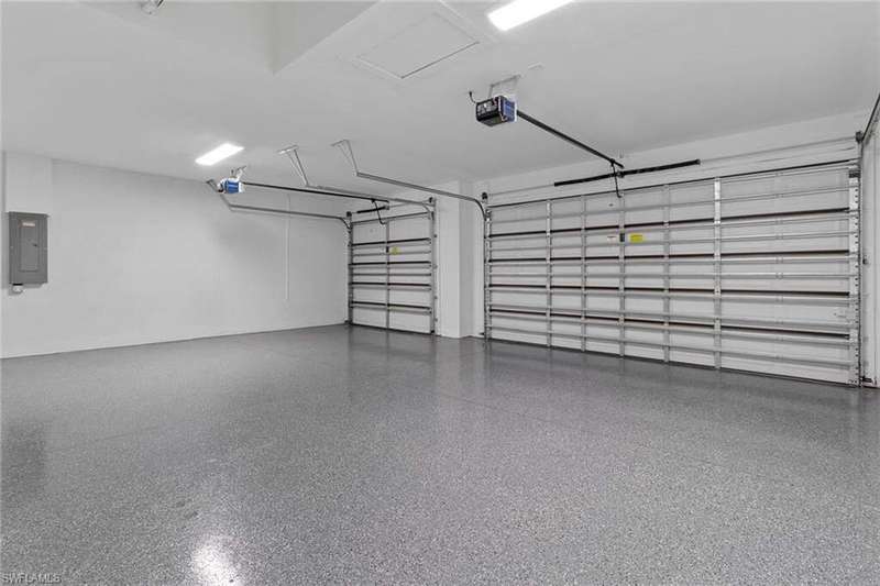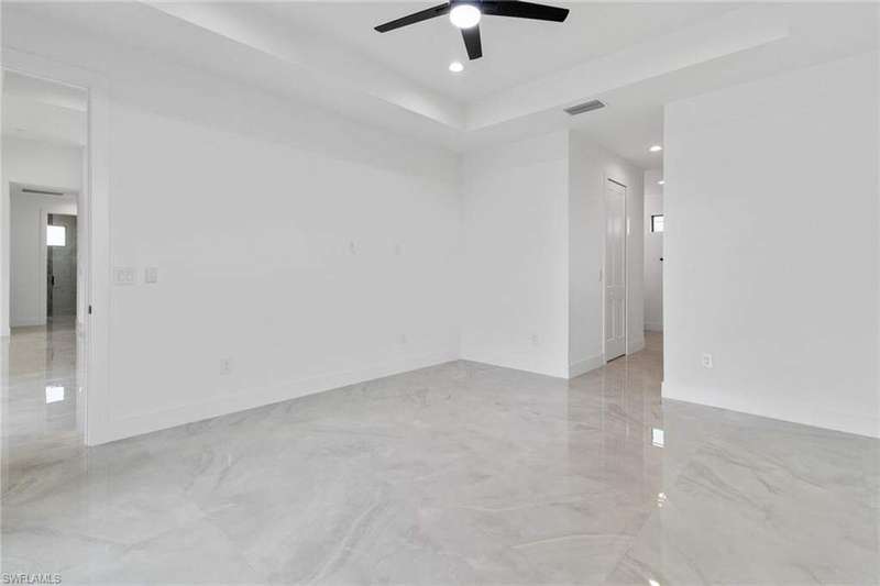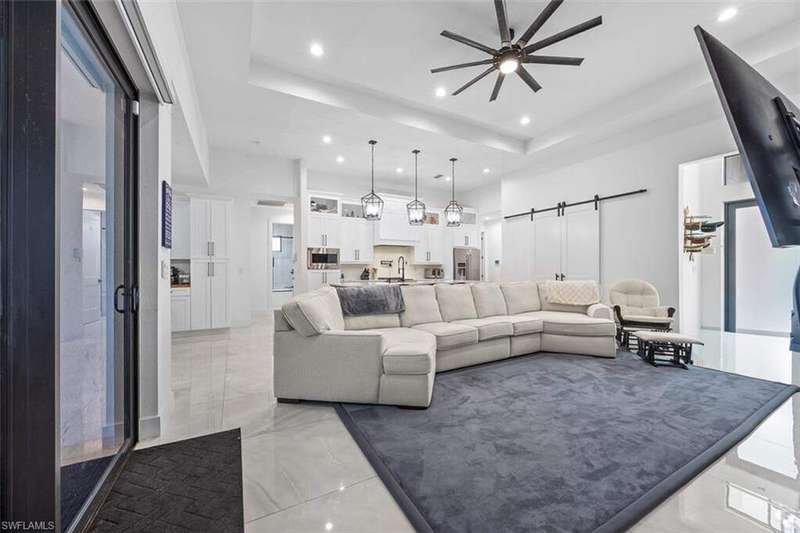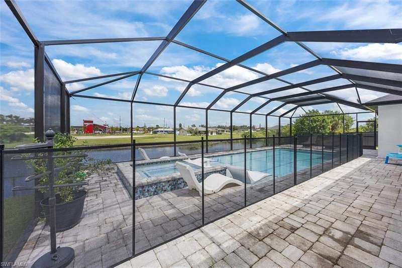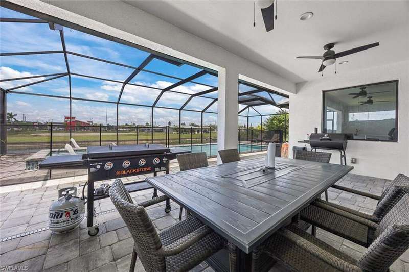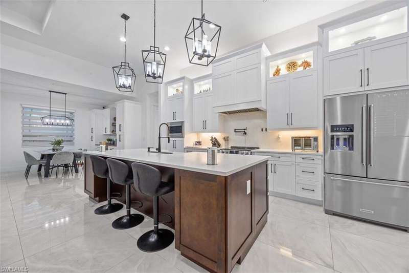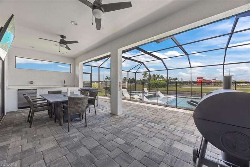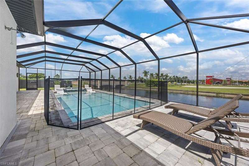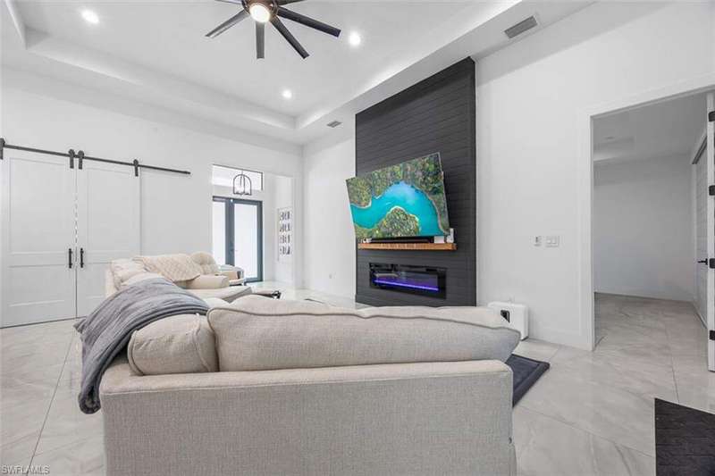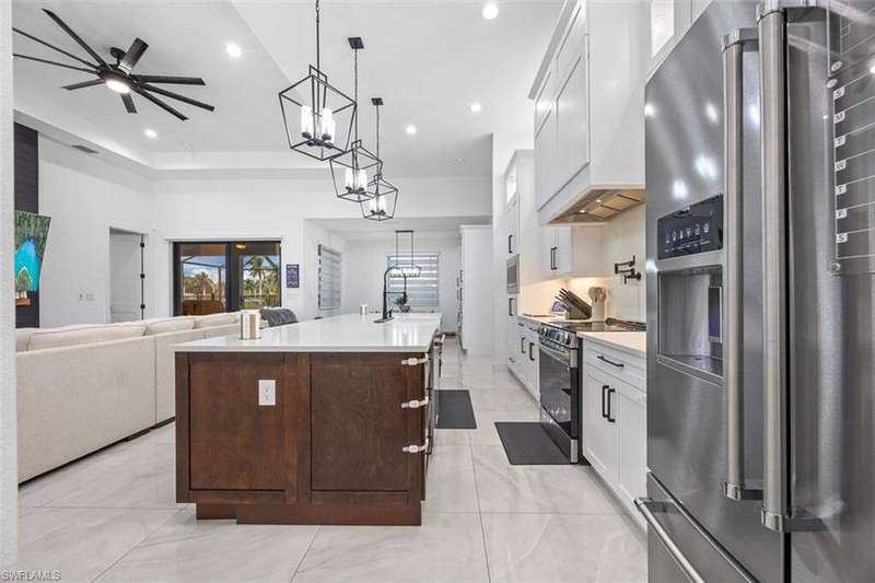 This stunning 2023-built home blends modern design with thoughtful upgrades, offering both luxury and functionality. Featuring 3 bedrooms, 3 full bathrooms, and a den, it rests on an expansive triple lot along a serene freshwater canal. Inside, the open floor plan is highlighted by soaring 14-foot tray ceilings, oversized porcelain tile flooring, sleek baseboards, and contemporary lighting that creates a warm, inviting atmosphere. The chef's kitchen impresses with top-of-the-line appliances, a quartz waterfall island and backsplash, soft-close double cabinetry, LED accents, and stylish pendant lighting. A custom coffee bar and wine station add an extra touch of convenience and sophistication. The king-sized primary suite is a true retreat, complete with a water view, private pool access, a spacious walk-in closet with built-in cabinetry, and a spa-like ensuite featuring a frameless glass shower with dual rainfall showerheads. Designed for relaxation and entertaining, the outdoor space features a sparkling pool with a new screen enclosure, a safety fence, a jetted spa, and a fully equipped custom outdoor kitchen. A pool bath and entertainment-ready TV system make gatherings effortless, while the expansive grassy area offers room to play or simply enjoy the view. Additional highlights include a 3-car garage with epoxy floors, a property-line fence, and underground electrical service. This home combines style, comfort, and peace of mind-all in one exceptional waterfront setting.