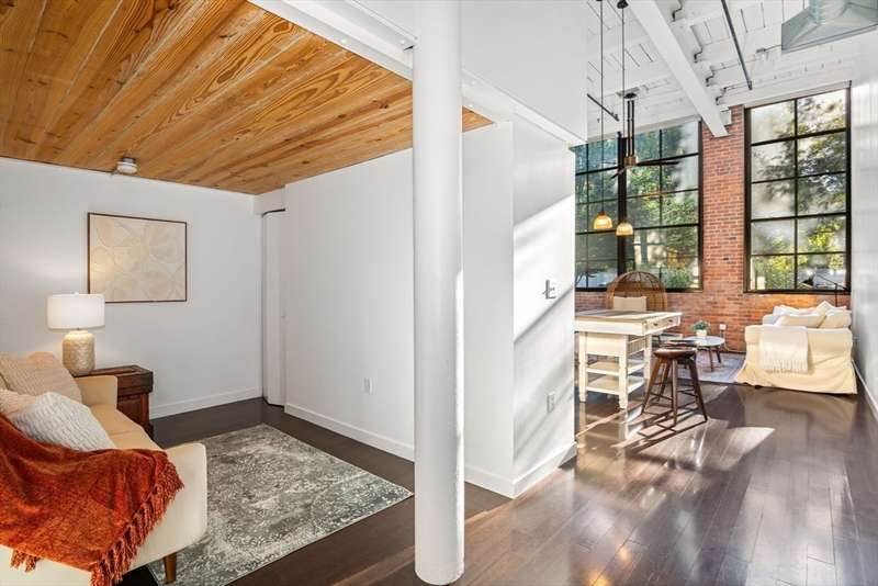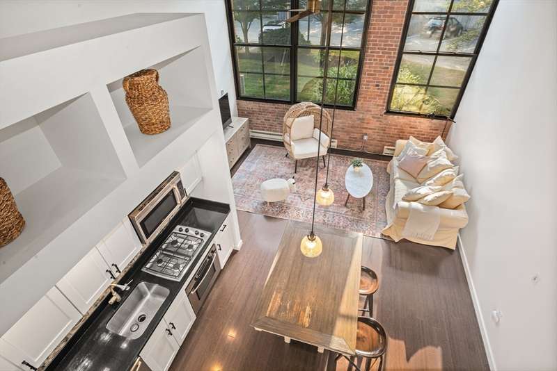 Rare Gem at Aberdeen Lofts! Pristine, sun-drenched 1BR + Den, 2-Full Bath loft-style condo featuring soaring 15 ceilings, oversized industrial-style windows, & gleaming bamboo floors in West Cambridge. Welcoming entryway & hallway seamlessly flow into open-concept Kitchen & light-filled L/R w/ exposed brick, beamed ceilings, & expansive windows. Kitchen boasts SS appliances, updated cabinets & lighting. Completing the Main Level are a Full Bath & versatile Den/Office w/closet. Upstairs, the lofted Primary Bedroom w/ 2nd Full Bath provides privacy & comfort. Amenities include in-unit Laundry, deeded parking & bike storage. Central A/C. Outdoor lovers will appreciate keyed-access from private courtyard to the Watertown-Cambridge Greenway & connecting to Fresh Pond Trail. Professionally managed, healthy reserve & gorgeous landscaping. Easy access via public transportation to Harvard Square/Boston, close to shopping, restaurants, medical, Universities. Move right in!