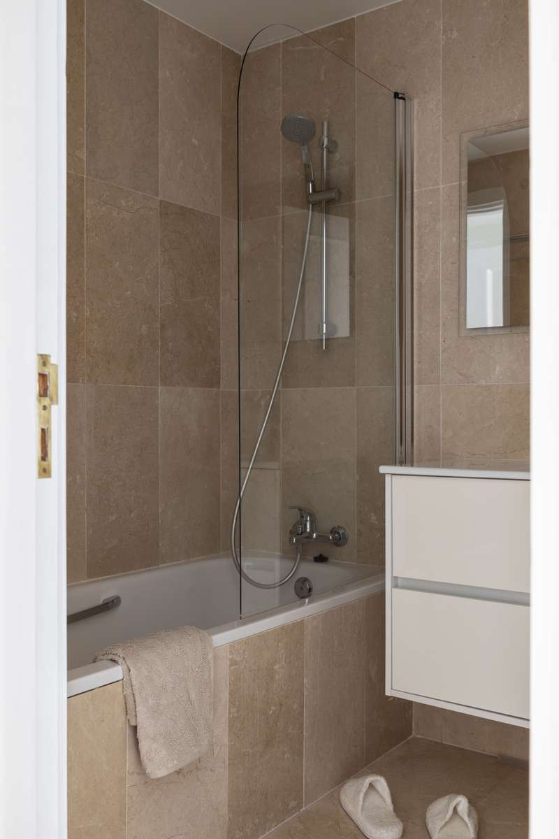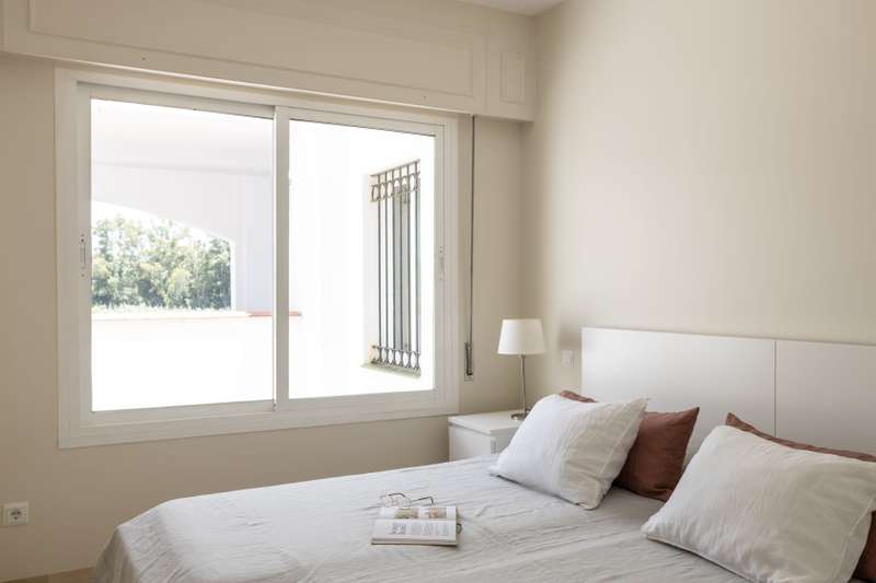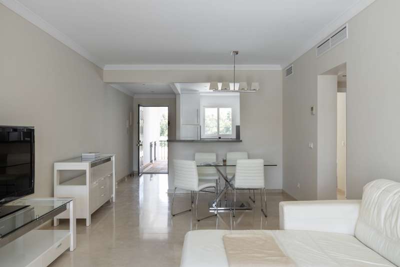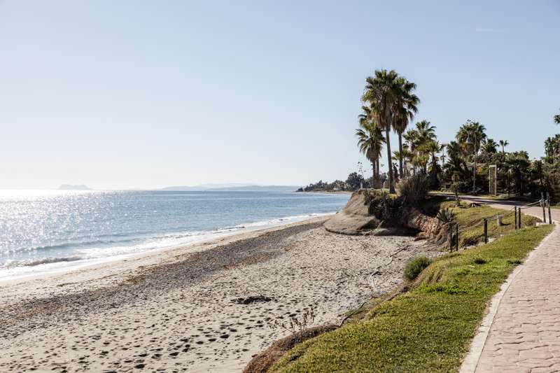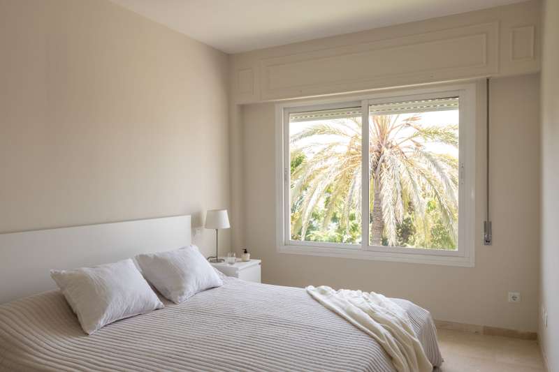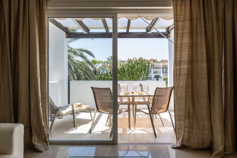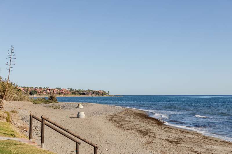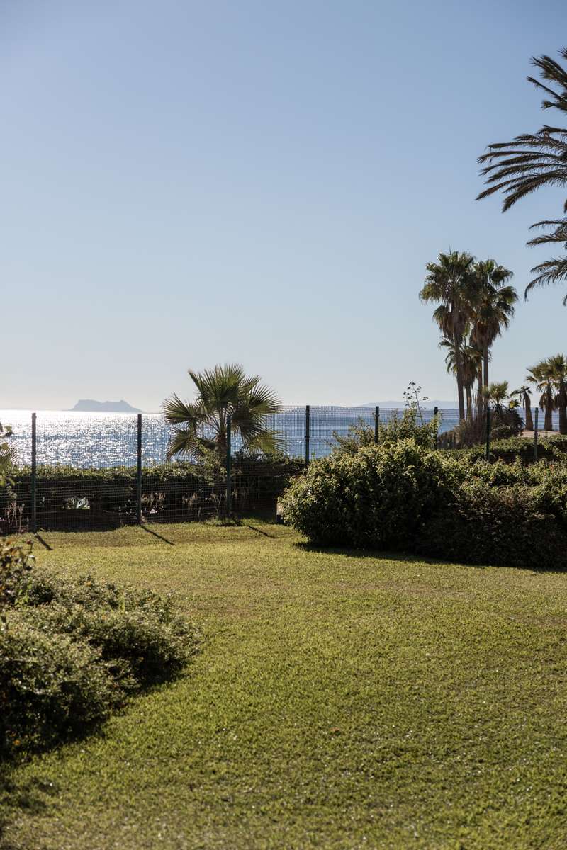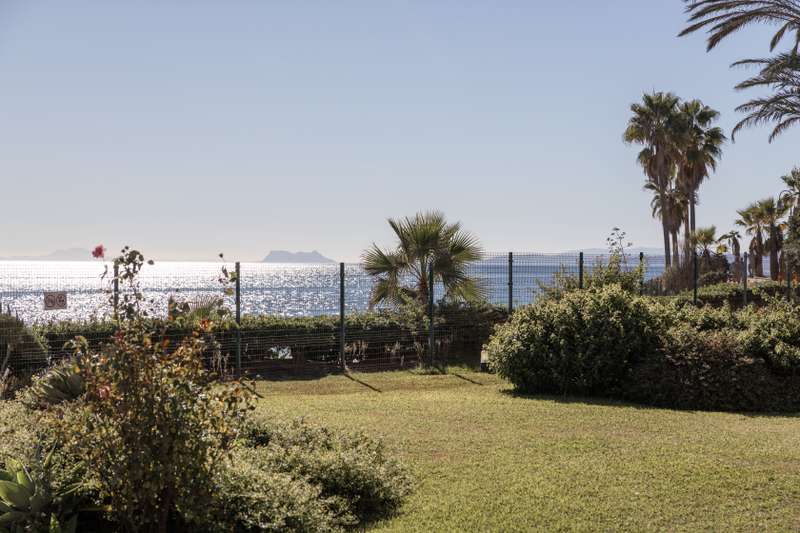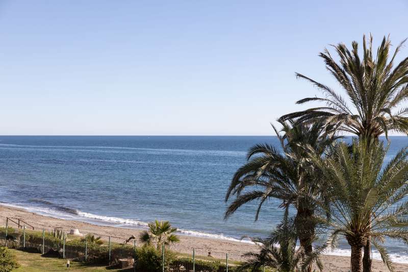 Spacious renovated apartment on a beachfront urbanization with a West facing large terrace overlooking the swimming pool and lush common gardens. With an unbeatable location on the New Golden Mile in a charming Andalucian urbanization and well-kept gated community with mature gardens and direct access from the gardens to the beach and the beautiful promenade of the Senda Litoral. It represents an excellent investment for vacation rentals or as a second residence to rest and relax anytime you want to come and enjoy the unparalleled Mediterranean weather and lifestyle of the Costa del Sol. The apartment is located on the second floor of a charming walk up building and it is steps away from the beach. It has been renovated with a new modern and fully equipped open plan kitchen, a spacious living-dining room, two bathrooms and two bedrooms. The apartment is fully furnished and has a large West oriented terrace with sun all day and space for a big dining table and a sun bed. The urb