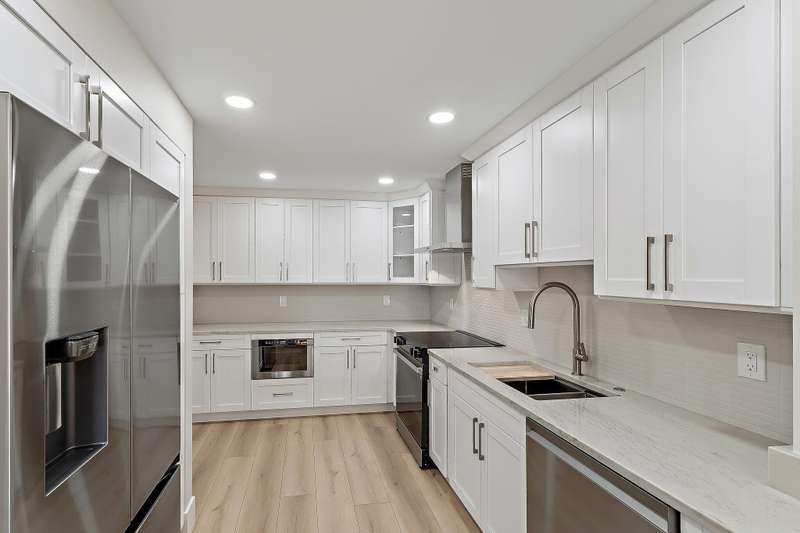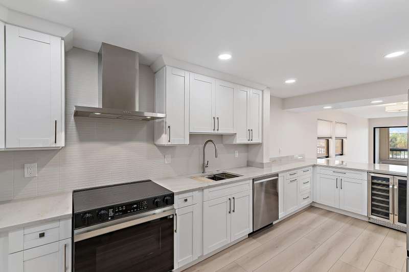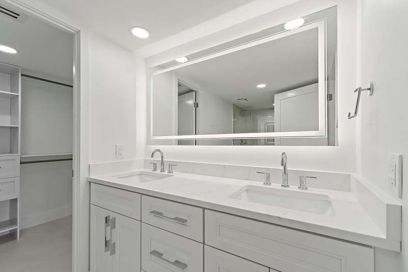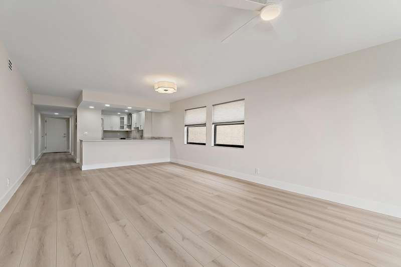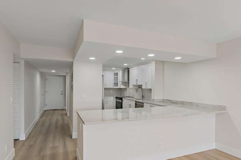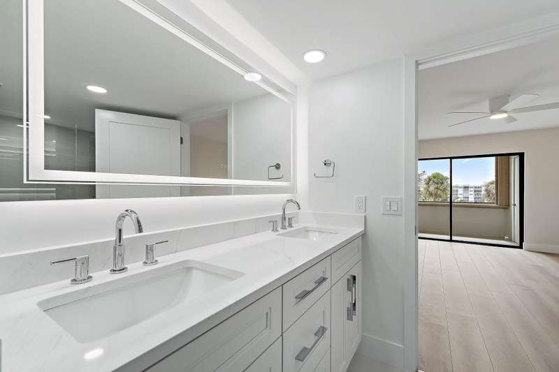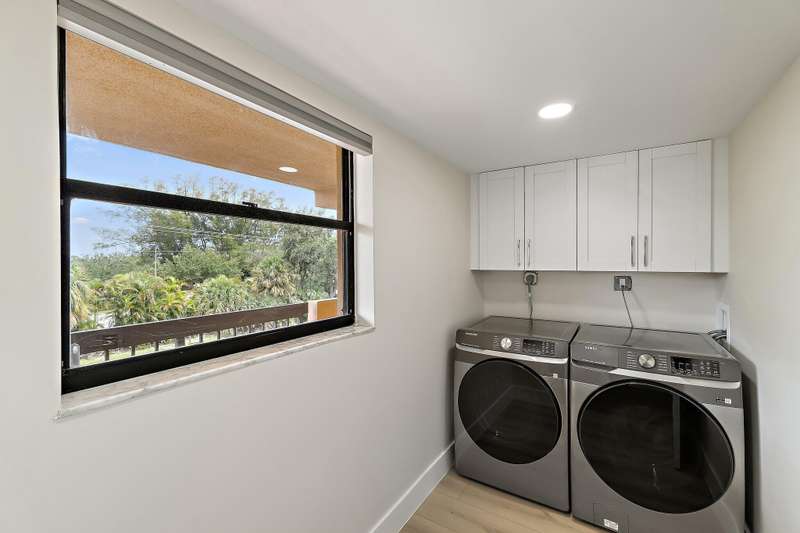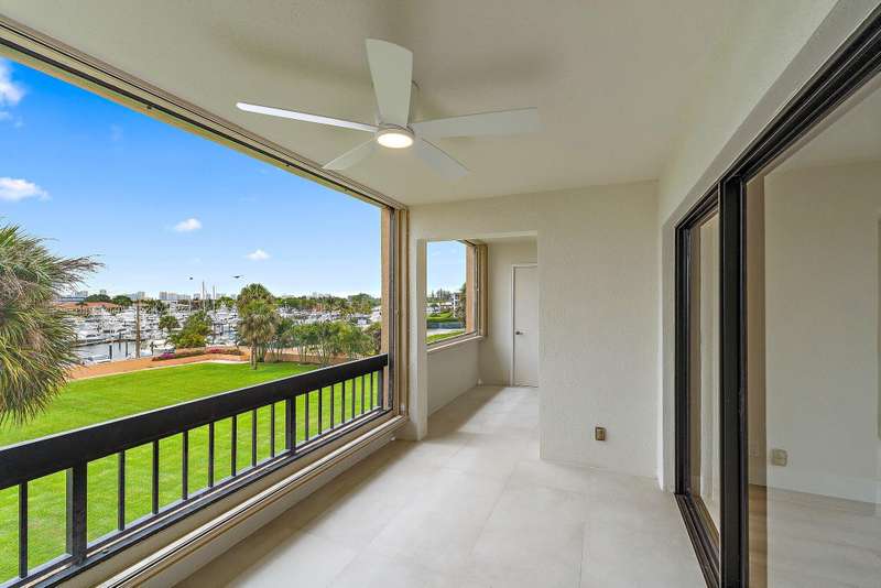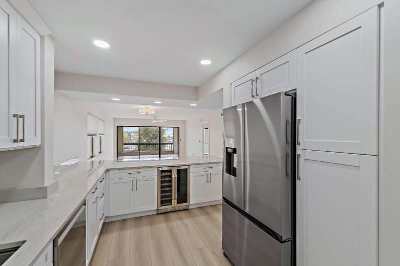 Reconstructed, turn-key opportunity awaits by thoughtful design in this layout improved upon from the original floor plan, overlooking the North Palm Beach Marina and across the street from the North Palm Beach Country Club! Upon entry, a newly created private laundry room features a full-size washer and dryer. Newly expanded and reconfigured kitchen features white shaker cabinetry with crown molding, undermount lighting, Quartz counters, tile backslash, power drawer in-cabinet microwave, stainless-steel appliances, pantry, wine cooler, sink with cutting board, and bar seating. Entertain in the dining or living room areas, with extra corner-unit windows, overlooking the marina and leading to the expansive screened-in patio with new large-format tile and private storage closet. Retreat