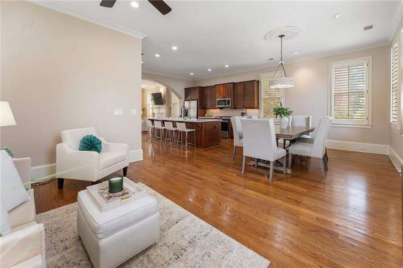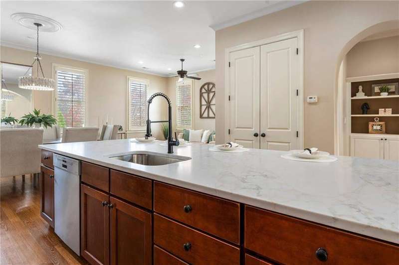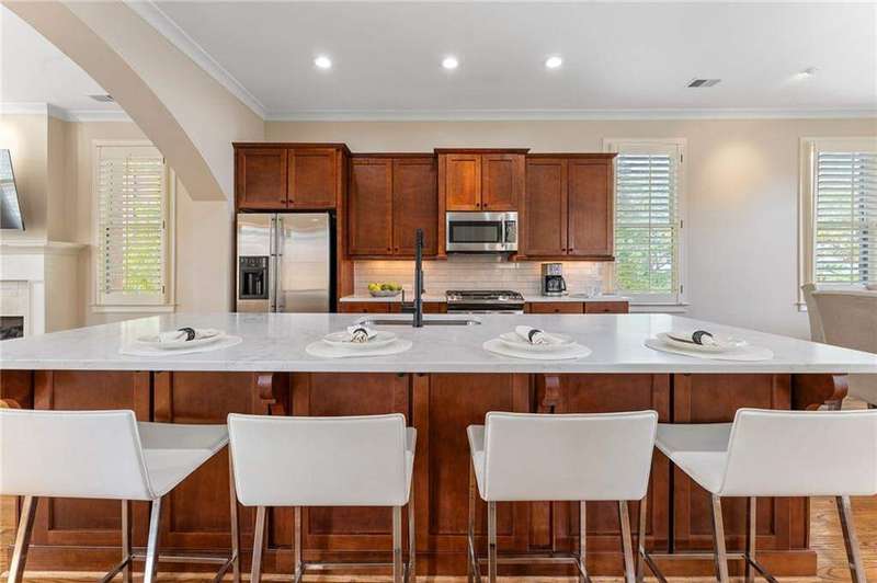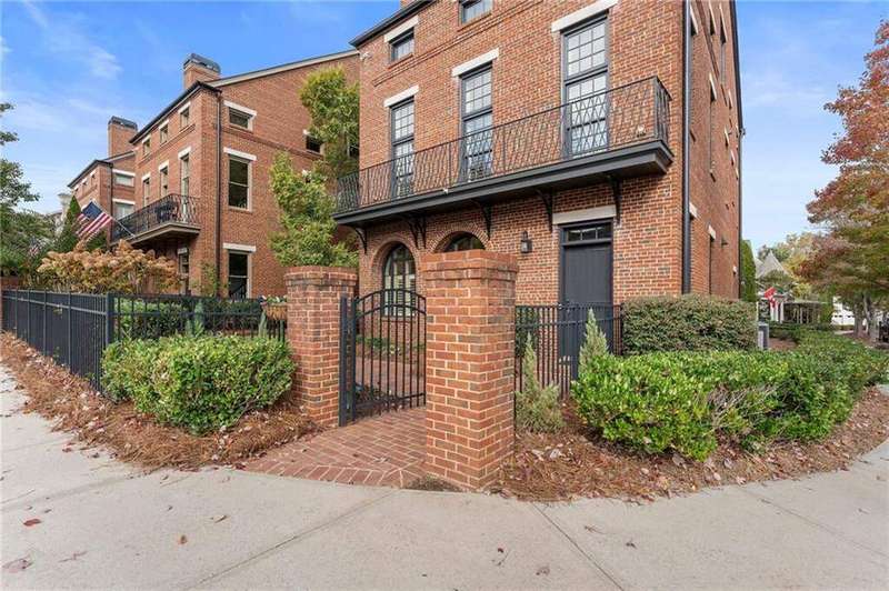 Back on Market at no fault of seller! Live the Coveted Crabapple Lifestyle. Welcome to one of the original-and rarely available-brownstones in the heart of the Crabapple Market District. This exceptional, all-brick detached home offers timeless charm, thoughtful updates, and unbeatable value compared to nearby new construction townhomes priced around $1.5 million. With 2 spacious bedrooms, 2.5 baths, and generous living areas, this home also features a versatile loft/office with built-in workspace. Enter through a charming gated front courtyard or via the rear-facing 2-car garage into a welcoming two-story foyer. The ground level includes a large guest suite with a full bath-ideal for visitors or multi-generational living. Upstairs, the main living area is bathed in natural light and features 10+ foot ceilings, hardwood floors, and floor-to-ceiling windows with elegant plantation shutters. The gourmet kitchen has been tastefully upgraded with honed Michelangelo quartz countertops, a stylish new backsplash, and a brand-new gas range. Adjacent spaces include a warm fireside great room, a large dining area, and a cozy keeping room-perfect for entertaining. The top floor is dedicated to the oversized primary suite, complete with an expansive custom walk-in closet, a spa-inspired bathroom with a double vanity, soaking tub, walk-in shower, and updated countertops. A separate laundry room and a sunny loft/office complete the upper level. Other highlights include: Four-sides brick construction with no shared walls; Newer systems (roof 3 years old, newer HVAC, water heater 2019); Finished garage floor with $7,500 in custom built-ins for optimal storage; Fully fenced yard; and HOA covers all yard maintenance for $650/quarter. All of this, just steps away from dozens of shops, restaurants, fitness studios, and healthcare providers. Crabapple is more than a neighborhood-it's a vibrant community. This is an investment in your quality of life - come see for yourself what makes this home and lifestyle so special.