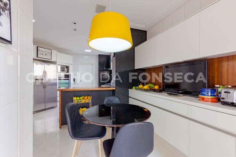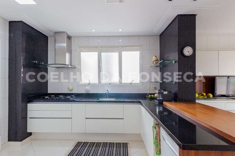 Cozinha muito ampla com copa e muitos armários.