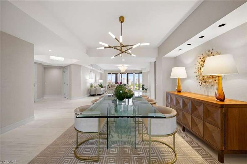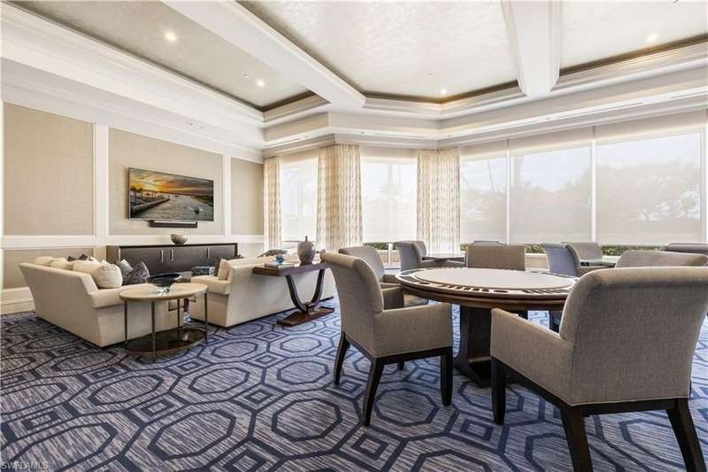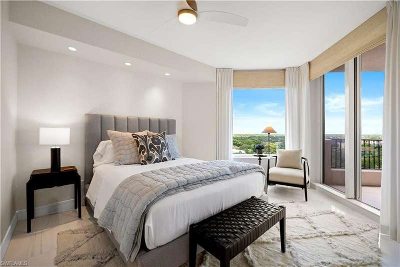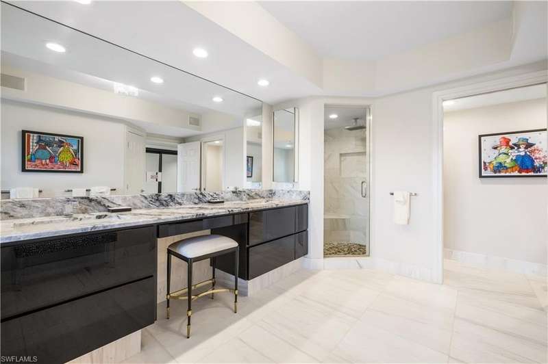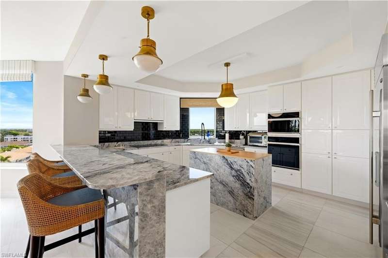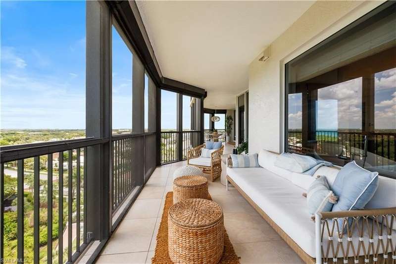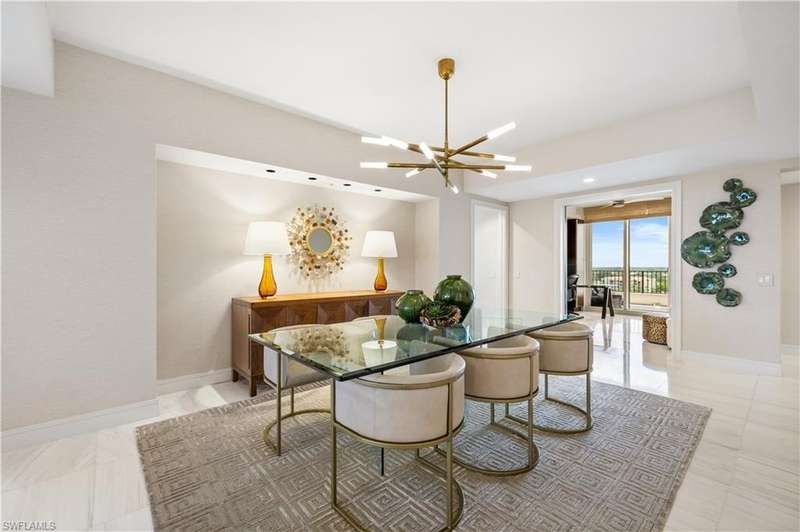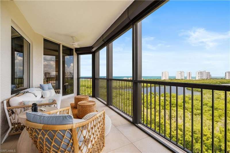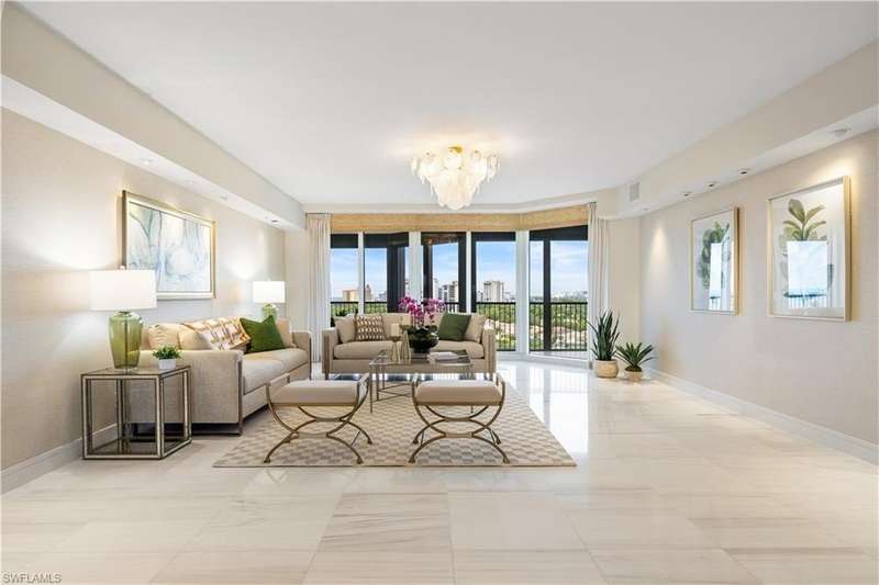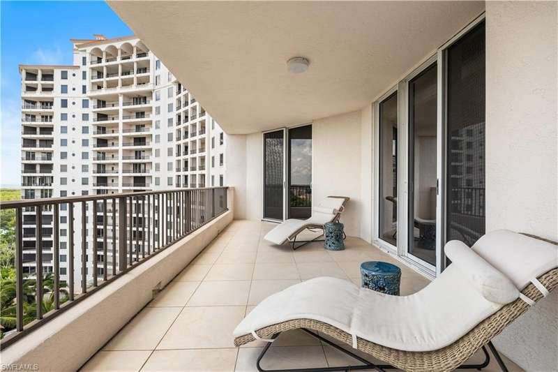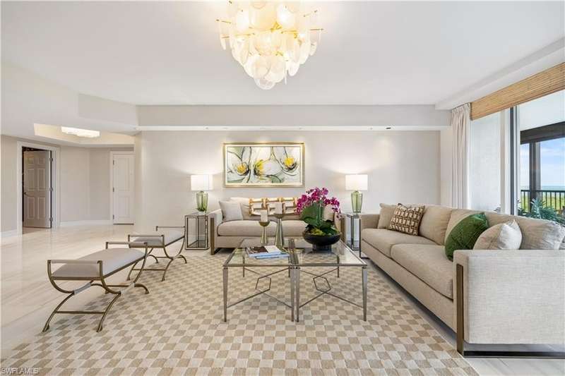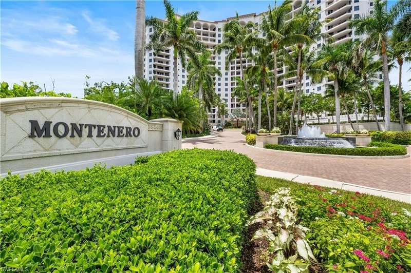 PRIME LOCATION! Located in one of the most desirable buildings within Pelican Bay, The Montenero, this 10th-floor "08" stack residence has been beautifully remodeled, offering 3400 sq.ft. under air; 4040 sq. ft. total area, marble floors, 9 ft. ceilings, 3 bedrooms, 3.5 baths, den/library, spacious living room, open kitchen, family room, and 2 large lanais. The 31-foot screened lanai has uninterrupted expansive Gulf and sunset views all year and upgraded metal electric shutters for storm protection. As you enter this residence, you immediately enjoy beautiful views from every room! The open living area has a comfortable upholstered couch, accompany chairs, and lovely art. The rectangular dining table seats 8. The well-equipped and updated kitchen has granite countertops and bar area, quality appliances, a round glass table and dining for 4, and an adjoining family room with a comfortable L-shaped couch, chairs, and TV. The primary suite features a king-size bed, sitting area, custom-designed closet, TV, spacious private bath with dual vanities, walk-in shower, and a soaking tub; easy access to the spacious screened lanai with comfortable seating. The 1st guest suite offers a king-size bed, matching end tables, dresser, walk-in closet, tv, ample natural light, private bath with a walk-in shower, and easy access to the open-air balcony with eastern views of the bay, and lush landscaping. The 2nd guest suite offers a queen-size bed, spacious closet, tv, and a private bath with a walk-in shower. No corridors to your front door - elevator opens into the residence foyer. Two deeded under-building parking spaces: A private garage for storage, and an open parking space are included. Montenero amenities include a movie theatre, sunny pool and hot tub area, 5 guest suites and 24-hour front desk attendant. Pelican Bay residents enjoy access to miles of sandy beaches, two beachfront restaurants, a staffed fitness center and two tennis pavilions. Pickleball is coming! The property is conveniently near Artis-Naples, Waterside Shops, Mercato Shops, and various dining establishments.