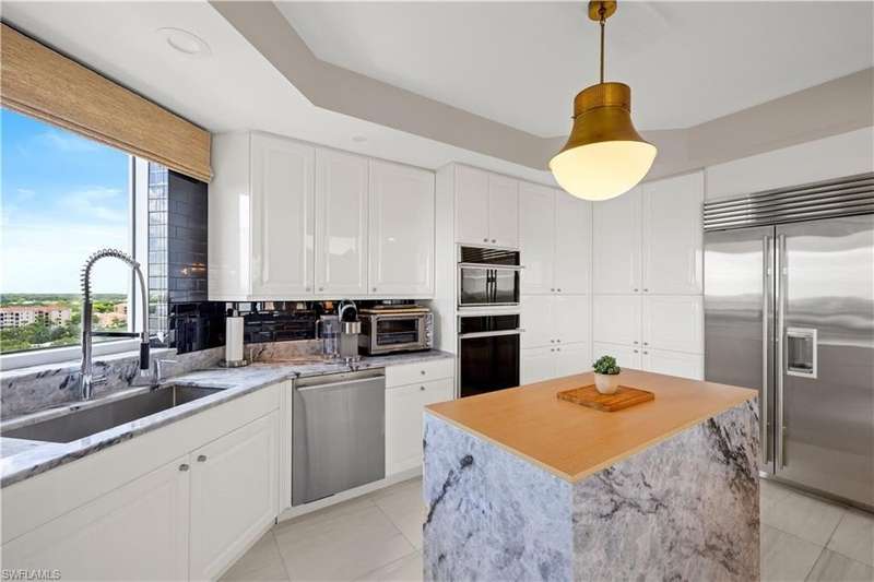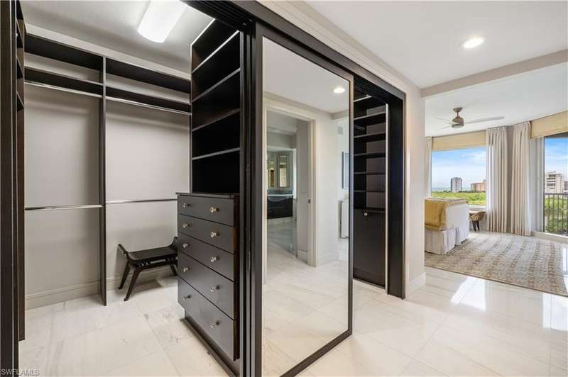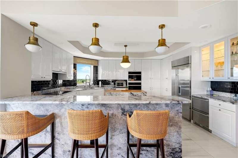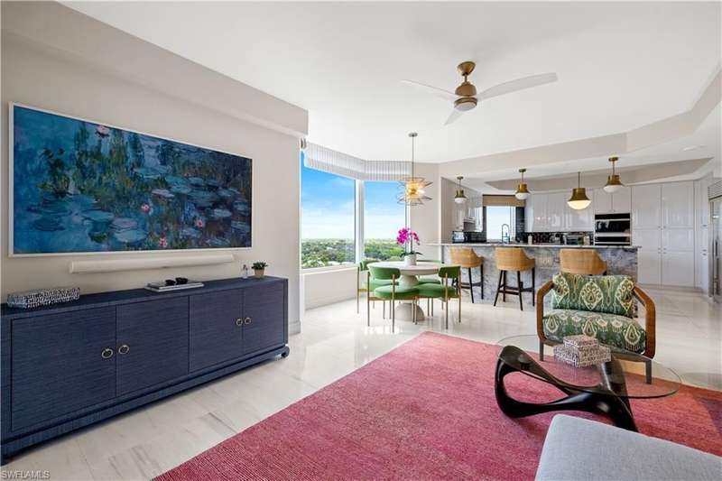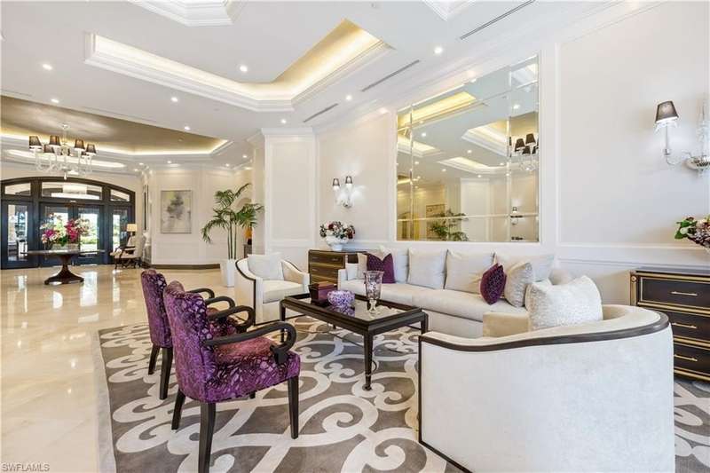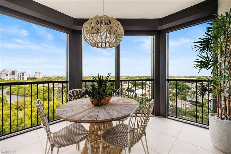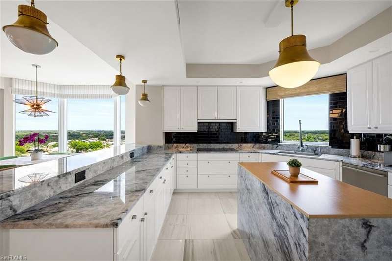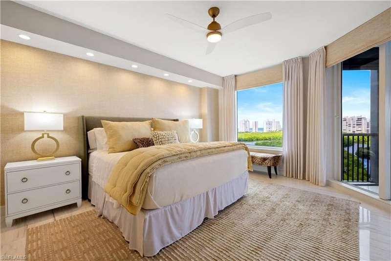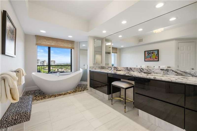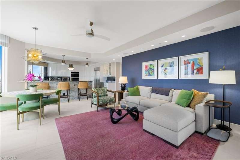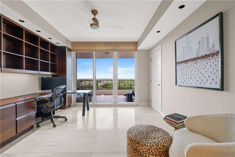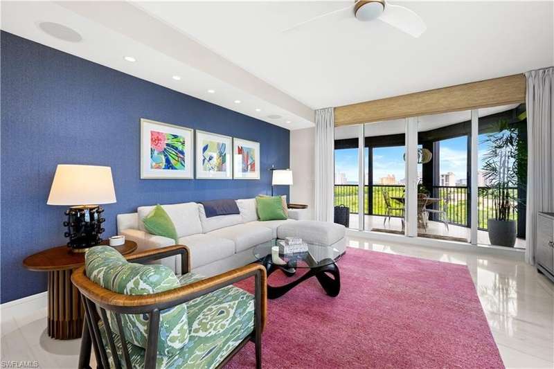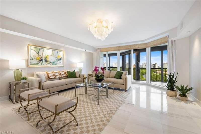 PRIME LOCATION! Located in one of the most desirable buildings within Pelican Bay, The Montenero, this 10th-floor "08" stack residence has been beautifully remodeled, offering 3400 sq.ft. under air; 4040 sq. ft. total area, marble floors, 9 ft. ceilings, 3 bedrooms, 3.5 baths, den/library, spacious living room, open kitchen, family room, and 2 large lanais. The 31-foot screened lanai has uninterrupted expansive Gulf and sunset views all year and upgraded metal electric shutters for storm protection. As you enter this residence, you immediately enjoy beautiful views from every room! The open living area has a comfortable upholstered couch, accompany chairs, and lovely art. The rectangular dining table seats 8. The well-equipped and updated kitchen has granite countertops and bar area, quality appliances, a round glass table and dining for 4, and an adjoining family room with a comfortable L-shaped couch, chairs, and TV. The primary suite features a king-size bed, sitting area, custom-designed closet, TV, spacious private bath with dual vanities, walk-in shower, and a soaking tub; easy access to the spacious screened lanai with comfortable seating. The 1st guest suite offers a king-size bed, matching end tables, dresser, walk-in closet, tv, ample natural light, private bath with a walk-in shower, and easy access to the open-air balcony with eastern views of the bay, and lush landscaping. The 2nd guest suite offers a queen-size bed, spacious closet, tv, and a private bath with a walk-in shower. No corridors to your front door - elevator opens into the residence foyer. Two deeded under-building parking spaces: A private garage for storage, and an open parking space are included. Montenero amenities include a movie theatre, sunny pool and hot tub area, 5 guest suites and 24-hour front desk attendant. Pelican Bay residents enjoy access to miles of sandy beaches, two beachfront restaurants, a staffed fitness center and two tennis pavilions. Pickleball is coming! The property is conveniently near Artis-Naples, Waterside Shops, Mercato Shops, and various dining establishments.