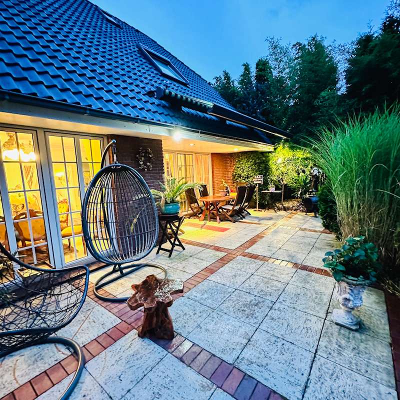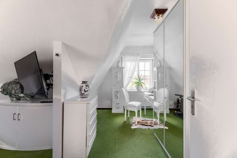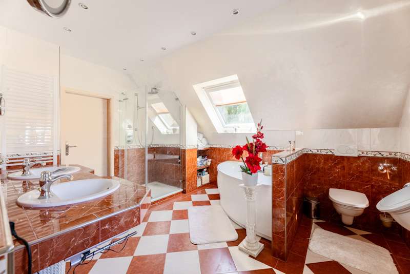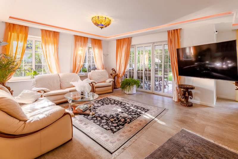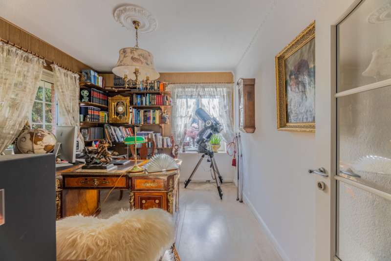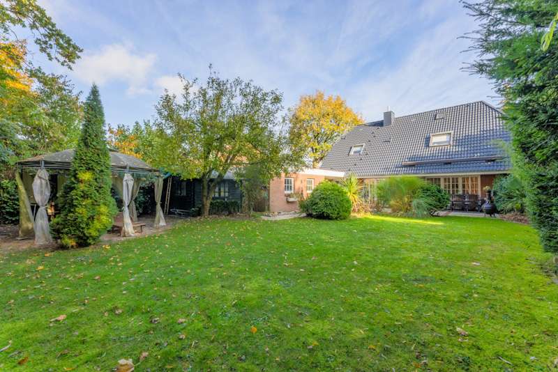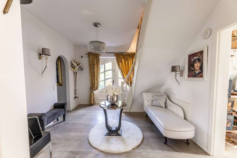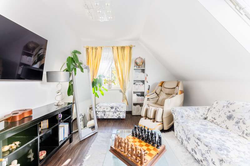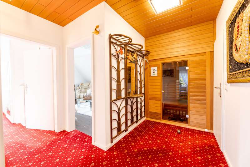 This extremely well-kept detached house was built in 1985 in solid construction in a cul-de-sac location and impresses with its well thought-out room layout and the extensive and very elaborate modernization measures carried out over the years. The following are just a few examples: - The new gas heating in 2015 - 2019 the complete first floor with floor coverings, white interior doors, electric shutters, the guest WC, the high-quality fitted kitchen - 2022 Renewal of the driveway - 2023 Installation of the PV system (6.56 kWp with 9.6 kWh battery storage, rented against feed-in tariff) - 2024 New roof coating A spacious entrance hall leads to the modern guest WC on the right and the house office on the left, which can of course also be used for other purposes. Straight ahead, through the double doors, you enter the spacious living/dining area with open fireplace and access to the partially covered terrace. From here, as well as from the hallway, you can access the beautiful and exclusively equipped kitchen with counter and Miele hob extractor fan. Generous work surfaces invite you to cook or bake together. On the upper floor, the new owners will find 2 very nice children's/guest bedrooms, as well as the master bedroom with a separate area for versatile use and direct access to the large full bathroom with complete fittings including a double washbasin. The bathroom, which is preceded by a modern infrared sauna, can also be accessed from the hallway on the upper floor. The attic is well insulated, fully boarded and thus offers additional storage space. The outdoor area, with its partially covered terrace, has been lovingly landscaped, has been grown in so that it is opaque and, in addition to the garden shed, offers a beautiful pavilion area and plenty of space for children. The spacious garage with electric door, wall box and PV system along with battery storage rounds off this attractive offer. A personal viewing will convince you of the quality of the property and its extremely well-kept and energetically good condition.