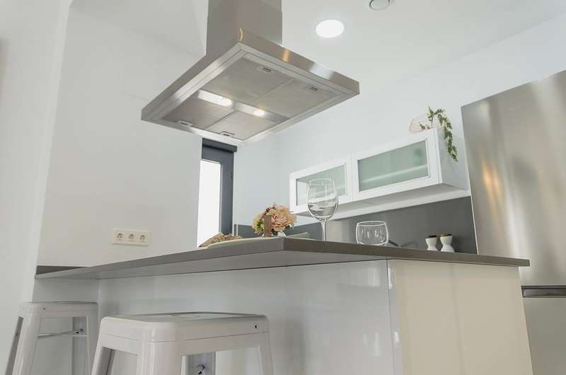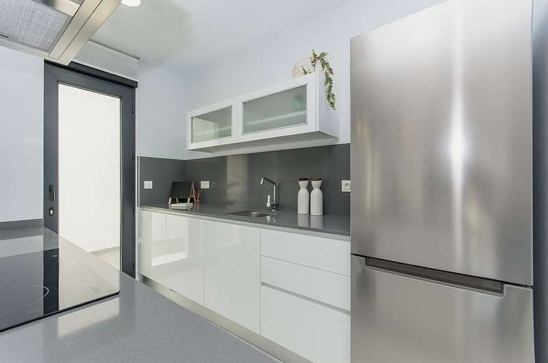 The ground floor of these villas comprises a double bedroom with a fitted wardrobe, large French windows that bathe the space in natural light, a bathroom with a walk-in shower, an open-plan fully equipped kitchen, a spacious dining area, and a generous living area that leads out to a sun terrace.