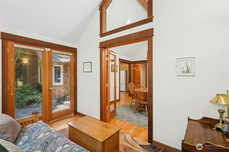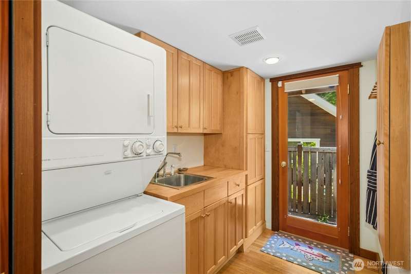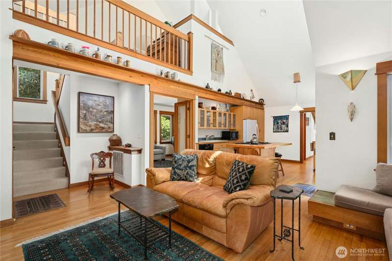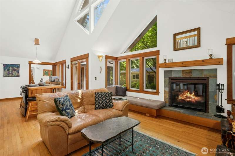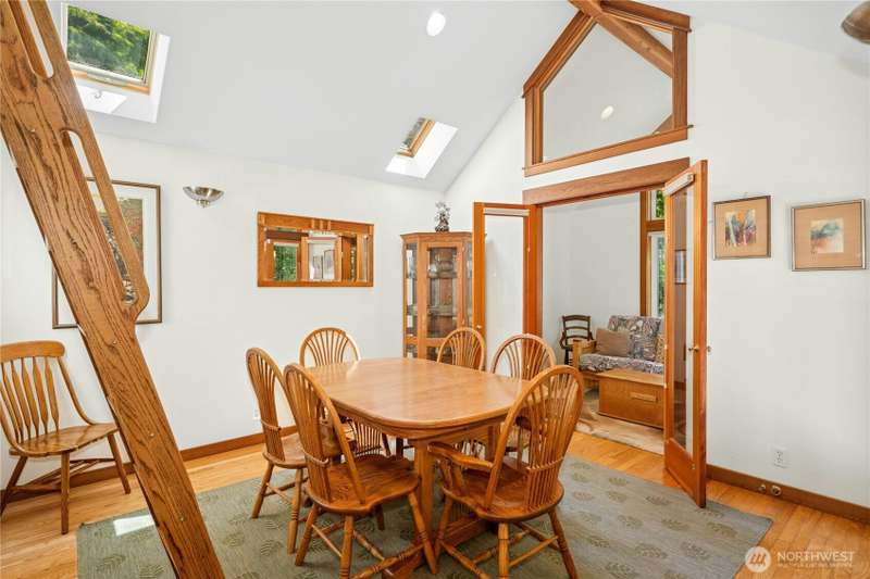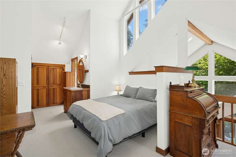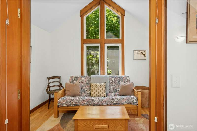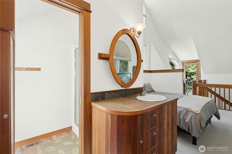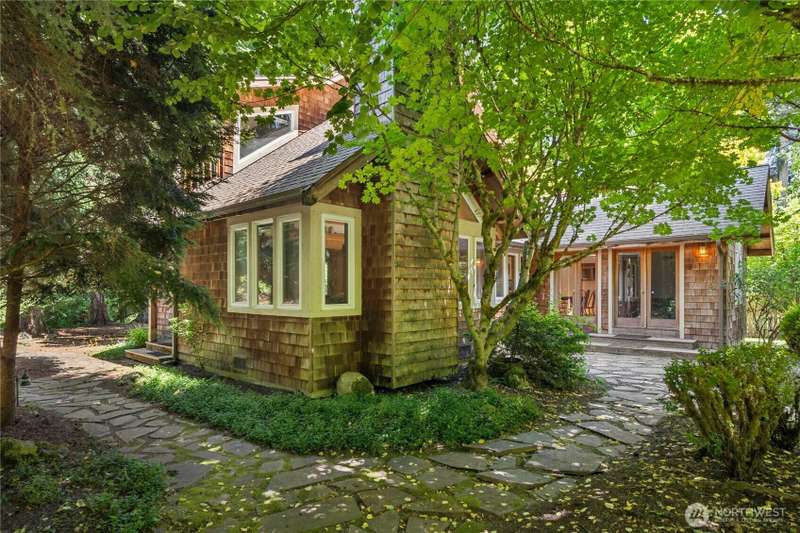Tucked among the trees near the beach at Fletcher Bay, this picturesque custom-built home is full of charm. Warm wood tones, divided light windows and a cozy wood-burning fireplace add warmth and character. The well-equipped kitchen features an island and opens to a large dining area. Two bedrooms, a den & loft offer flexibility and fun. One ensuite bedroom is upstairs with a cute balcony & tree-lined views. The other bedroom, bath & loft are on the main level along with the den. You’ll also enjoy the outdoors with beautiful stone paths & patio. This unique retreat is the perfect mix of cozy and convenient. A local store and restaurant are just 1/2 mile away, and a quick drive or nice bike ride to all the best Bainbridge shops and cafes.
