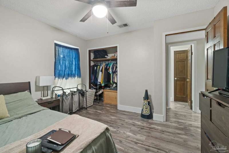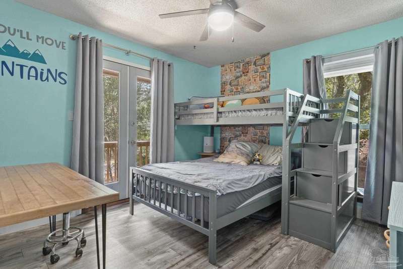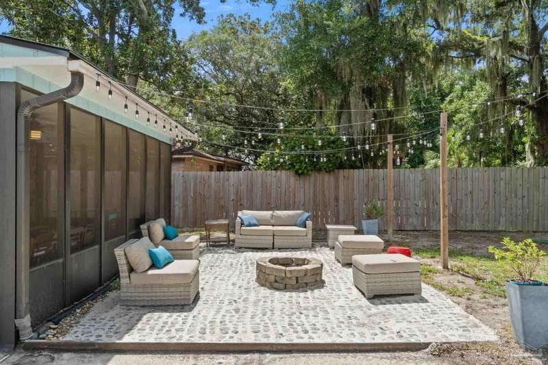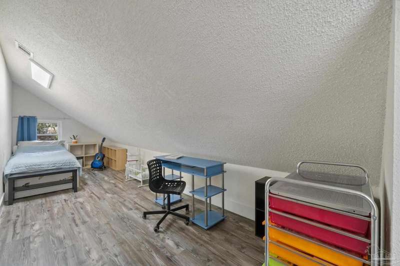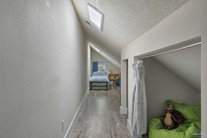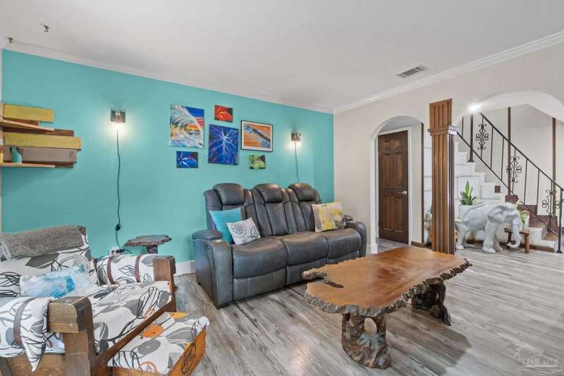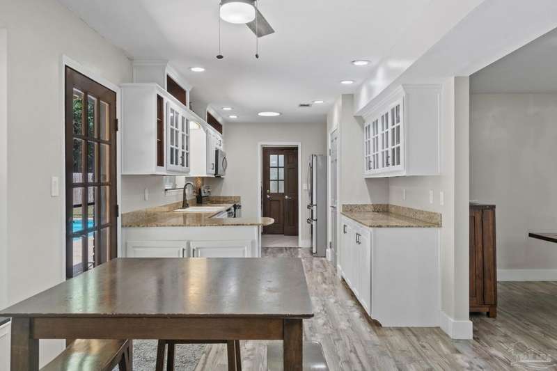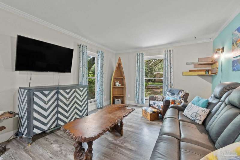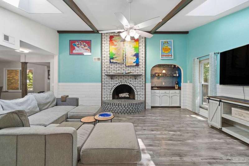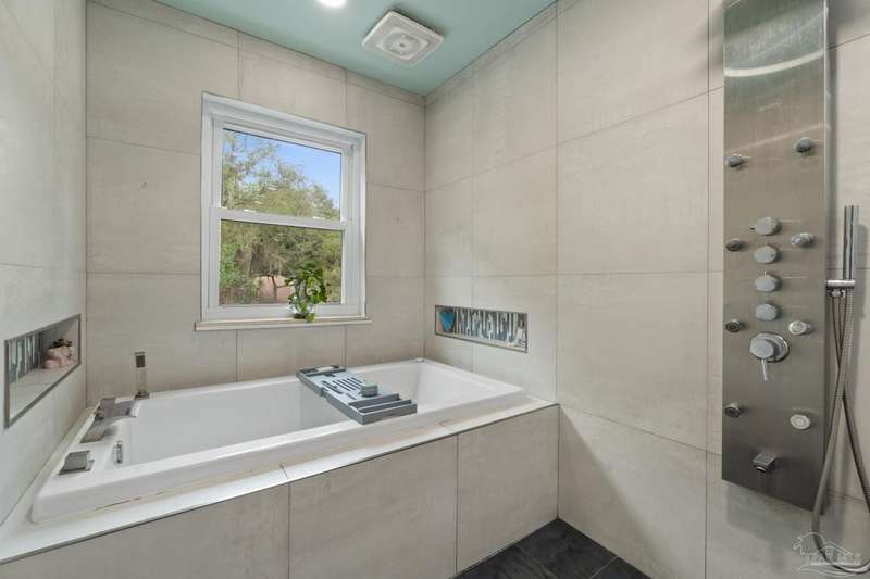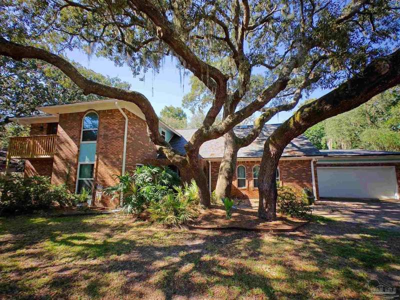 Discover charm and elegance in this 4-bedroom, 3-bathroom Gulf Breeze salt water pool home, designed for unforgettable gatherings and ask about the newly added seller concessions towards upgrades. Situated among majestic mature Live Oak trees, this home boasts a large L-shaped pool, a spacious outdoor patio, and a 20x10 screened porch for year-round enjoyment. Step inside to the light and bright living space with vaulted ceilings, skylights, a cozy fireplace, ship lap accents, and a stylish wet bar, which opens seamlessly into the eat-in kitchen featuring granite countertops, and ample cabinetry with pantry. The first floor also offers a formal dining area with a view of the courtyard entry, an additional cozy family room, a bedroom next to a full bathroom, and a private office space with exterior entry. Ascend the curved staircase to find two inviting guest bedrooms, each with access to a relaxing front balcony. The expansive primary suite, also on the second level, features a private balcony with serene views of the fenced backyard and sparkling pool, plus a luxurious newly renovated en-suite bathroom. You'll also find an additional bonus space, suitable for more storage or game room. With a new roof, impact windows, generous room sizes, abundant closet space, additional storage, and a two-car garage, this home combines practicality with sophistication. Don't miss your chance to own this entertainer's paradise in Gulf Breeze!