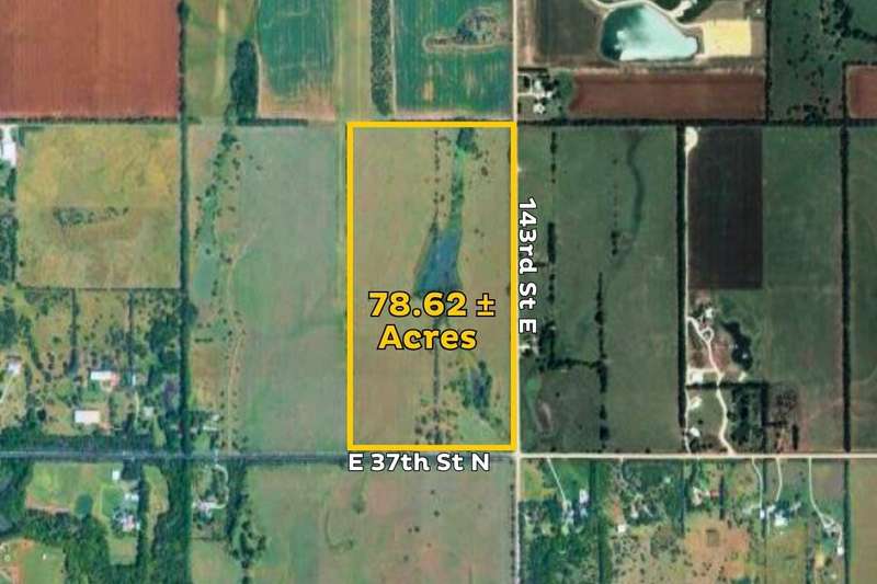 Land for Sale! Located at the North West corner of 37th Street North and 143rd Street East in Wichita, this 78.62 acre tract offers an excellent blend of convenience and open space. Just minutes from shopping, dining, healthcare, and other North East Wichita amenities, the property provides a quiet country setting within reach of city conveniences. Its size and layout make it suitable for a range of future development. With two ponds on-site, it also offers appealing recreational opportunities such as fishing, wildlife habitat, or creating a private retreat. Situated within the desirable Andover School District, this property combines location, flexibility, and lifestyle appeal.