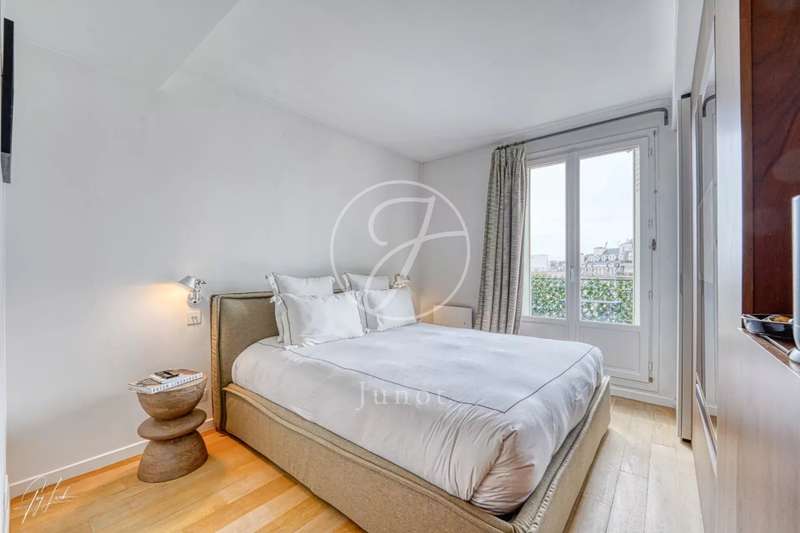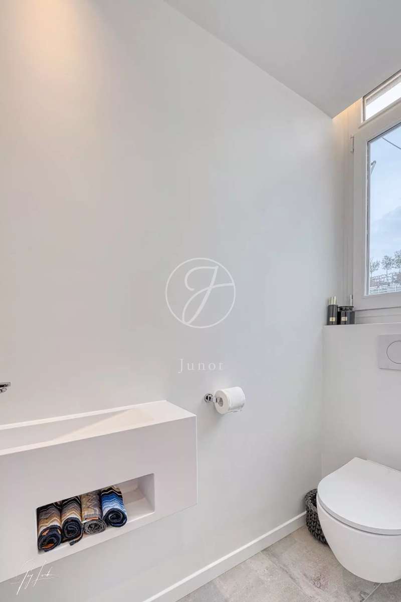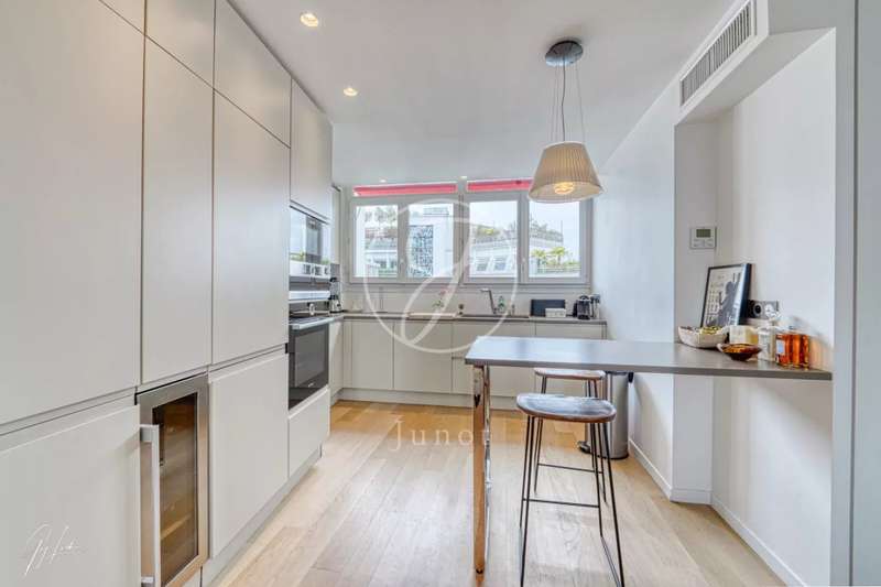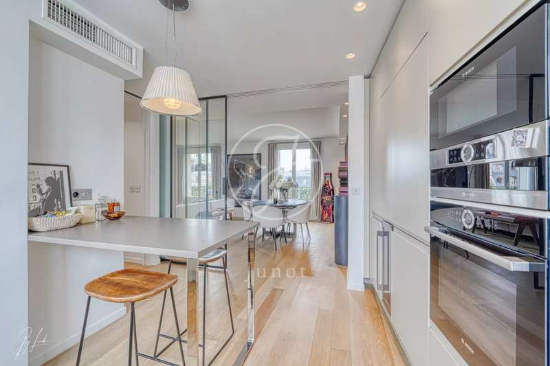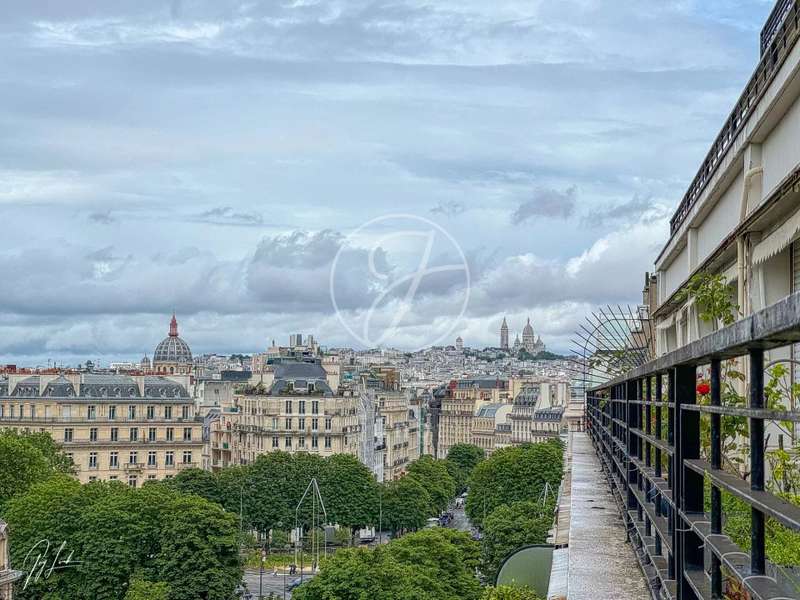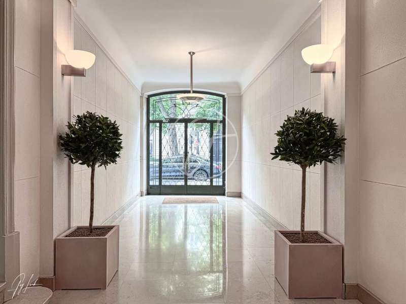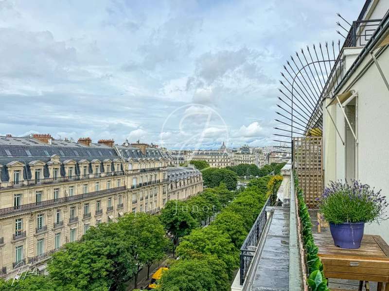 Ideally located on the prestigious Avenue Montaigne. On the seventh and last floor, with elevator, of a luxury building with guarded and secure access. This 104.59sqm loi Carrez apartment has been entirely renovated by an architect. Air-conditioned, it comprises an entrance hall, a living-dining room opening onto a large balcony, a master suite with dressing room and bathroom, a second bedroom, a shower room and a guest toilet. A cellar completes this rare property. A double garage is available at extra cost.