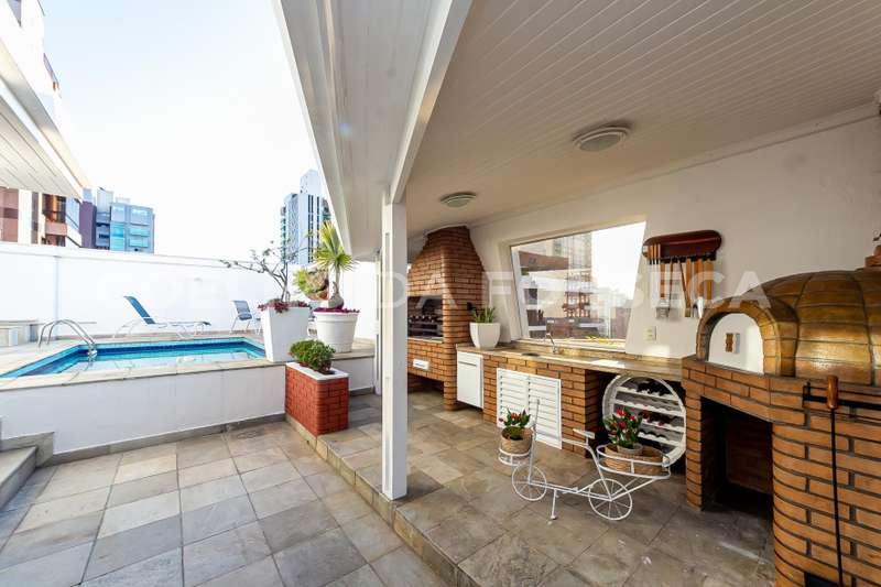 Cobertura com piscina que oferece muita privacidade. Área aberta em todo o contorno do piso superior, o que dá a sensação de uma casa, com área gourmet que contempla churrasqueira e forno de pizza.Ainda no piso superior,há um living que serve o espaço gourmet,lavabo, home theater, sala para fitness e adega. No piso inferior temos 3 suítes,a máster com walk in closet, living para 3 ambientes com lareira, outro lavabo, sala de jantar, sala de almoço e cozinha com despensa.Terraço com vista ampla e agradável. Dependência de empregada e área de serviço espaçosa. São 3 vagas de garagem e depósito. Confira e surpreenda-se!
