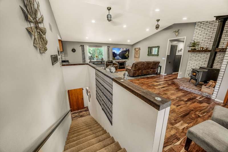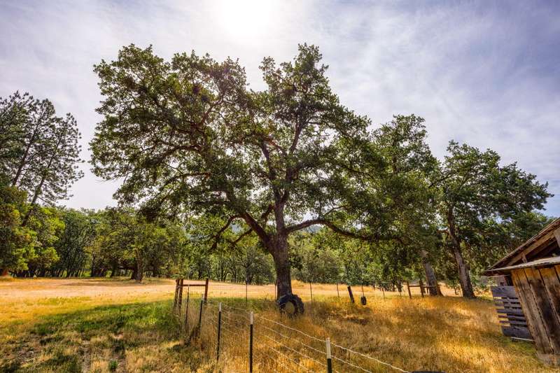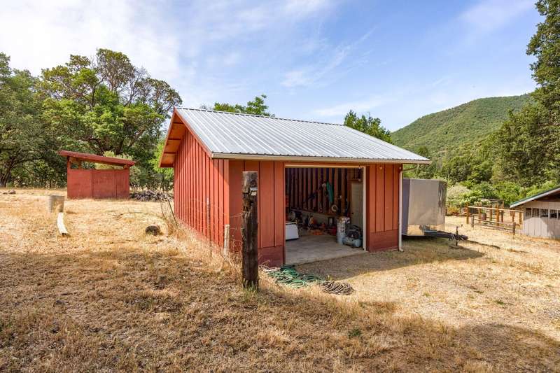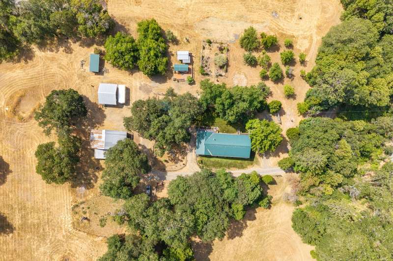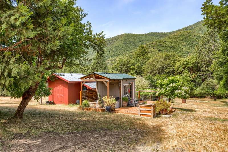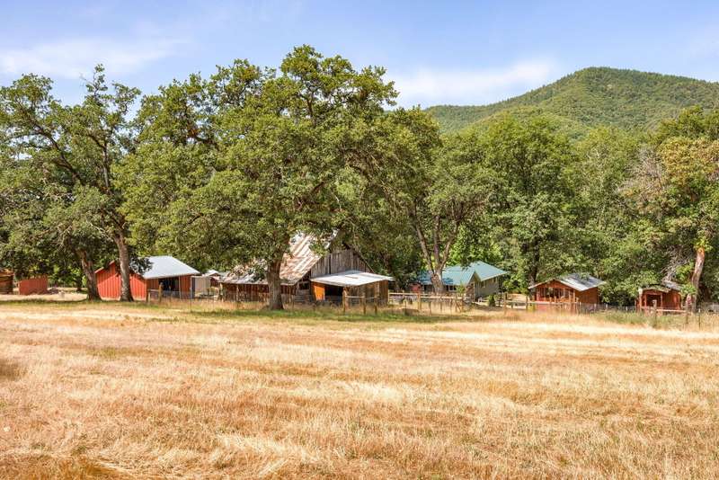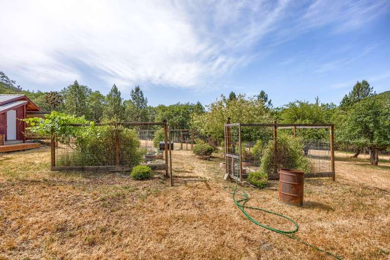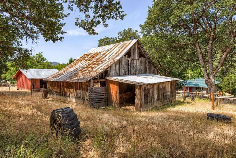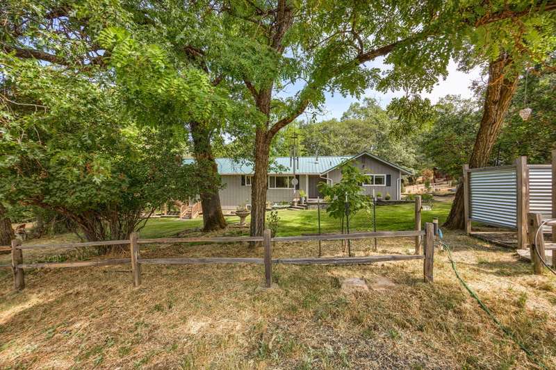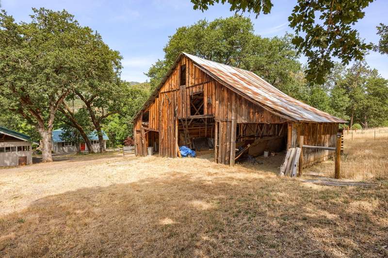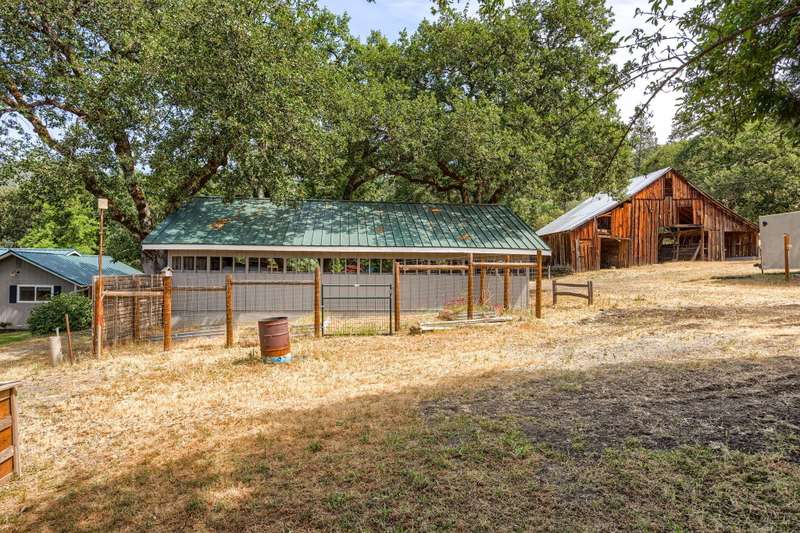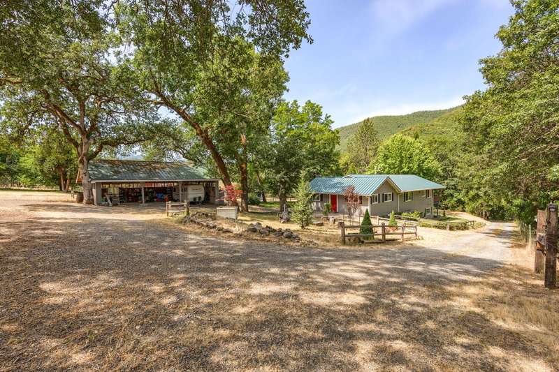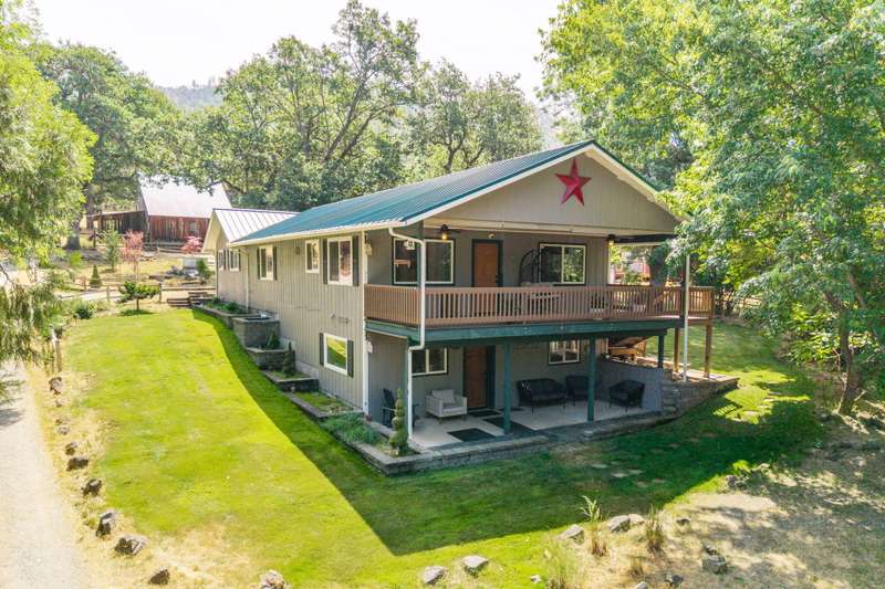Beautiful private location on 10.82 acres w/fruit trees, pasture, fence garden and many outbuildings including a 40x20 3 car carport, 24x24 shop/garage, large old barn, chicken coop and tool shed. Separate office/studio w/vaulted ceilings, insulated w/mini split HVAC, covered patio and a deck overlooking garden area. Property sits behind rolling Hills of Del Rio Vineyard. Home was completely built from the studs in 2006! Recent updates include exterior paint, shutters, stone countertops, mini split's, flooring, stainless steel appliances, including refrigerator. Open floor plan to great room w/vaulted ceilings and certified wood stove. Beautiful large covered deck to enjoy the views! Main floor has 3 bedrooms, 2 primary suites, 1 w/walk-in closet and soaking tub. 3rd bedroom + downstairs a separate 1/1 living quarters w/large covered patio and exterior door into living room, mini kitchen, wet bar and walk-in pantry that can be a great set up for extra living or perfect in law set up.