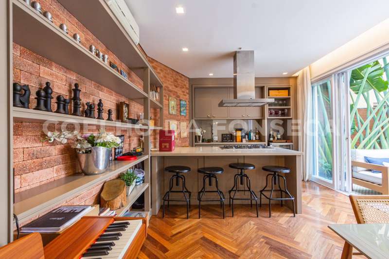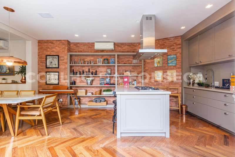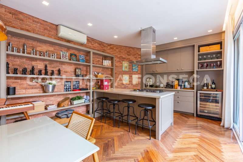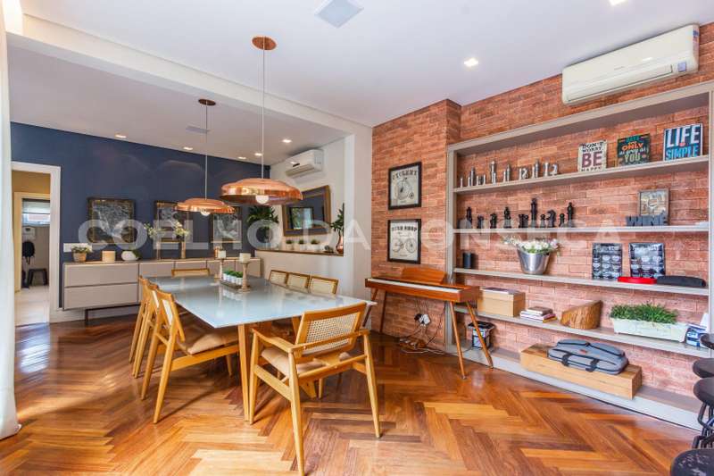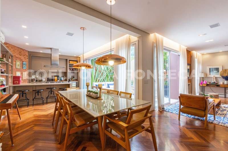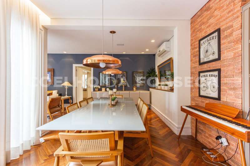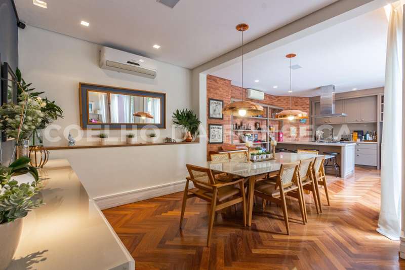 A sala de jantar integra-se com o espaço gourmet e a varanda, proporcionando uma área propícia para o convívio da família