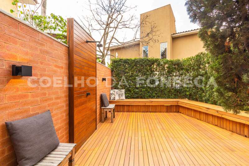 Solarium com amplo deck de madeira com chuveirão para os dias de sol.