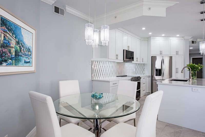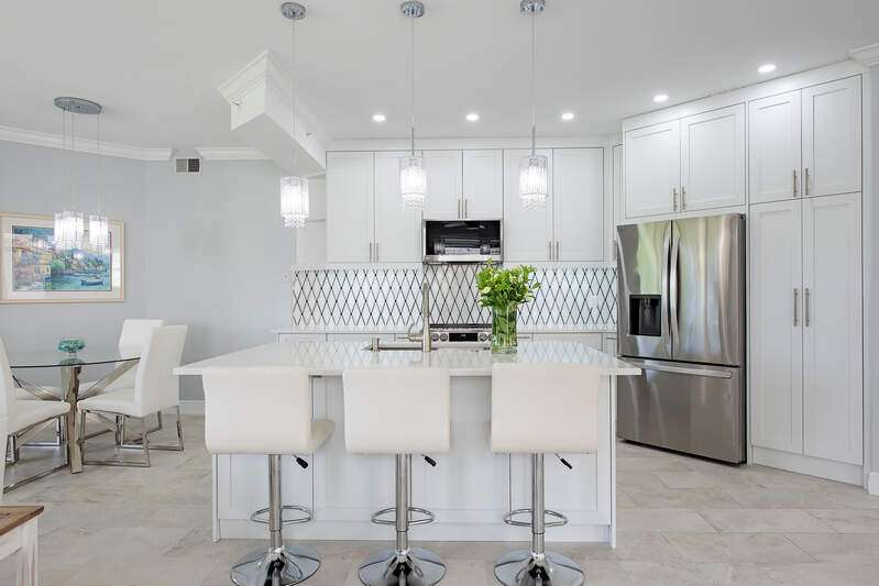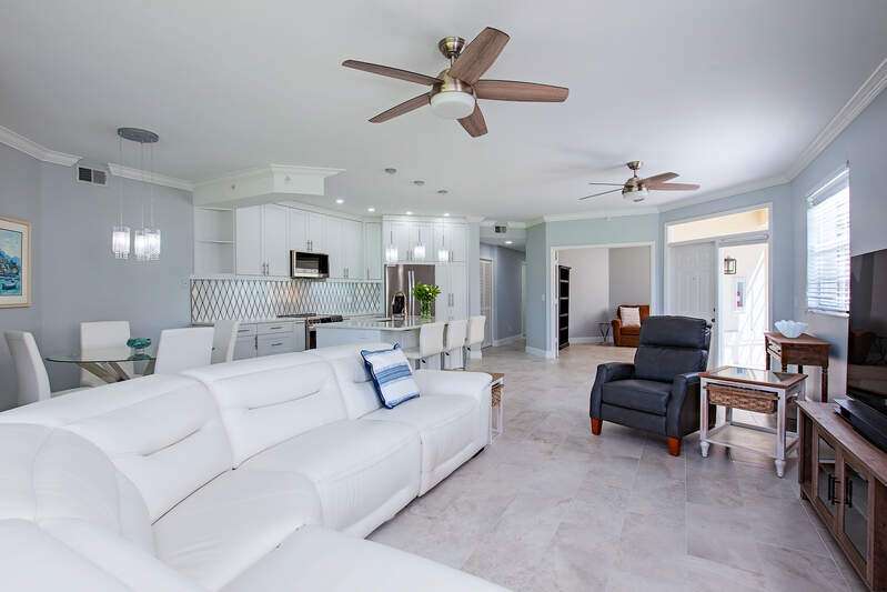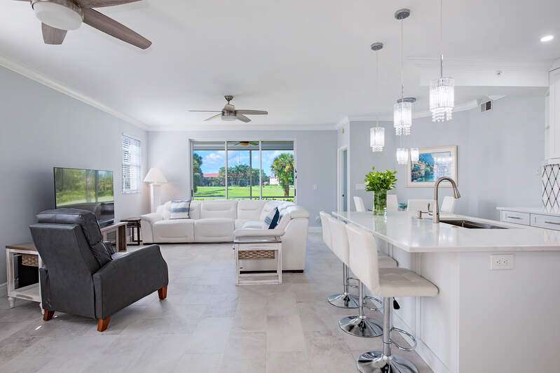 Beautifully updated, furnished and move-in ready! Enjoy a full golf membership with this first floor corner coach home with a one-car garage. This spacious and open two bedroom plus den floor plan has been smartly remodeled with tasteful contemporary selections and just a touch of bling. The pretty white kitchen has sleek new Shaker-style cabinets, Quartz counter-tops and newer appliances. The bathrooms have been updated to showcase the same clean modern style. The southwest facing screened lanai captures peaceful golf course views and pleasing sunsets. The sub-community of Glenmoor Greens II offers pickleball, tennis and a community pool for neighborhood gatherings in a very friendly corner of Glen Eagle Golf and Country Club. Glen Eagle Golf and Country Club is an outstanding bundled golf value complete with a scenic 18-hole golf course, clubhouse with full restaurant, pool, tennis courts, fitness center and the Divot Cafe. Glen Eagle is pet friendly and perfectly situated close to downtown dining, spectacular shopping, and beautiful beaches.