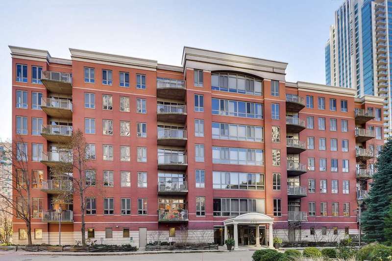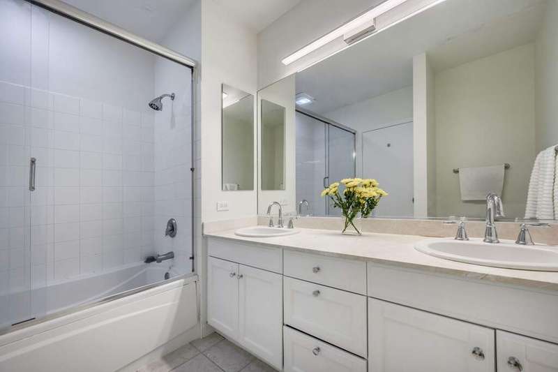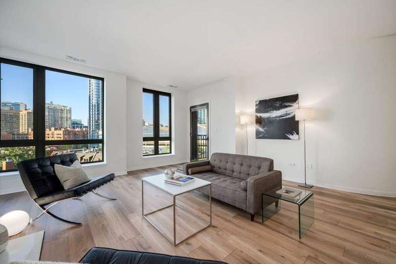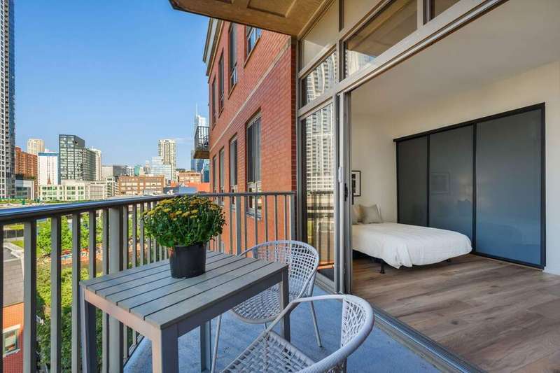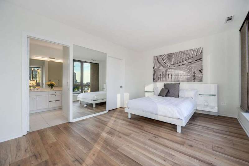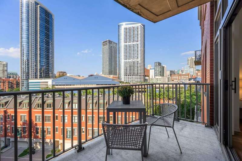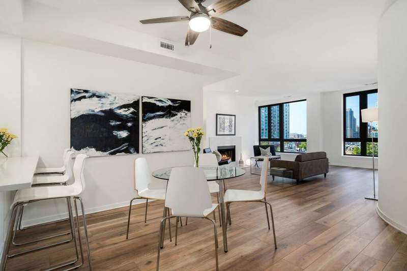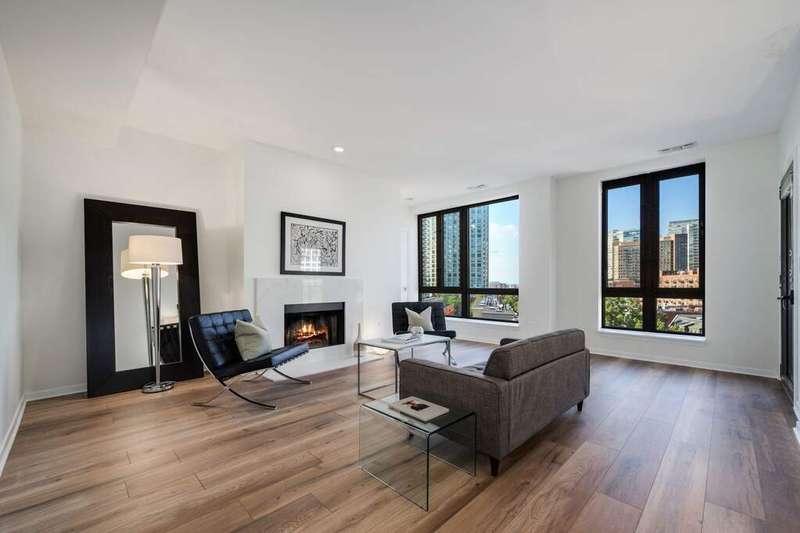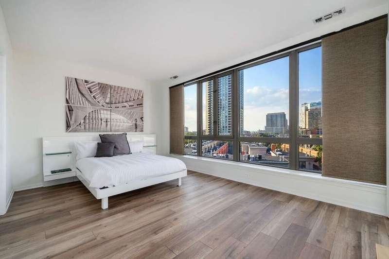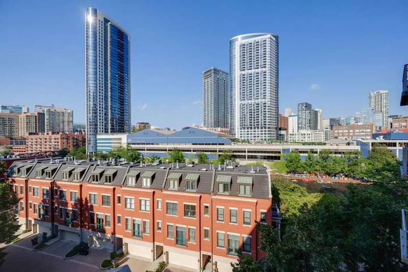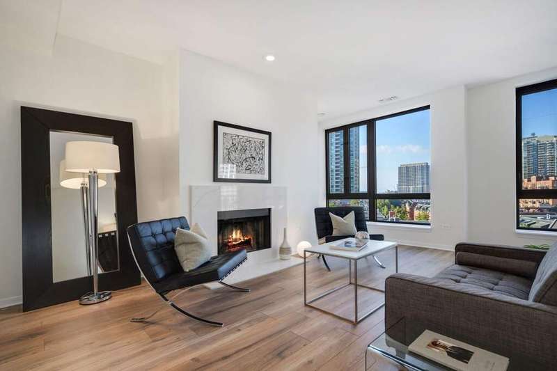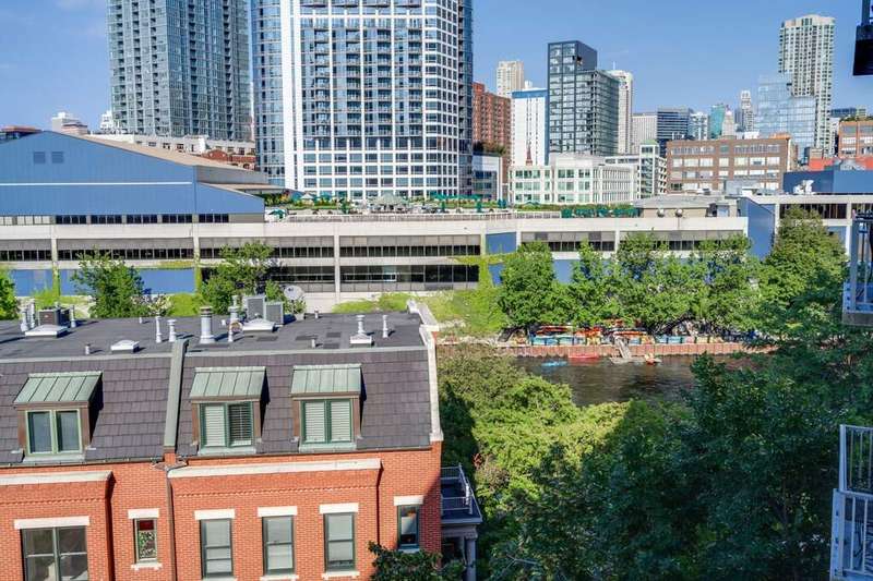 Rare offering with spectacular views clearing the Kinzie Park Townhomes and offering beautiful natural north/east light. The split bedroom plan is exceptionally wide and offers seamless in/out living spaces connected to the oversized balcony. The condo has been updated with seamless flooring, new kitchen countertops, lighting details and fresh white cabinetry. The wood burning fireplace has been refreshed with a new beautiful surround and is ready to enjoy during Chicago winter evenings. No space is wasted in this unique layout. Unit features: individual gas forced air / ac with central humidification, gas cooking, open plan kitchen, counter/bar seating , wall of windows and endless storage. First class amenities are standard at Kinzie Park including free guest parking, lush landscaped private common grounds, pool, health club, gated entry, receiving and party/meeting room. Storage locker is included. Heated indoor garage parking is available for an additional $25,000.