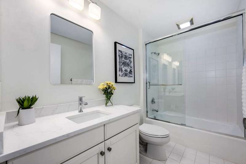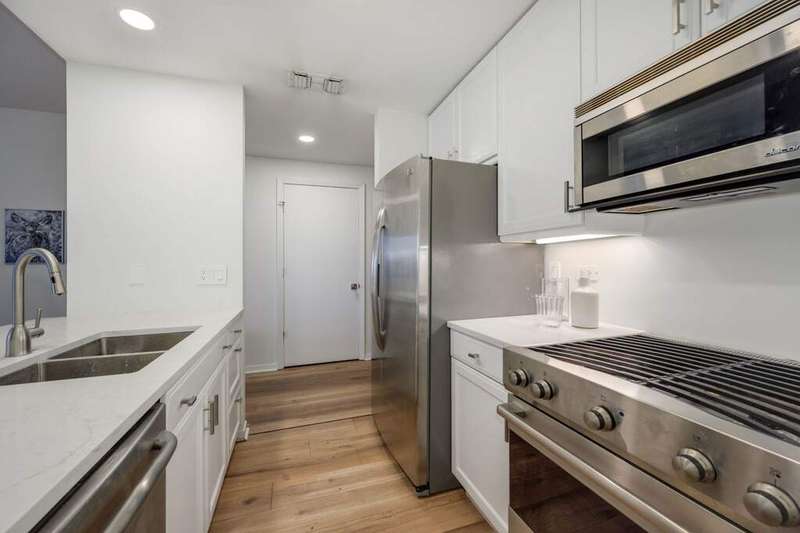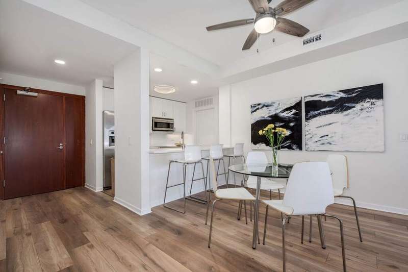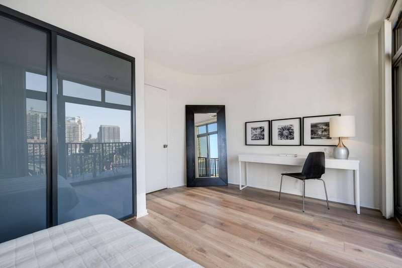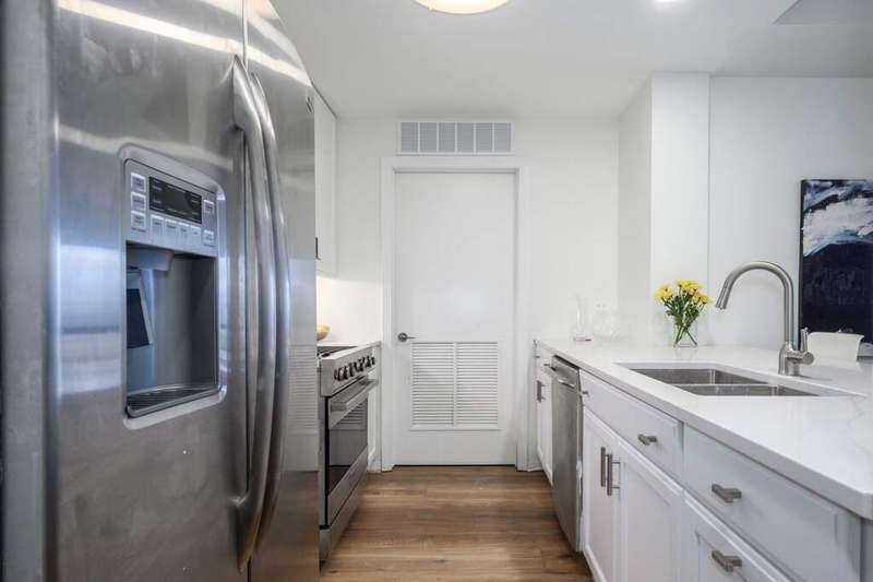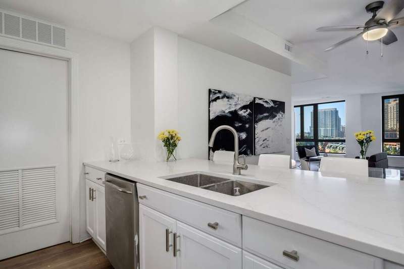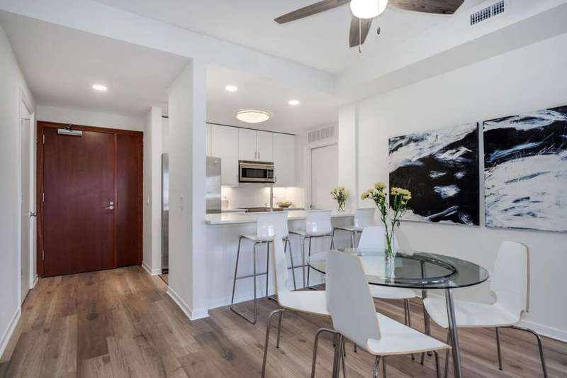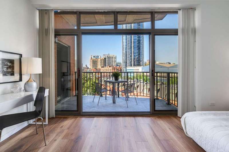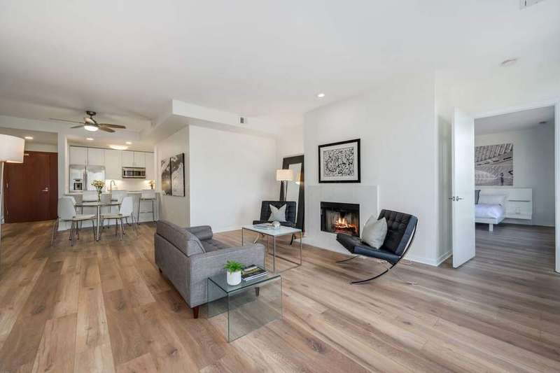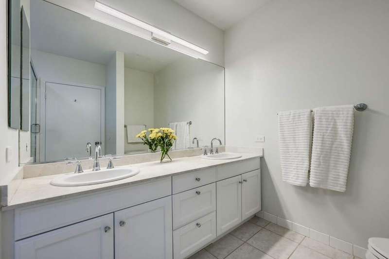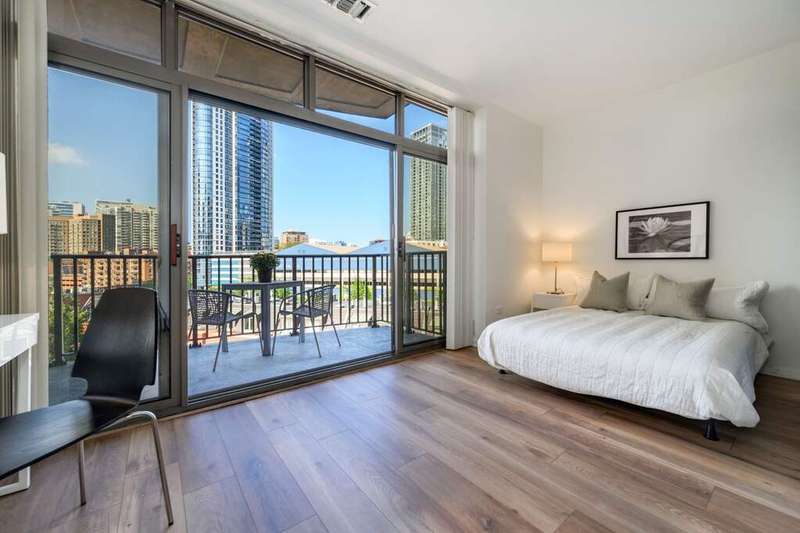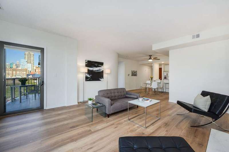 Rare offering with spectacular views clearing the Kinzie Park Townhomes and offering beautiful natural north/east light. The split bedroom plan is exceptionally wide and offers seamless in/out living spaces connected to the oversized balcony. The condo has been updated with seamless flooring, new kitchen countertops, lighting details and fresh white cabinetry. The wood burning fireplace has been refreshed with a new beautiful surround and is ready to enjoy during Chicago winter evenings. No space is wasted in this unique layout. Unit features: individual gas forced air / ac with central humidification, gas cooking, open plan kitchen, counter/bar seating , wall of windows and endless storage. First class amenities are standard at Kinzie Park including free guest parking, lush landscaped private common grounds, pool, health club, gated entry, receiving and party/meeting room. Storage locker is included. Heated indoor garage parking is available for an additional $25,000.