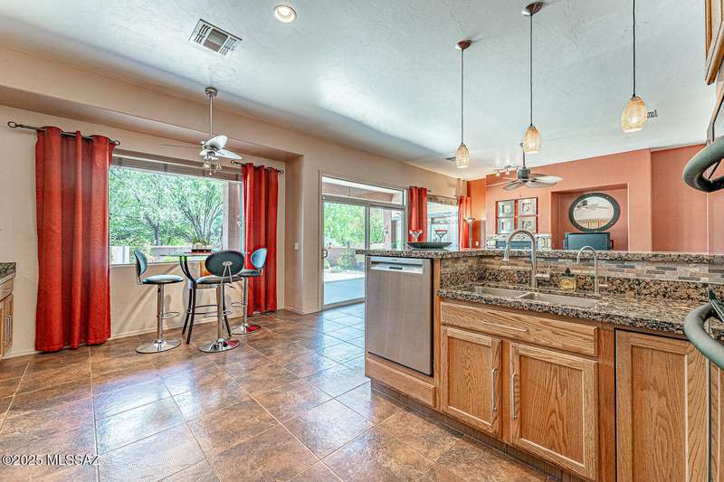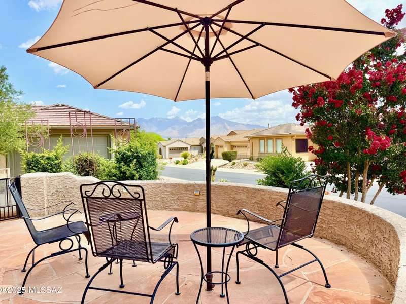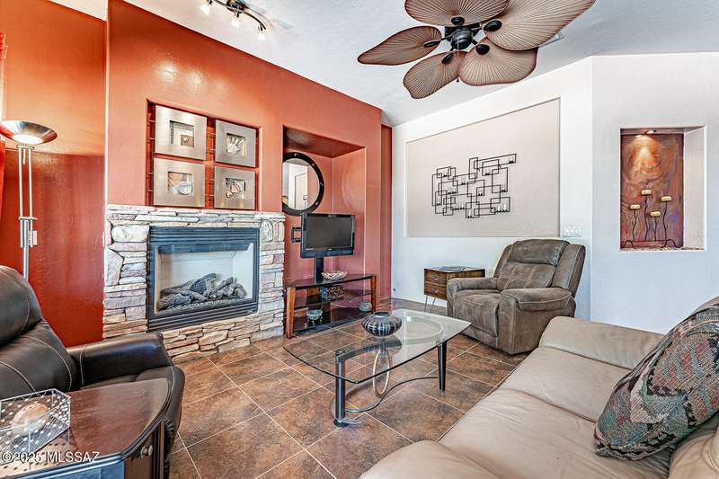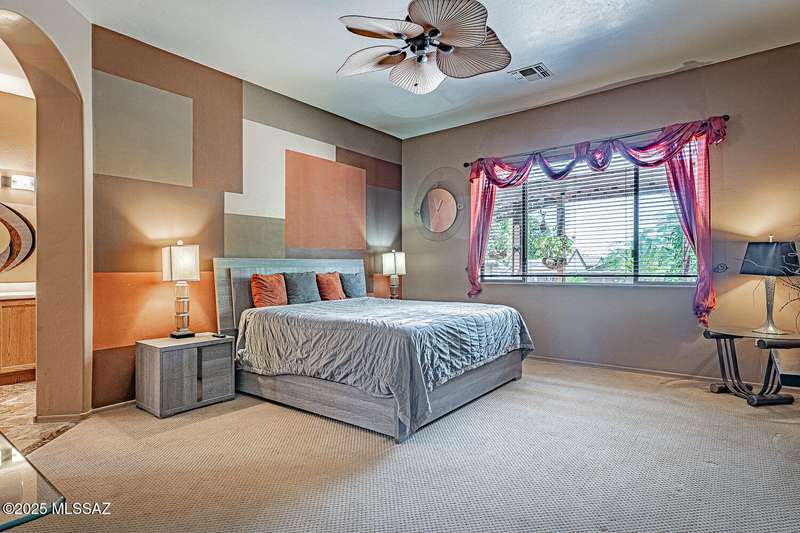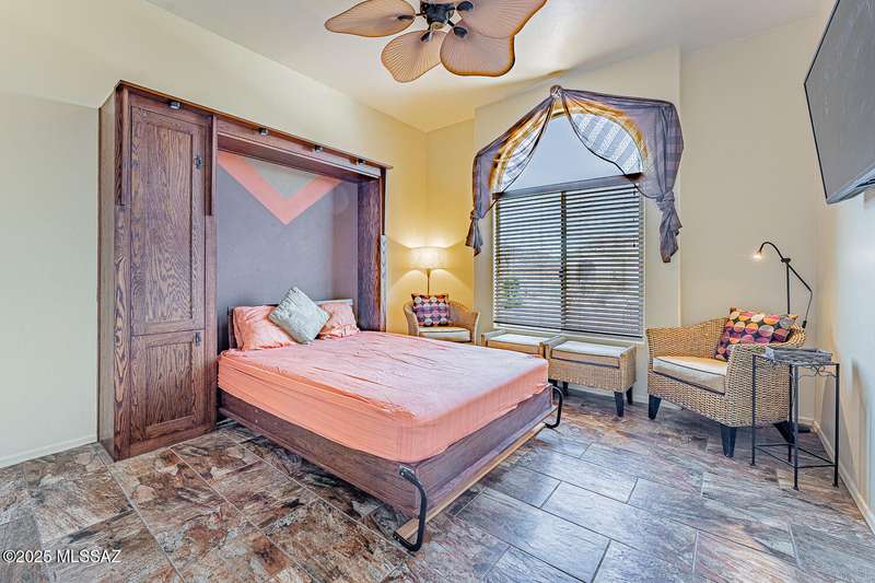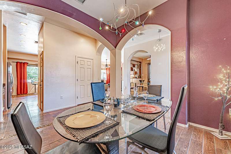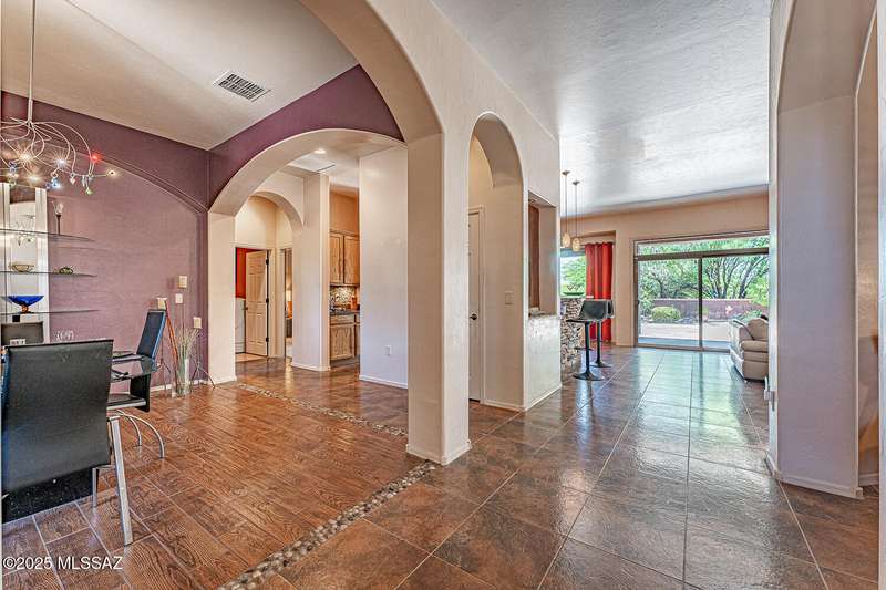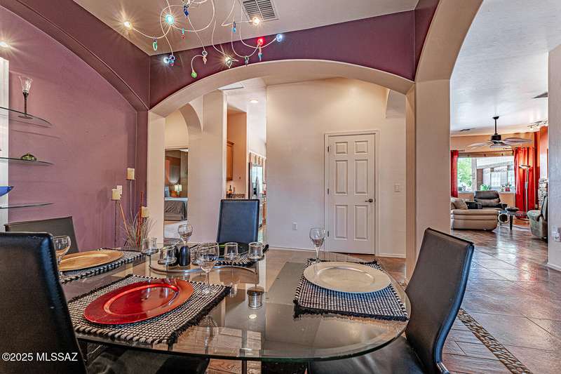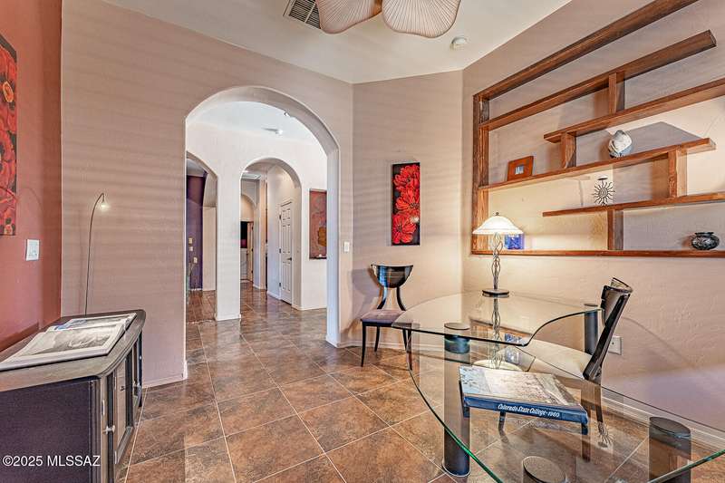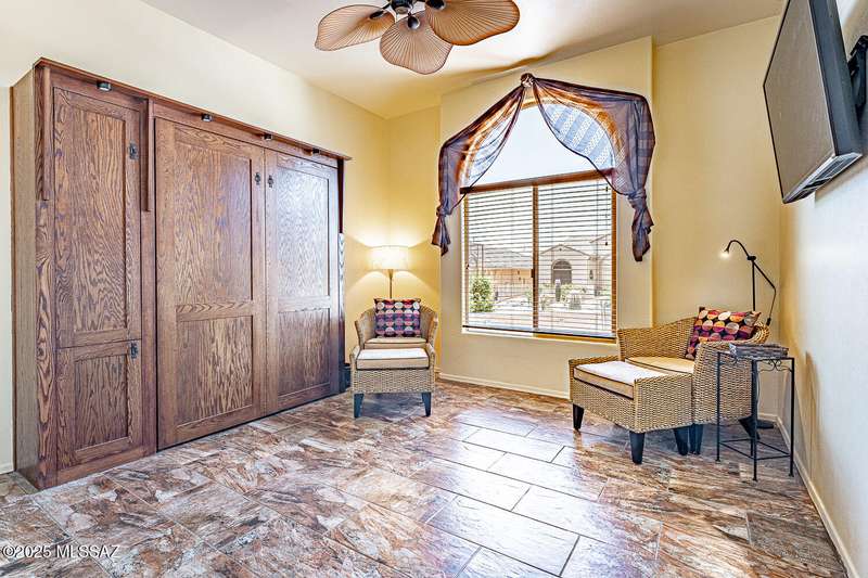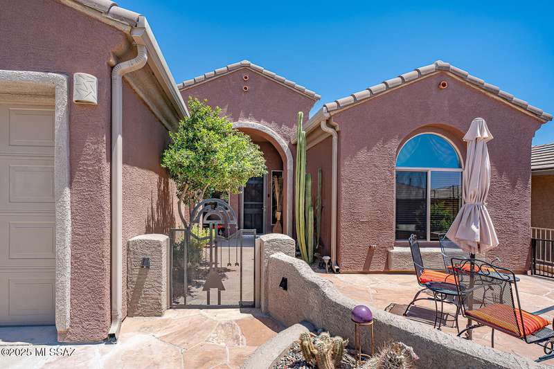 Step into charm! Enjoy stunning Elephant Head views from your private courtyard, then relax in a lush backyard with mature landscaping and a sunset-ready patio. Inside, tile flows through bright, freshly painted open spaces featuring a formal dining room and oversized office. The kitchen offers granite counters, a raised dishwasher, roll-out shelves, and a butler's pantry. The split floorplan includes a front guest room with wall bed and nearby bath, while the private primary suite boasts a modern walk in shower and soaking tub along with a custom closet. A 4ft-extended 3-car garage adds additional space and versatility. Every detail of this home has been touched with a contemporary accent and unique updates. Gated, peaceful, and near GVR--your next magical chapter awaits