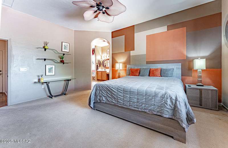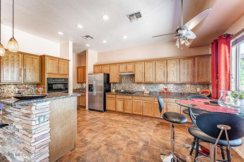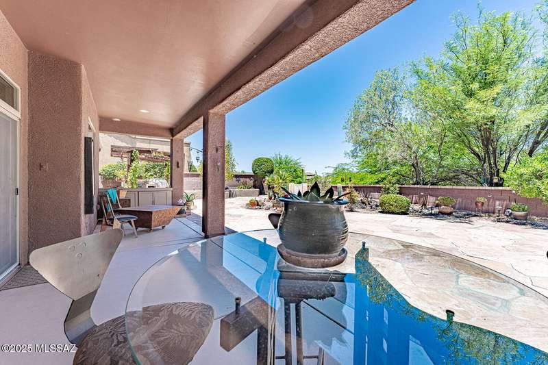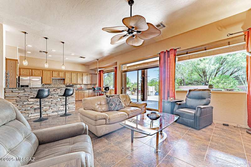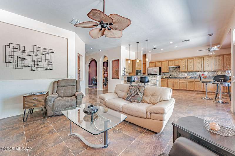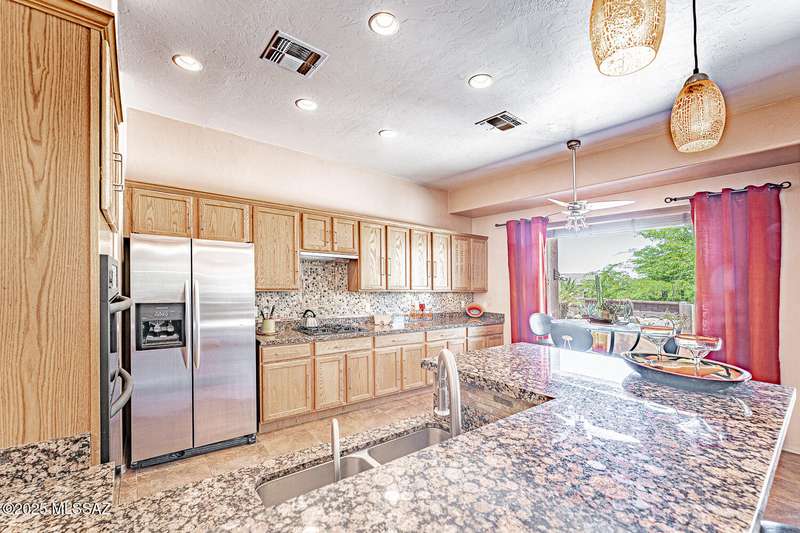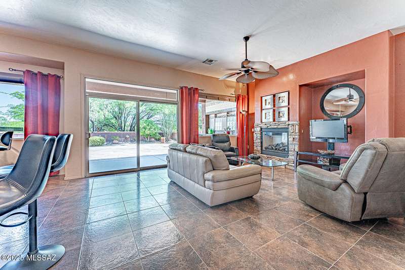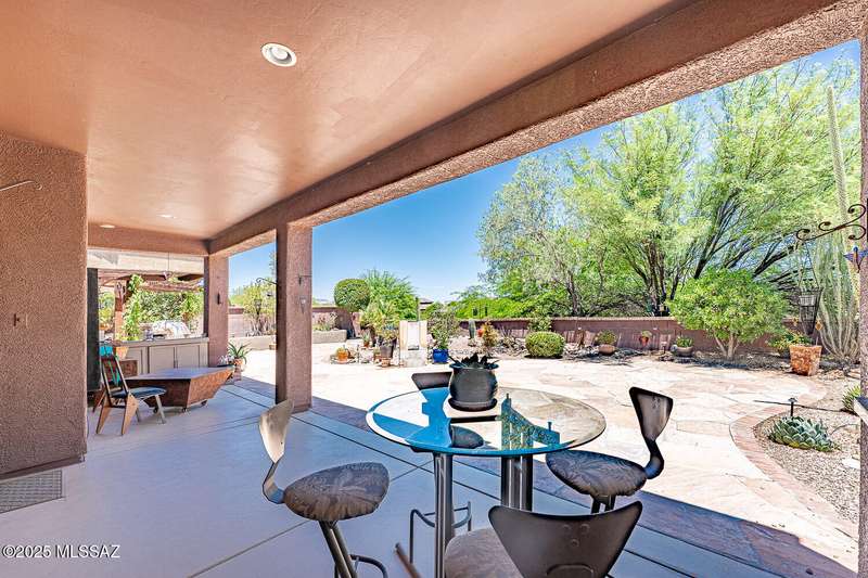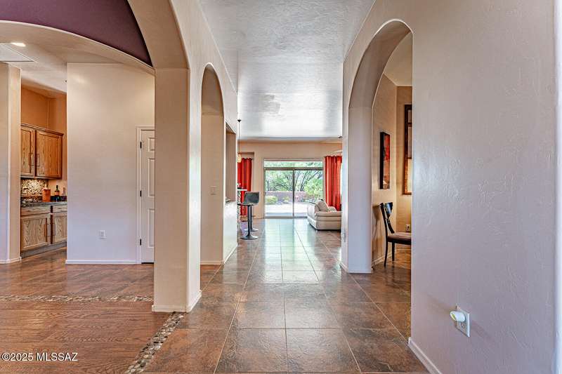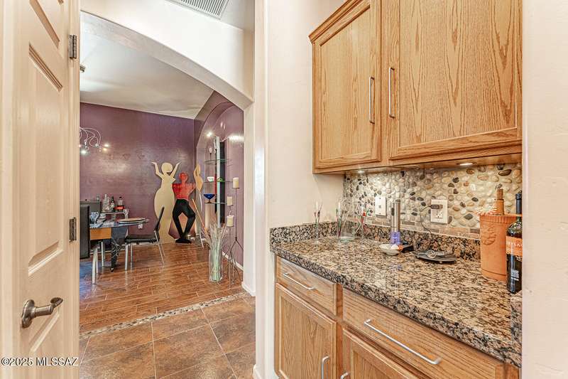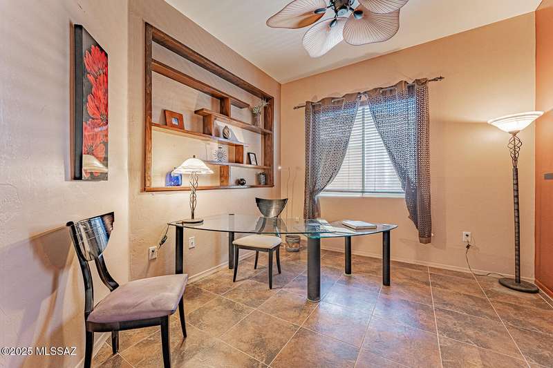 Step into charm! Enjoy stunning Elephant Head views from your private courtyard, then relax in a lush backyard with mature landscaping and a sunset-ready patio. Inside, tile flows through bright, freshly painted open spaces featuring a formal dining room and oversized office. The kitchen offers granite counters, a raised dishwasher, roll-out shelves, and a butler's pantry. The split floorplan includes a front guest room with wall bed and nearby bath, while the private primary suite boasts a modern walk in shower and soaking tub along with a custom closet. A 4ft-extended 3-car garage adds additional space and versatility. Every detail of this home has been touched with a contemporary accent and unique updates. Gated, peaceful, and near GVR--your next magical chapter awaits