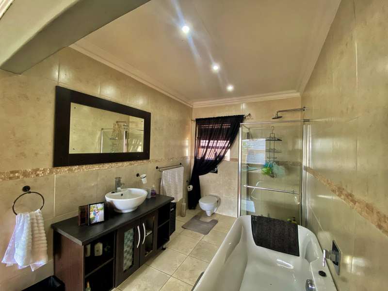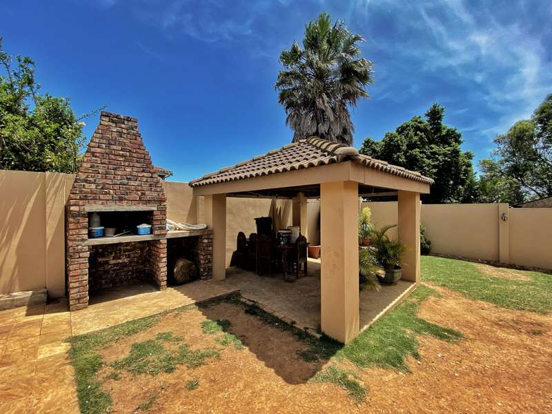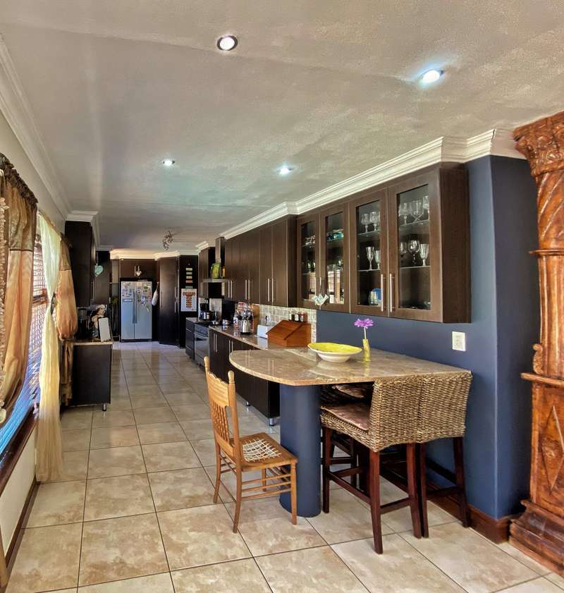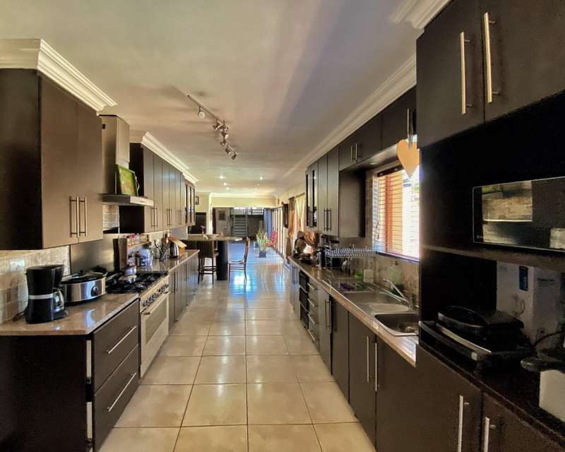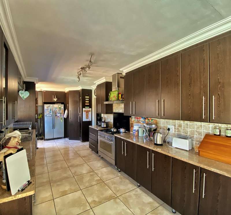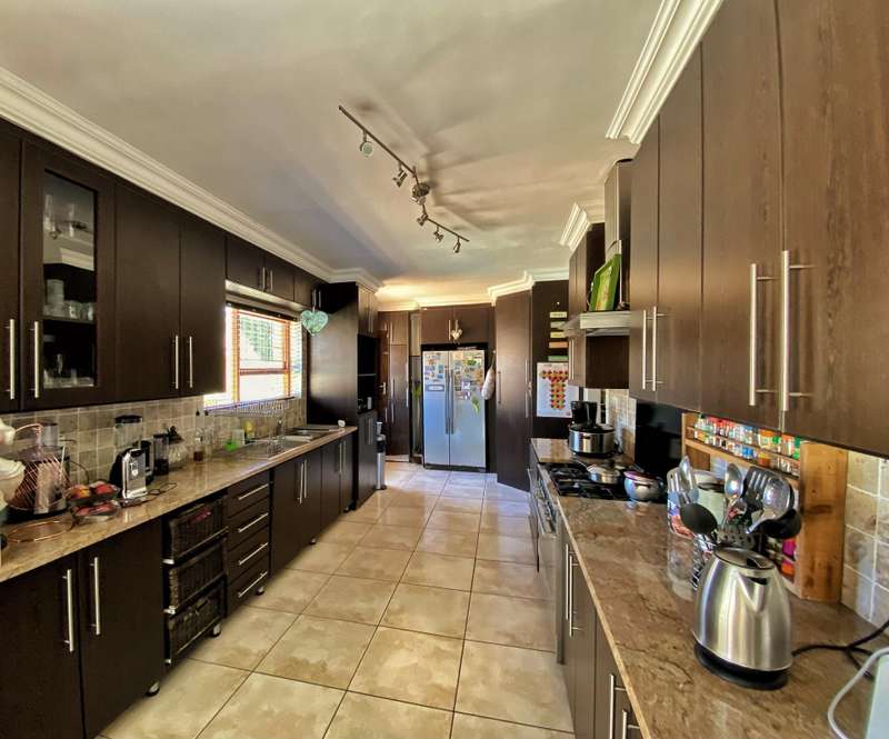 Introducing a modern and stylish property, this double-storey located on a corner plot is an ideal choice for those seeking contemporary living. Nestled in the highly sought-after area of Strelitzia Park, this property offers a captivating ambiance. Upon entering, you are greeted by grand wooden double doors that lead you into an open plan lounge, dining room, and a beautifully designed kitchen. The ground floor boasts three spacious bedrooms, one of which features a full en-suite bathroom. Additionally, a family bathroom and a separate toilet are conveniently located on this level. The ground floor seamlessly connects to the outdoor area, where stacking doors open up to reveal a sparkling pool and an inviting outside braai area. For those who enjoy indoor entertainment, an indoor braai with a bar area is also available. Ascending to the second floor, you will be captivated by the elegant wooden stairs and a stunning chandelier. Here, you will discover the expansive main bedroom, complete with a walk-in closet and a luxurious full en-suite bathroom. Additionally, a TV room and a guest half-bathroom is thoughtfully included on this level. Stacking doors open up to a balcony that overlooks the picturesque pool and braai area, providing a serene setting for relaxation. The property is fully enclosed, providing privacy and security. A double garage, accessible via remote control, offers convenient parking. Furthermore, an alarm system is in place to provide an added layer of security. To enhance comfort, the property is equipped with air conditioning. Two 5000 litre water tanks are located on the property, ensuring a reliable water supply. A convenient washing line is available for your laundry needs, and the shed provides extra storage space. To truly appreciate the beauty and elegance of this property, I encourage you to arrange a private viewing.