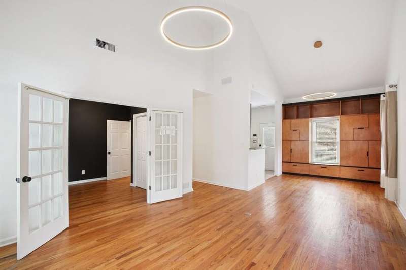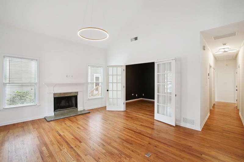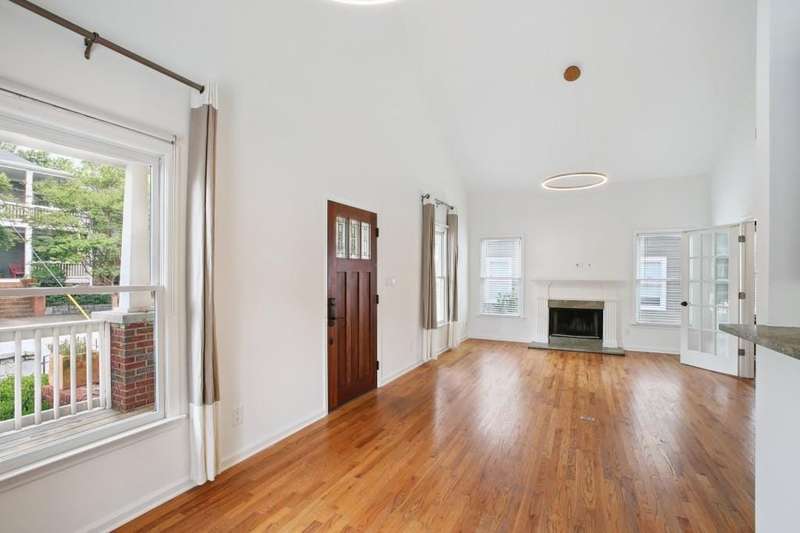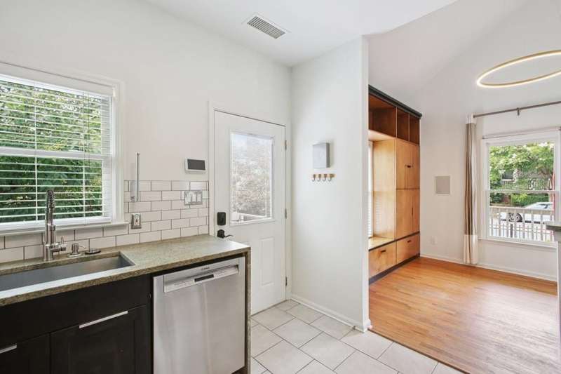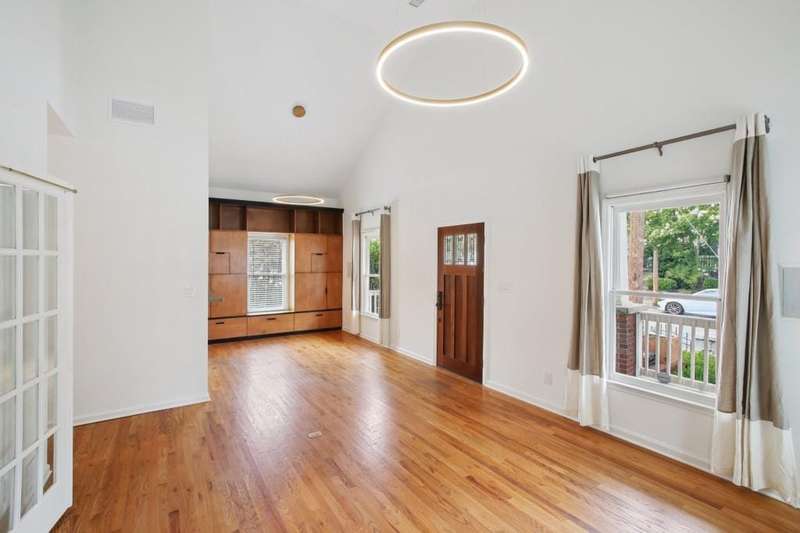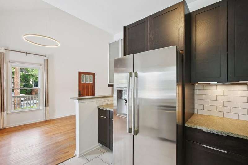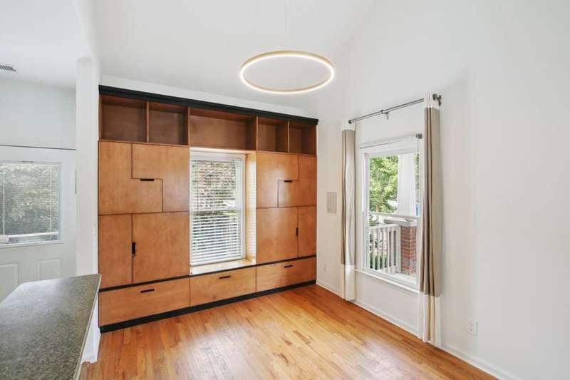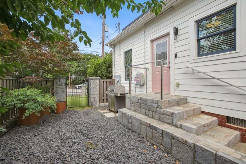 Welcome to this beautifully updated home combining charm, comfort, and modern sophistication. Featuring 3 bedrooms and 2 bathrooms (with the third bedroom currently serving as a home office), this residence offers an ideal floorplan with soaring vaulted ceilings in the living and dining rooms that create an open, airy ambiance. The living room boasts a cozy gas fireplace, while the dining area is enhanced with sleek, modern built-ins that provide both style and function. Gleaming hardwood floors run throughout, leading you to the renovated kitchen, complete with Bosch and Electrolux stainless steel appliances, granite countertops, and under-cabinet lighting. Retreat to the spa-like primary suite featuring a luxurious, stepless walk-in frameless glass shower with dual showerheads and elegant floor-to-ceiling tile. The hall bath impresses with new tilework and a modern bidet. Elfa closet systems from The Container Store add custom storage solutions throughout the home. Additional highlights include a dedicated laundry area with full-size washer and dryer, a welcoming covered front porch perfect for morning coffee, and a secure, black wrought iron and granite perimeter fence. The beautifully landscaped side courtyard is a private oasis, complete with crab orchard pavers, slate chips, galvanized steel and copper-wrapped planters, and a natural gas grill - perfect for entertaining or relaxing in peace.