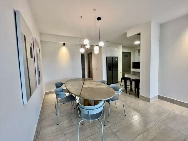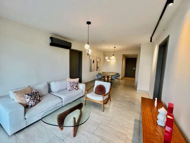 Spacious and modern, fully furnished apartment for sale in the newly constructed EXPLORA, located in the exclusive residential area of Panama Pacifico surrounded by nature with all necessary amenities just minutes away. This brand new apartment has 2 bedrooms, 2 bathrooms, a guest bathroom, kitchen, living room, dining room, laundry room and a spacious balcony with a spectacular view of the natural surroundings. Each bedroom has its own private bathroom and the master bedroom with a walk-in closet, bathroom with double sink and balcony. The kitchen boasts a modern, open style concept, fully equipped with quartz countertops and many plenty of cabinets. Explora offers a spectacular social area with swimming pool, water park, event rooms, BBQ areas, ping-pong and pool table, rest area with television and sofas and a fully equipped, state of the art gymnasium.