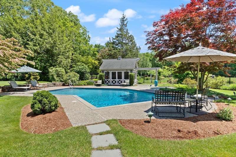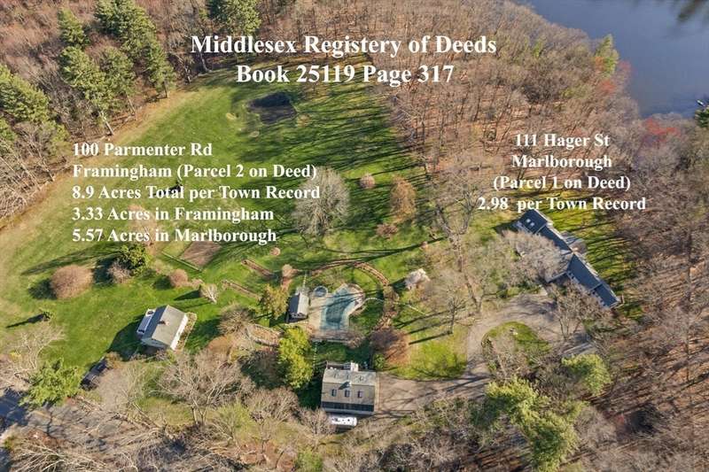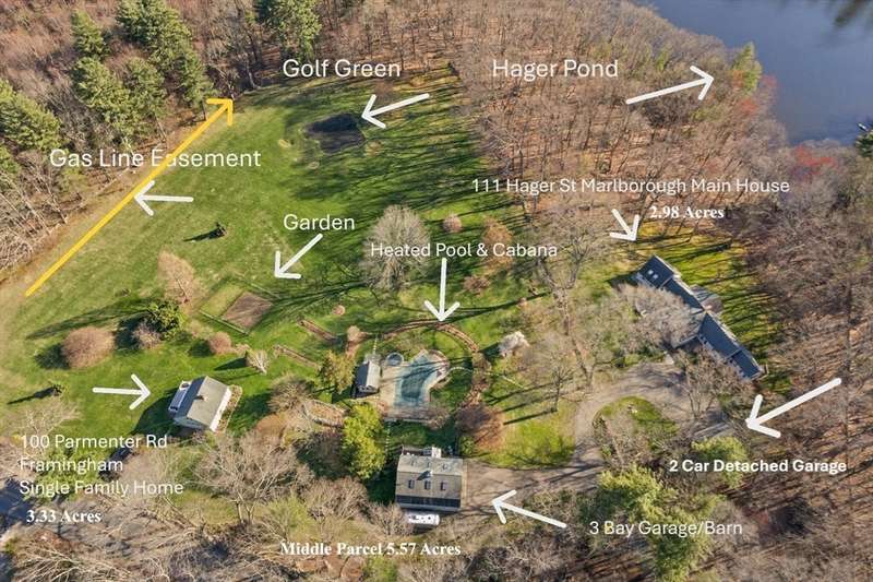 Spectacular waterfront estate presents a perfect opportunity for multi-family, multi-generational living or added income. Totaling almost 12 acres, with approximately 9 acres in Marlborough and 3+ acres in Framingham, this well-maintained property has been preserved by the same family for over 60 years. The main residence is a stylish ranch featuring high-quality finishes over 4000 sf of living, with 4 bedrooms, 4 baths, an incredible primary suite with vaulted ceiling and glorious waterfront views of Hager Pond. A Cape Cod style guest cottage is perfect for in-laws, au-pair, visiting guests or rental income. The cottage offers easy one level living with 1 bedroom, a den, a kitchen, full bath w/laundry & 2nd level unfinished walk-up attic and more spectacular views. Set between the two homes, is a gorgeous in-ground renovated swimming pool, jacuzzi, cabana, garden, golf green with 3 tee boxes & large 3-bay utility garage/barn w/oversized doors. New 4 Bed Septic! Simply remarkable!