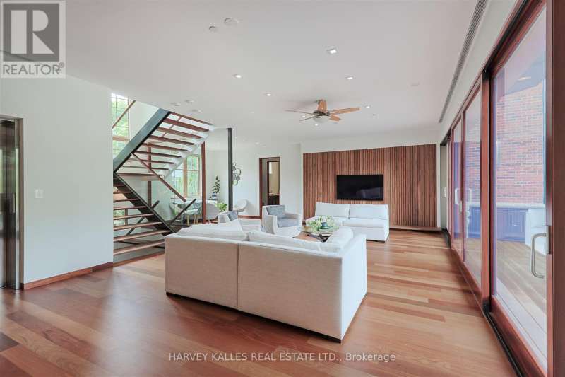 Discover a gem, custom-built as a multi-generational home, offering over 11,000 sq ft of luxurious living space on a rare 125ft double lot at the edge of the Humber Valley in the tree-lined Kingsway neighbourhood. This residence is a statement of contemporary elegance and sophistication, perfect for the discerning family.Inside, experience clean lines and exquisite details that enhance comfortable luxury living, including sound-isolated suites, Jatoba hardwood floors, stunning Persian serpentinite kitchen countertops, and heated stone floors for ultimate comfort.Accessibility is a key feature, with snow melt for the front porch, steps, ramp and driveway, a commercial 4x6 ft elevator, and 4 ft wide hallways to ensure effortless movement throughout the residence.The ground floor features a bright, open-plan living area that seamlessly integrates the chefs kitchen, dining, and living spaces, extending to a partially covered upper deck with a 17ft wide opening. A heated 3-car garage is cleverly positioned at the side of the house.The primary retreat is where luxury meets tranquility, featuring two generous walk-in closets and two ensuites one complete with a massage room and whirlpool tub offering tree-top views. Two additional spacious bedrooms, each with walk-in closets, share a thoughtfully designed bathroom suite with dual sinks, ample storage, and a separate area for added privacy. The oversized fourth bedroom also includes its own ensuite bathroom and walk-in closet, providing comfort and convenience for family or guests.The ground floor bedroom suite with a Juliet balcony offers a perfect retreat for guests.Venture to the finished lower level, where 10+ ft ceilings create a light and airy ambiance.This expansive space features a wide sliding door leading to the lower deck, ideal for entertaining.With multiple entertainment areas, including a stepped home theatre and sprawling park-like backyard, this home is designed for those who appreciate spacious comfort. (id:6370)