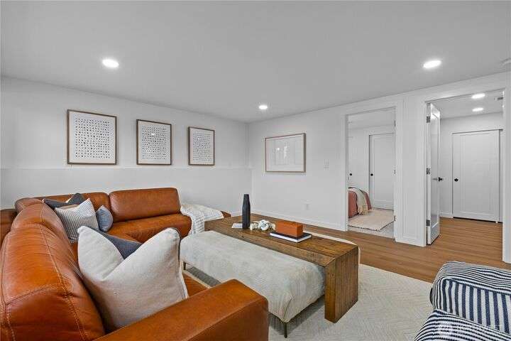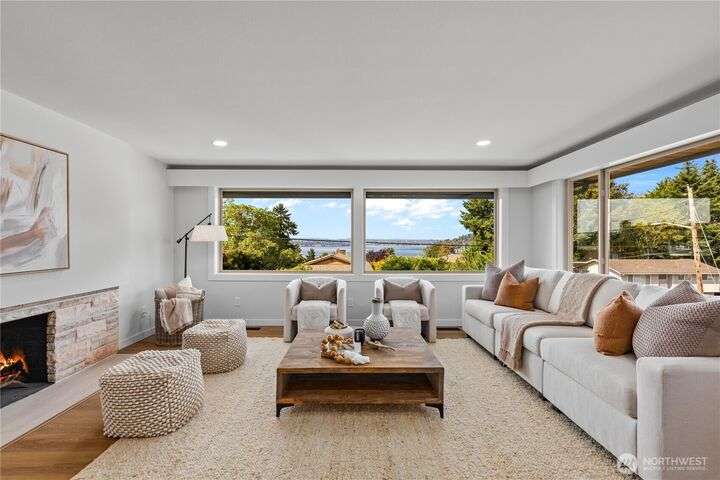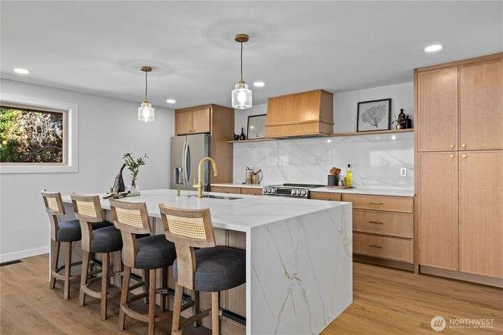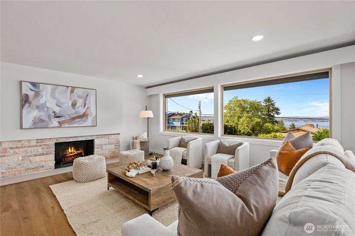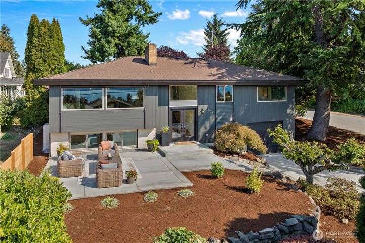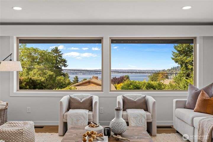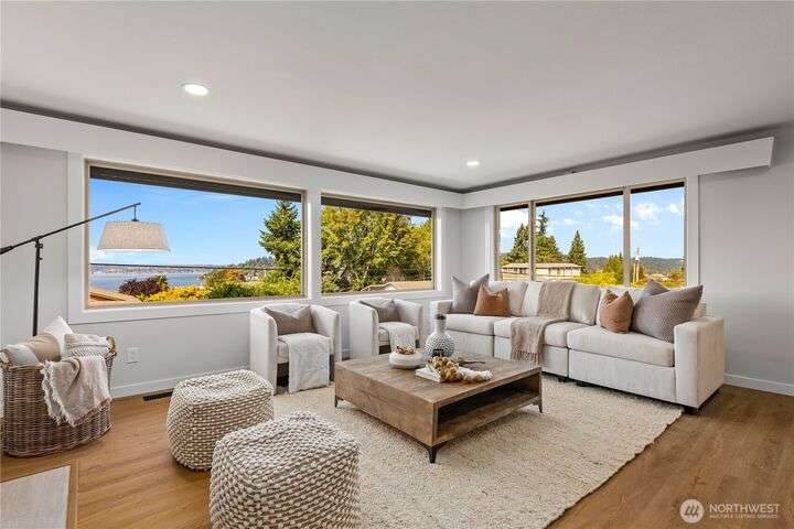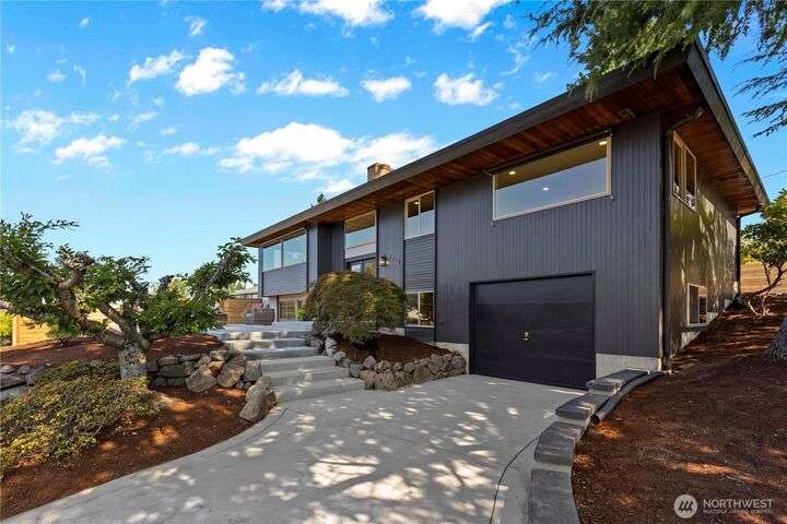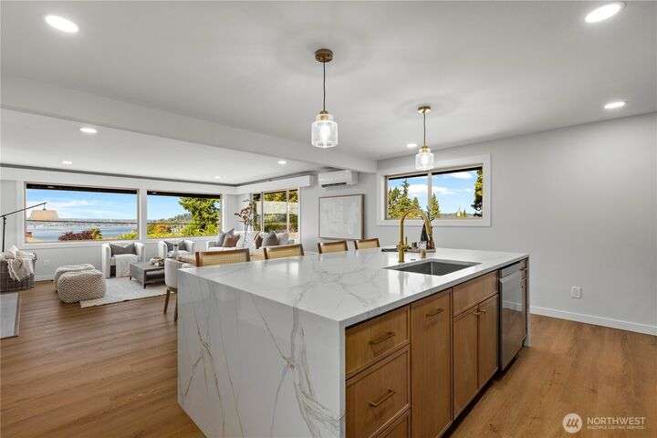 Stunning studs-out remodel in desirable Lower Kennydale! This 4 bed, 3 bath home with bonus & office lives like new. Gorgeous kitchen with waterfall island, custom cabinets, slab backsplash, walk-in pantry & beverage fridge. Great room showcases incredible views of Bellevue, Lake Washington & the Olympics. Primary suite offers spa-like bath, walk-in shower, dual sinks, views & huge walk in closet. Flexible layout offers one-level living option plus basement with oversized rec room, laundry room, office, 2 bedrooms & 3/4 bath. Two driveways, 26' deep hobby garage, oversized patio with water views & new privacy fence. Huge corner lot with DADU potential—this one truly has it all! New electrical panel, new furnace / AC, new windows, and more!