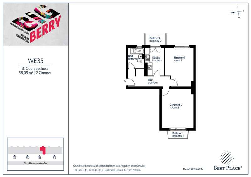 Your investment in the centre of trendy Kreuzberg: with this efficiently designed 2-room flat, you are investing where young people, professionals and families want to live. The flat with approx. 58 sqm is located on the 3rd floor of the six-storey residential building. It has a lovely balcony facing east towards the inner garden courtyard. The bathtub in the bathroom provides a wellness feeling. The practical layout and size of the flat make it ideal for singles or couples. Our sought-after investment project Big Berry offers investors solid rented flats in one of Berlin's most sought-after neighbourhoods. The six-storey residential building with four storeys was built in the 1950s and a new top floor was added in 2023. It has 76 flats with one to four rooms and approx. 26 to 108 m². A lift was added as part of the loft extension, which also benefits the existing flats. Big Berry also includes an idyllic garden courtyard and 17 car parking spaces.
