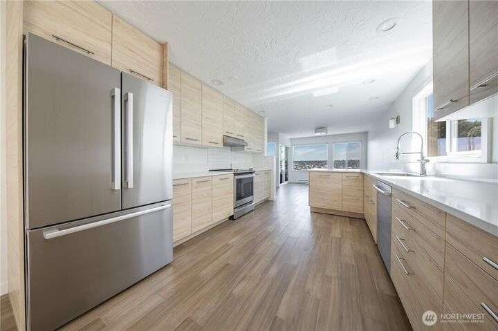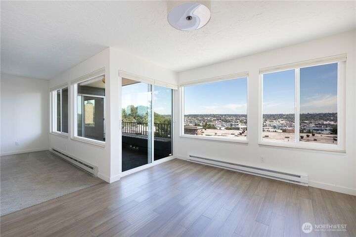Views and more views! Top floor, penthouse apartment in a nicely updated and well kept building. Enjoy private deck overlooking the Ballard Bridge and Magnolia or use of a private pool as part of the amenities. Great open entertainment kitchen and master suite with walk in closet. Both garage parking, separate storage, and in-unit washer/dryer! To be considered, future tenant must have credit over 625 and monthly income of 3 times the rent. No past delinquent rent payments/no past evictions or eviction notices.