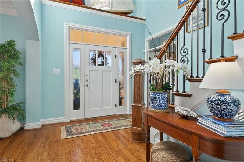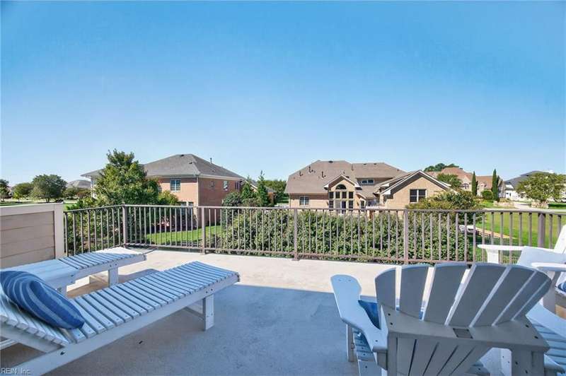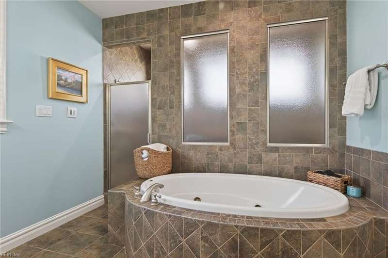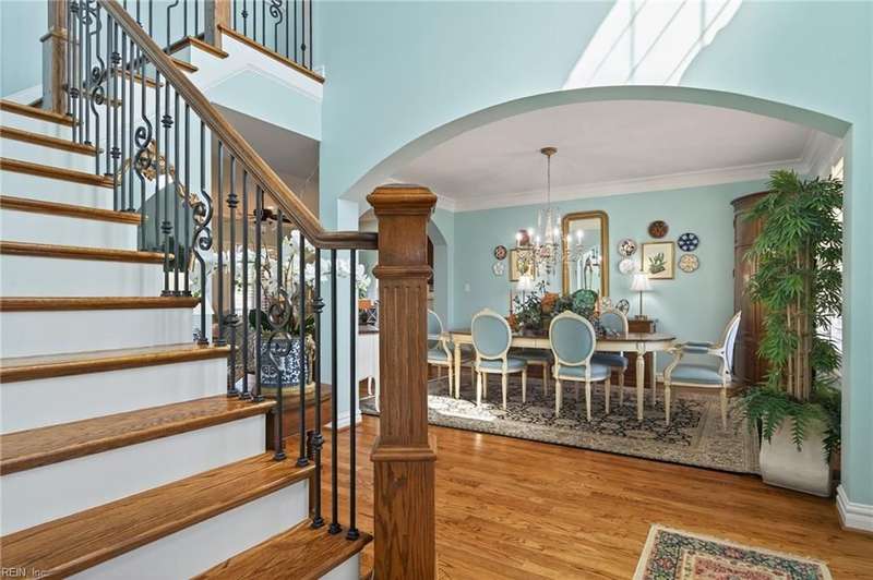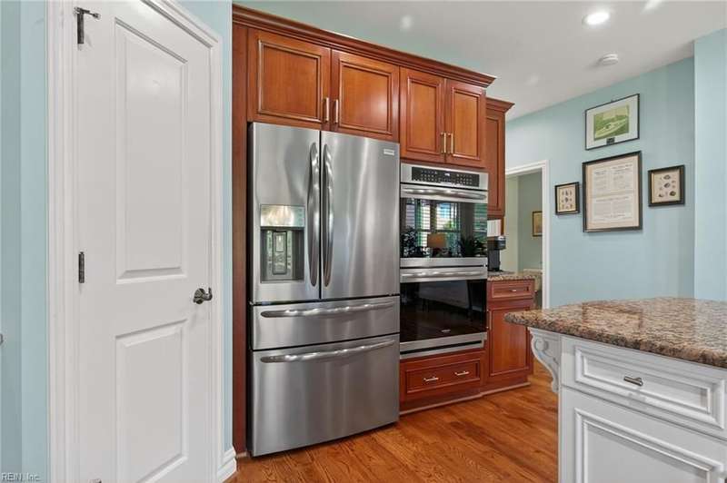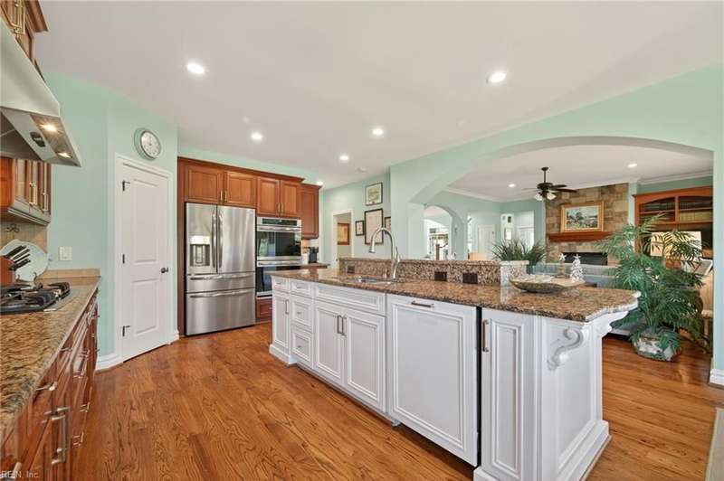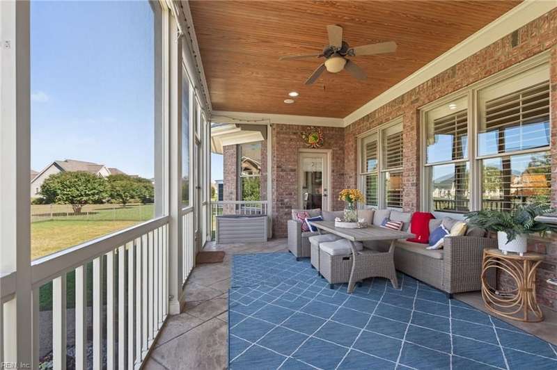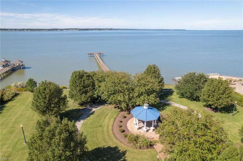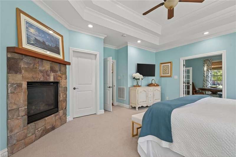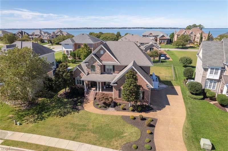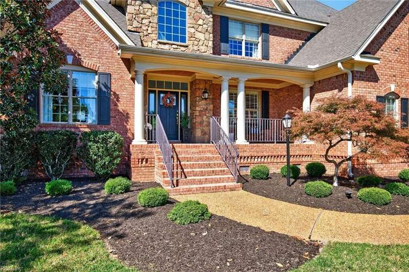 Stately brick and stone home in The Riverfront featuring timeless design, elegant finishes, and exceptional craftsmanship. Grand two-story foyer opens to refined living spaces with hardwood floors, updated lighting, & plantation shutters. The gourmet kitchen includes granite countertops, a freshly painted island, corner pantry, and premium stainless-steel appliances, flowing into a warm living room with gas fireplace and custom built-ins. The first-floor primary suite offers a tray ceiling, fireplace, dual walk-in closets, & ensuite bath w/new quartz countertops, oversized double shower, & jetted tub. Ideal for entertaining with a wet bar, screened porch, and an upstairs rec room leading to a west-facing deck for sunset views. Custom millwork, crown molding, arched doorways, and abundant storage throughout. Beautifully maintained landscaping, minutes from the park and pier on the Nansemond River, w/access to golf, trails, & resort-style community amenities. 1 year 2-10 Home Warranty